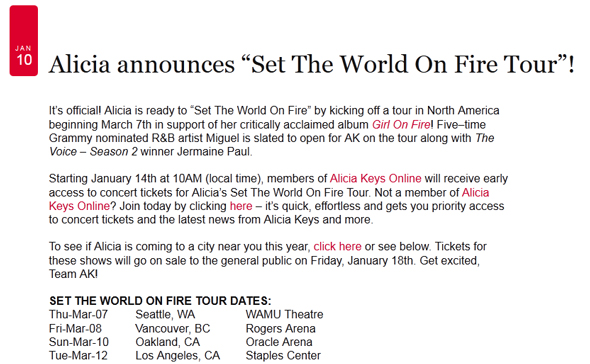 Back in November, we reported on the news of the Alicia Keys 2013 Summer tour of Europe and England in support of her latest and fifth studio album, Girl On Fire, which went on sale late last year. The Grammy Award-winning artist has now announced a North American leg of the same tour, which will take place in March and April, and has been dubbed the Set The World On Fire Tour”. Full details can be found on her site, www.AliciaKeys.com, with links to buy tickets for all venues: