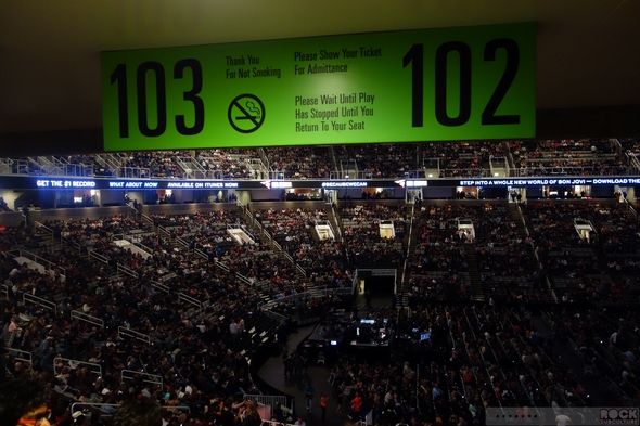 As noted, HP Pavilion is a massive indoor sports arena. I had purchased a floor seat in row 18 ages ago, and funny enough, by the time I made my way on foot from overflow parking, got through the crowd to the floor, and squeezed my way through the very narrow row to my seat, I never had an opportunity to sit in it, as the lights dropped and show started as soon as I got there, as if on cue.