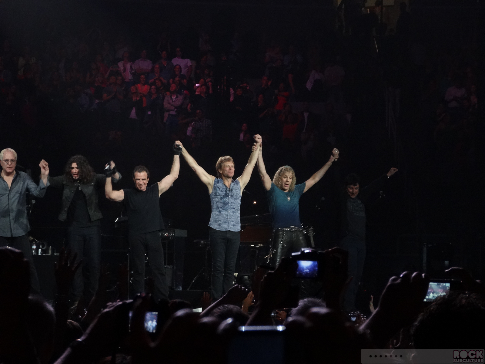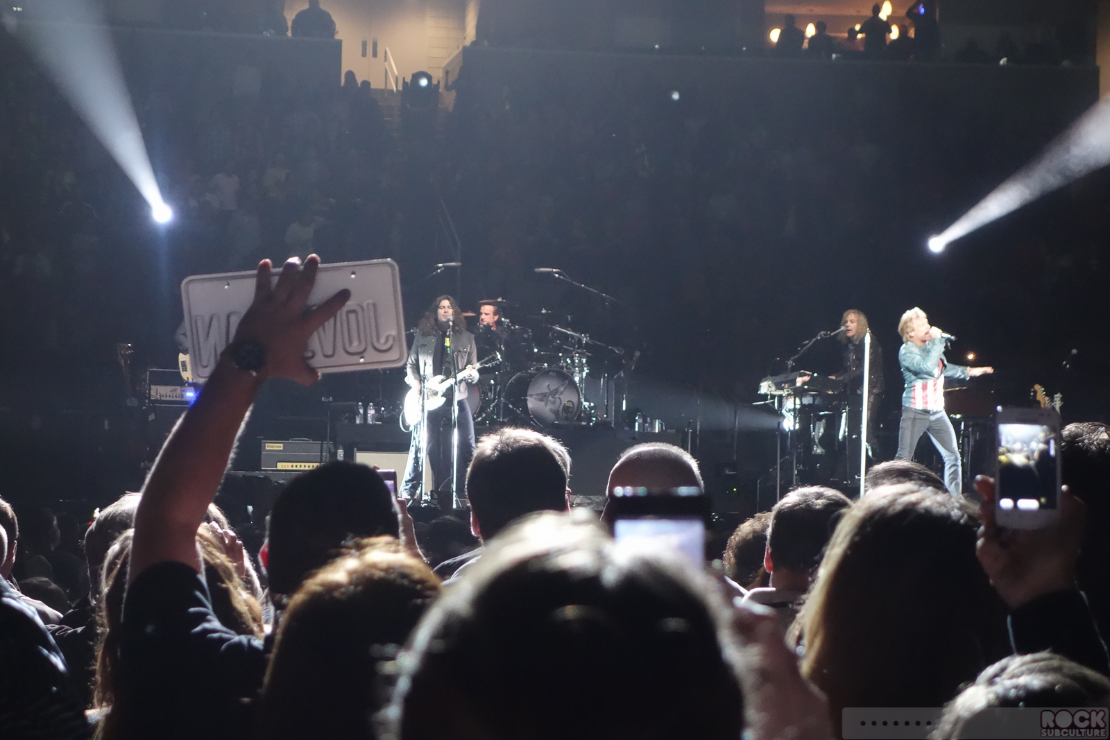 With pretty much every show I’ve been to at HP Pavilion, they have employed the jumbo monitors up and on either side of the stage, to help those in the very back have an improved experience and better see what is happening on stage, while hearing the live music from far away. For whatever reason, that was not the case with Bon Jovi last night… so those in the back were left to make do with seeing the relatively tiny figures on stage as just that… Everyone was tiny for me even at Row 18… And strangely, there were multiple video cameras on the floor recording the entire show, just not the benefit for those who purchased tickets and turned out for it. At the time, I guessed that maybe they were recording it for a possible DVD/Blu-Ray/broadcast from a compilation of shows on the tour. But as I prepared this article, I learned that the first 30 minutes of the show was broadcast on the Internet for free… and paying members of the Bon Jovi fan club could watch the rest. Again, not to be so completely jaded, but everything about this tour seems to be about maximizing the generation of cash. Which is fine – it is a business – but I just feel like something has been lost with this focus on profit over genuine experiences, rather than pre-packaged and very expensive “VIP Experience Packages”.