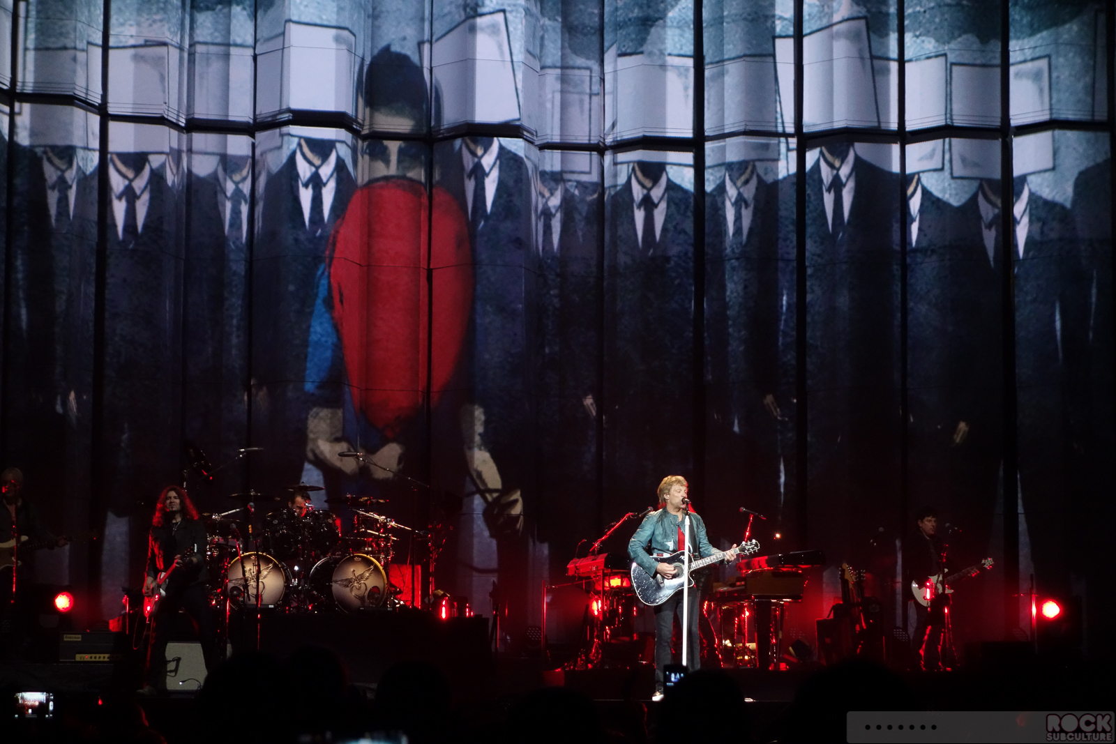 A lot of resources were put into the lighting, and rising and lowering pillars behind the stage which had mostly cartoons and animation projected onto them. The funny thing is, before that part of the show kicked off, I was kind of surprised that they sold tickets behind the stage at all, which I generally don’t see in these big sports arena shows because they are basically left looking at the backs of the performers. But then when the screens began to rise and fix in place – at times blocking 100% of the view for those fans behind the stage – I was even more shocked by the decision to sell those seats. Maybe they were the $13 Groupon seats… I don’t really know. During one song Jon Bon Jovi walked on those pillars and gave them some fan service, but that was just one song. For the majority of the show, they were looking at the backs of the band or the wall (in whole or part).