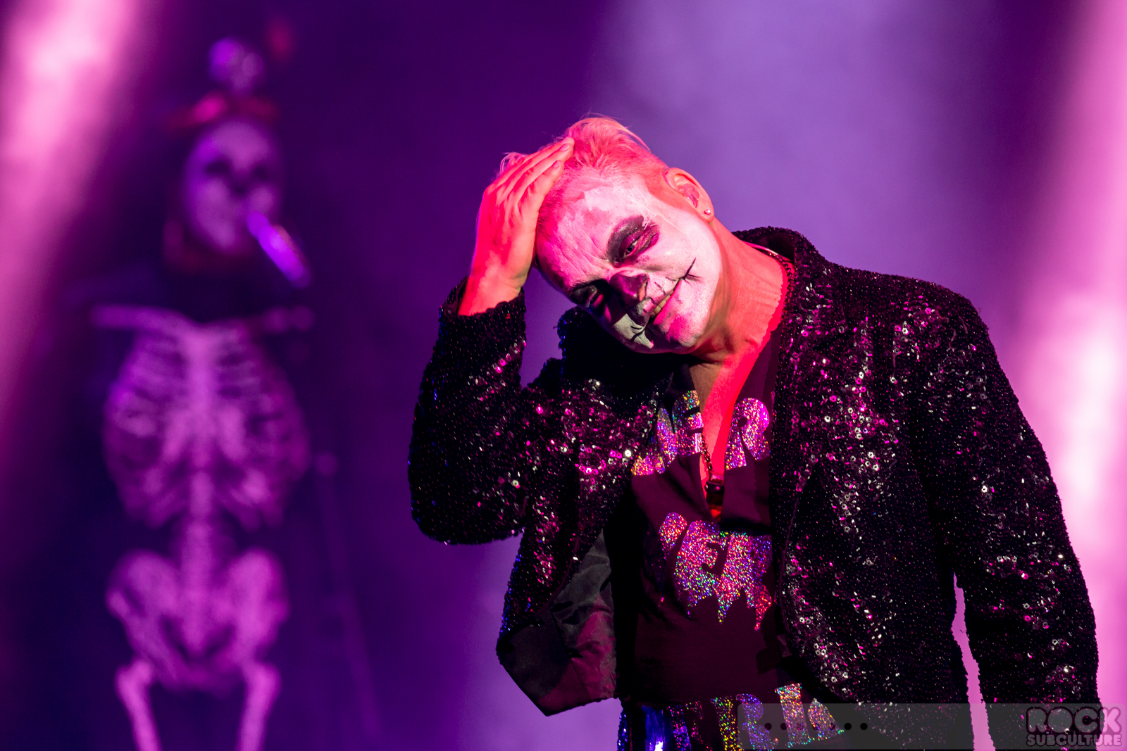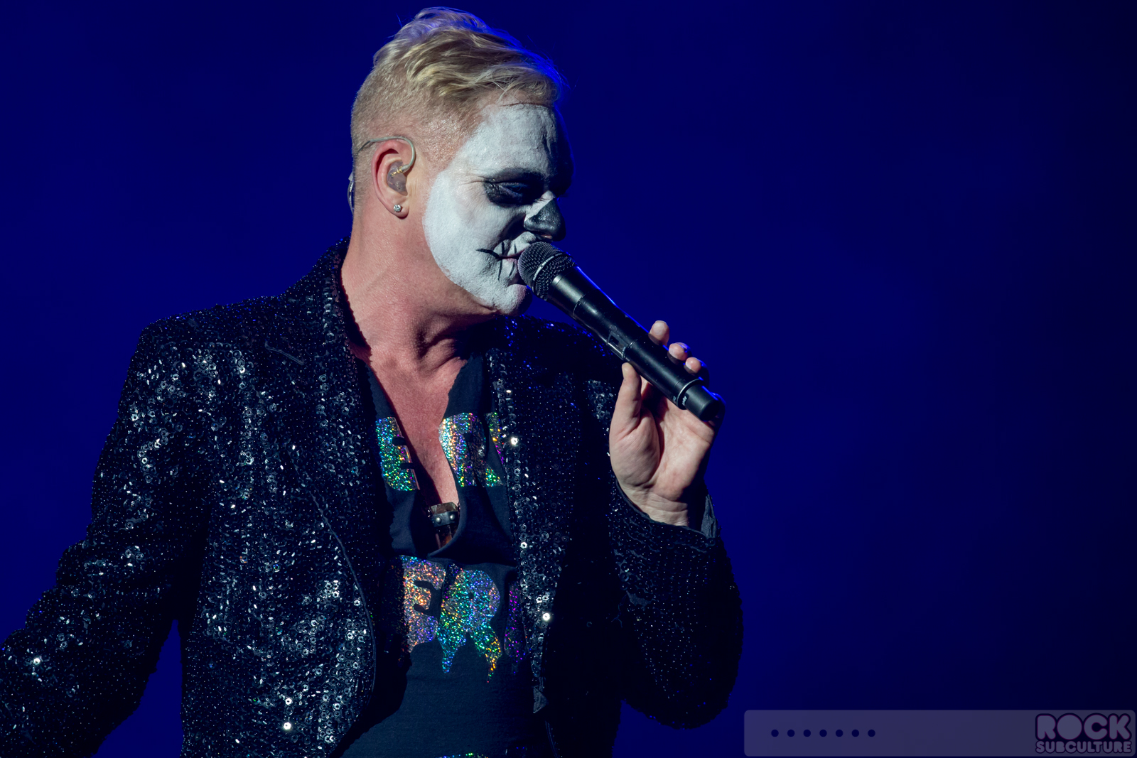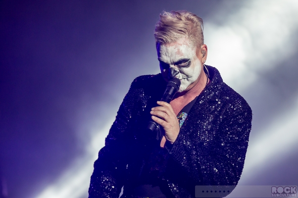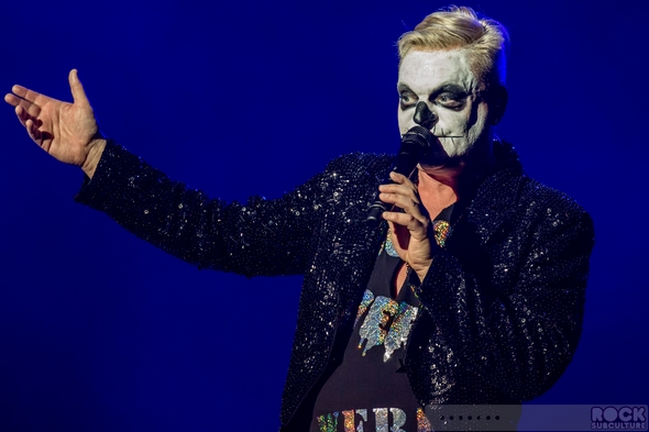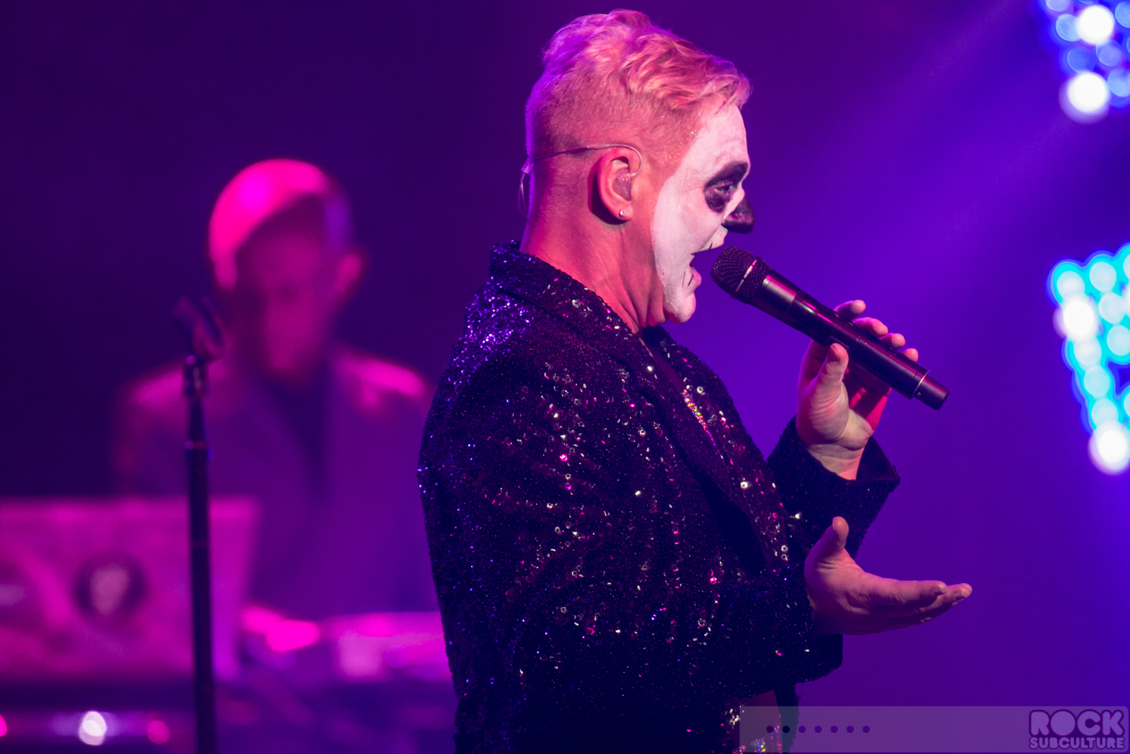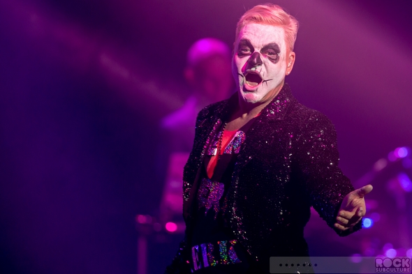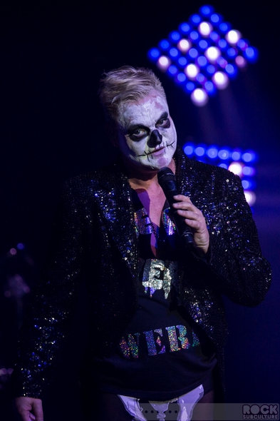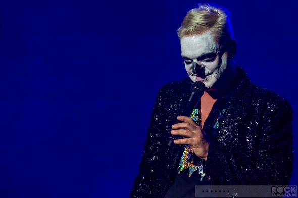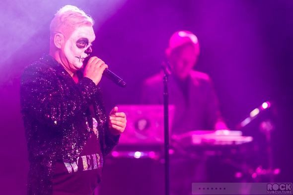 “Halloween is so brilliant though, isn’t it? ‘Cause everyone can dress up; be what they want to do… nobody is like judging you at all for how you look or anything or what you’re doing or who you’re with, blah, blah, blah …” Andy Bell of Erasure on Halloween at the Pearl Concert Theater at Palms Casino Resort in Las Vegas. Certainly an interesting combination of band, date, and city to be sure. As the more extroverted of the duo, Andy came dressed in a sort of skeleton costume with accompanying face paint that has some resemblance to the cover art of their latest album; Vince Clarke, set back from the front of the stage and back to one corner, I don’t think said anything all night, and was dressed in more business-style attire (though he had the aforementioned art one his laptop lid. However the two contrasting personalities found one another for their journey into music that has gone on for nearly three decades, the magic worked in the beginning and continues to do so today. This was definitely an interesting (in a great way!) night on many levels. I had an opportunity to meet Vince Clarke and Andy Bell from Erasure via the special tickets made available through their PledgeMusic campaign for that newest latest album, The Violet Flame. The aptly named Violet Flame Tour included a number of those new songs mixed into the set, as well as a lot of their many, many hits and favorites. I got the sense that it was a different sort of show for this series of shows, and I’m happy that I got a chance to experience this new music and tour.