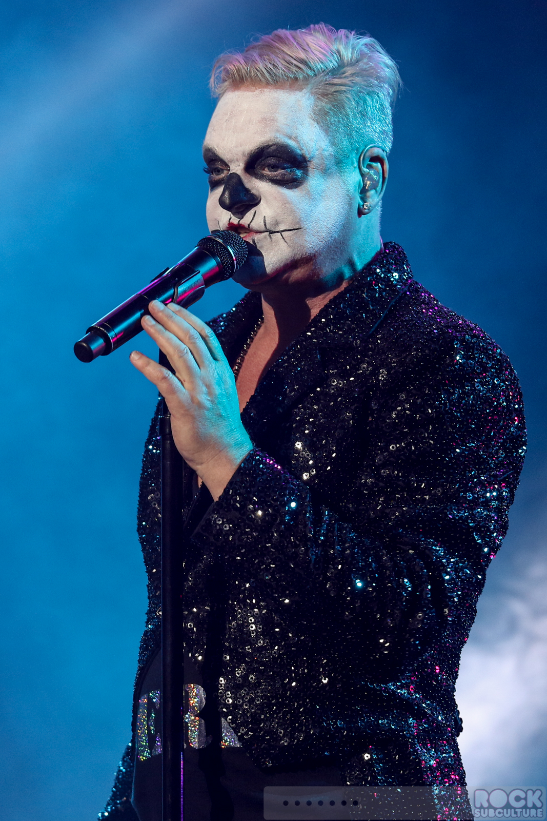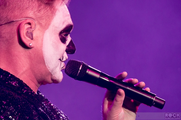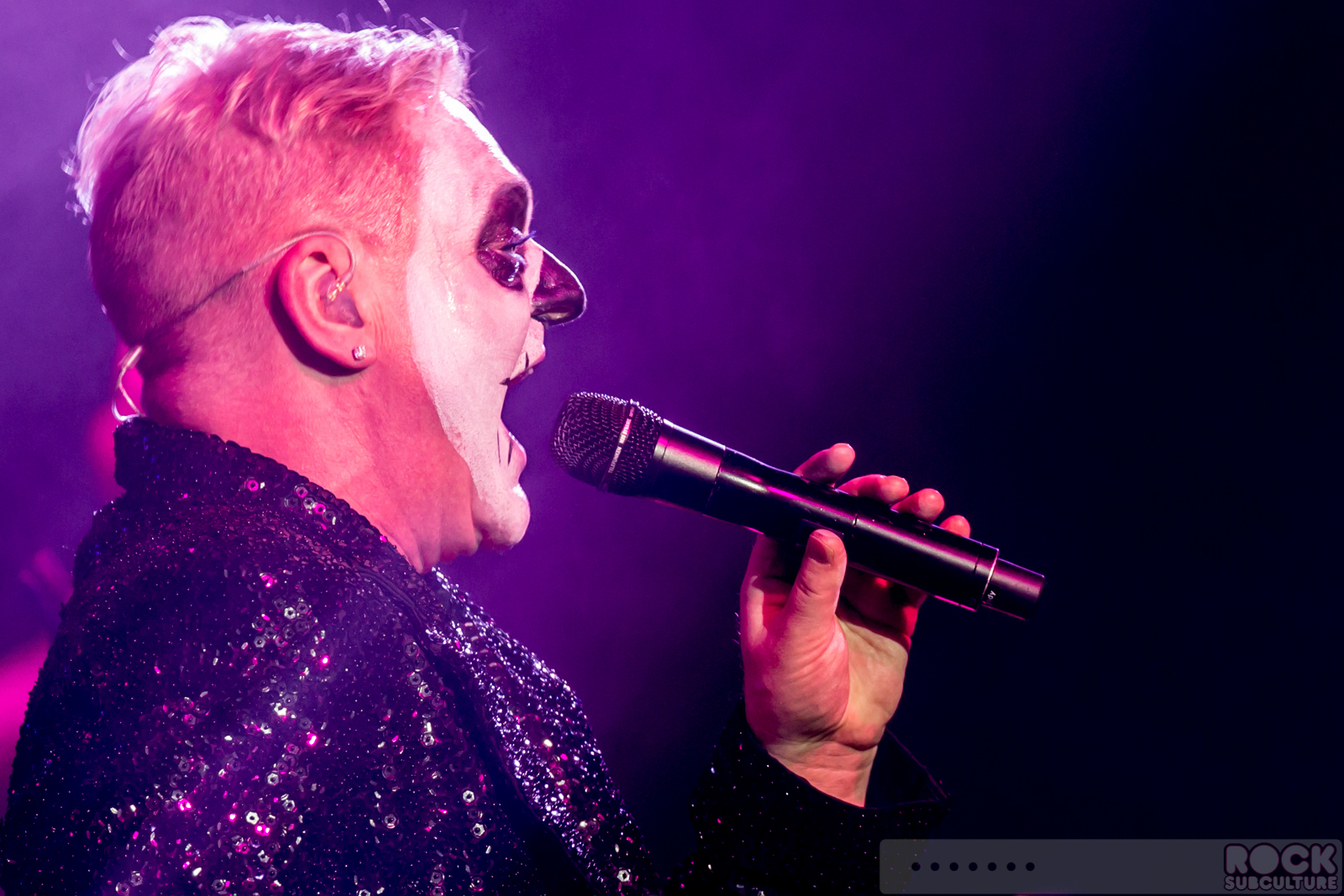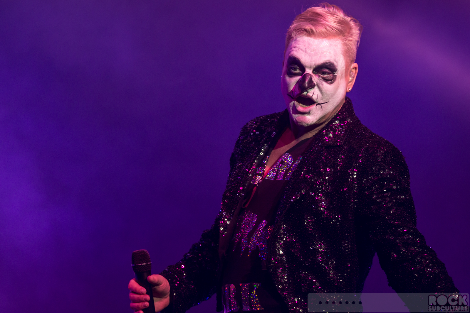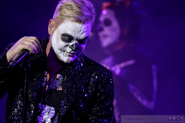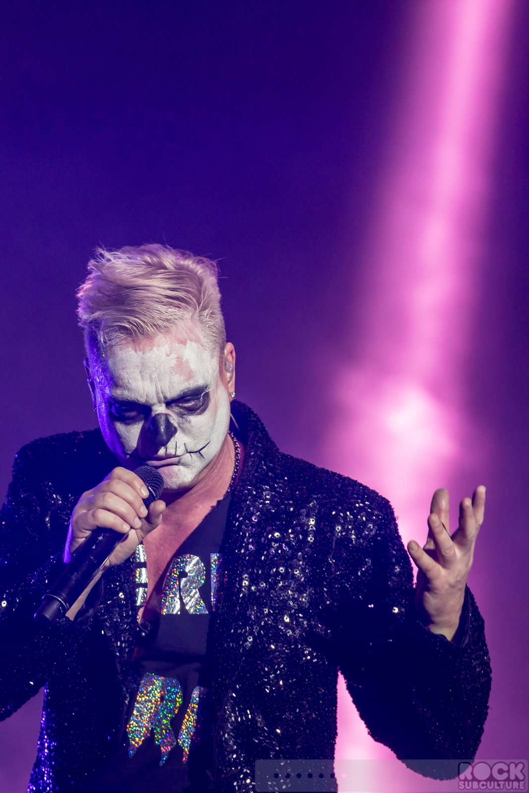 “Halloween is so brilliant though, isn’t it? ‘Cause everyone can dress up; be what they want to do… nobody is like judging you at all for how you look or anything or what you’re doing or who you’re with, blah, blah, blah …” Andy Bell of Erasure on Halloween at the Pearl Concert Theater at Palms Casino Resort in Las Vegas. Certainly an interesting combination of band, date, and city to be sure. As the more extroverted of the duo, Andy came dressed in a sort of skeleton costume with accompanying face paint that has some resemblance to the cover art of their latest album; Vince Clarke, set back from the front of the stage and back to one corner, I don’t think said anything all night, and was dressed in more business-style attire (though he had the aforementioned art one his laptop lid. However the two contrasting personalities found one another for their journey into music that has gone on for nearly three decades, the magic worked in the beginning and continues to do so today. This was definitely an interesting (in a great way!) night on many levels. I had an opportunity to meet Vince Clarke and Andy Bell from Erasure via the special tickets made available through their PledgeMusic campaign for that newest latest album, The Violet Flame. The aptly named Violet Flame Tour included a number of those new songs mixed into the set, as well as a lot of their many, many hits and favorites. I got the sense that it was a different sort of show for this series of shows, and I’m happy that I got a chance to experience this new music and tour.