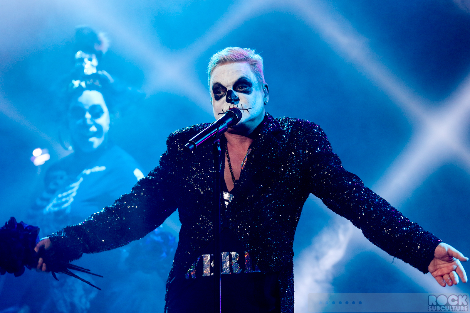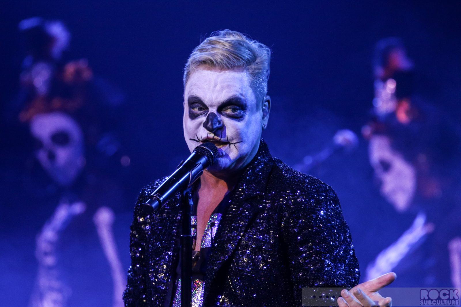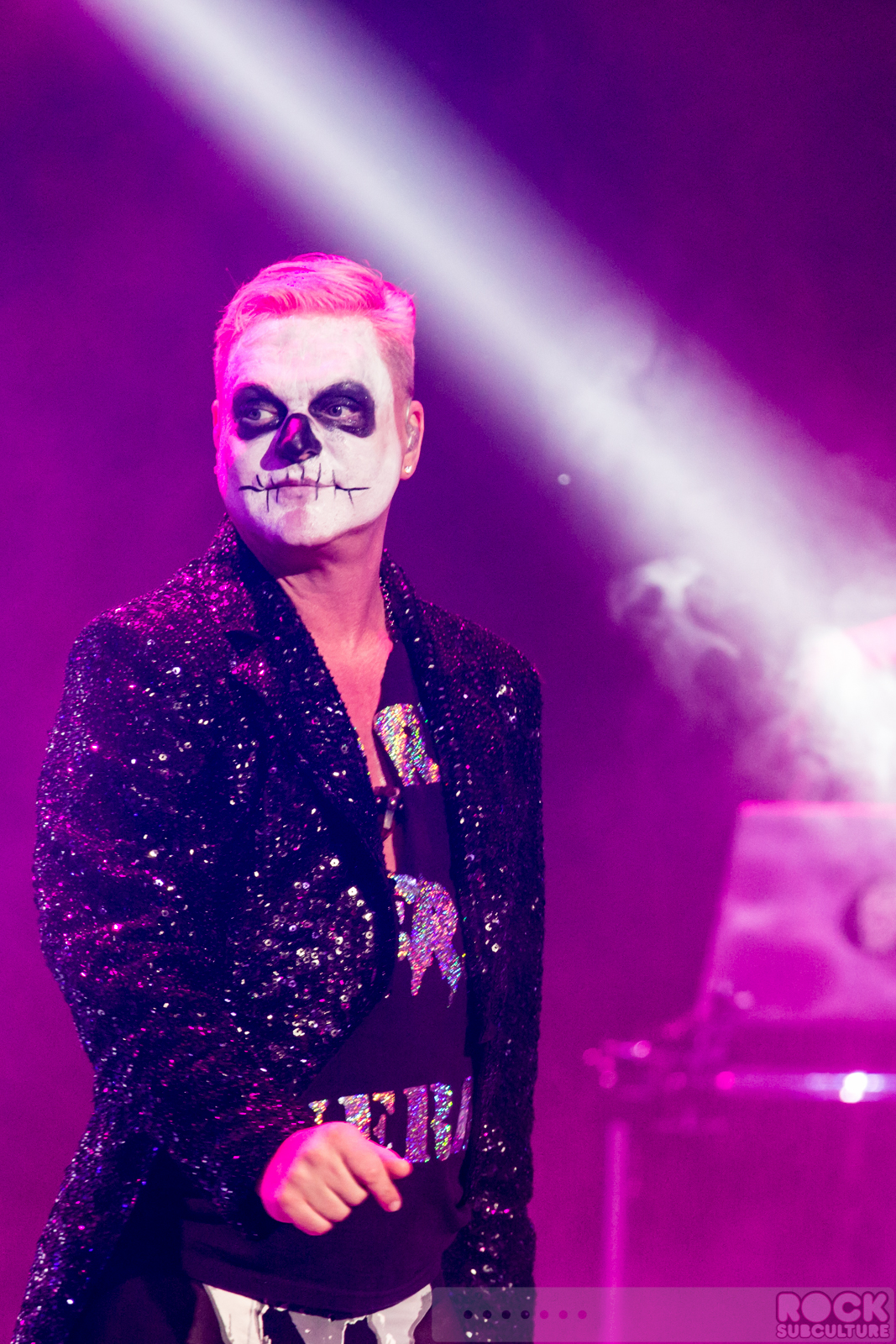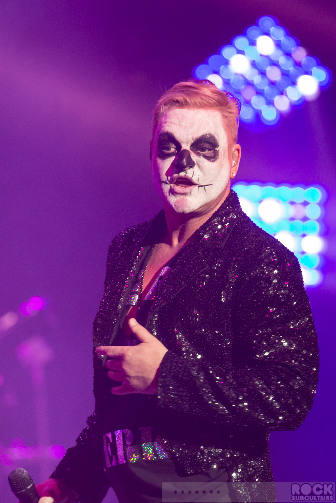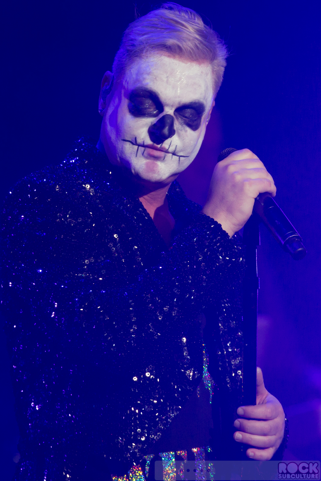 “Halloween is so brilliant though, isn’t it? ‘Cause everyone can dress up; be what they want to do… nobody is like judging you at all for how you look or anything or what you’re doing or who you’re with, blah, blah, blah …” Andy Bell of Erasure on Halloween at the Pearl Concert Theater at Palms Casino Resort in Las Vegas. Certainly an interesting combination of band, date, and city to be sure. As the more extroverted of the duo, Andy came dressed in a sort of skeleton costume with accompanying face paint that has some resemblance to the cover art of their latest album; Vince Clarke, set back from the front of the stage and back to one corner, I don’t think said anything all night, and was dressed in more business-style attire (though he had the aforementioned art one his laptop lid. However the two contrasting personalities found one another for their journey into music that has gone on for nearly three decades, the magic worked in the beginning and continues to do so today. This was definitely an interesting (in a great way!) night on many levels. I had an opportunity to meet Vince Clarke and Andy Bell from Erasure via the special tickets made available through their PledgeMusic campaign for that newest latest album, The Violet Flame. The aptly named Violet Flame Tour included a number of those new songs mixed into the set, as well as a lot of their many, many hits and favorites. I got the sense that it was a different sort of show for this series of shows, and I’m happy that I got a chance to experience this new music and tour.