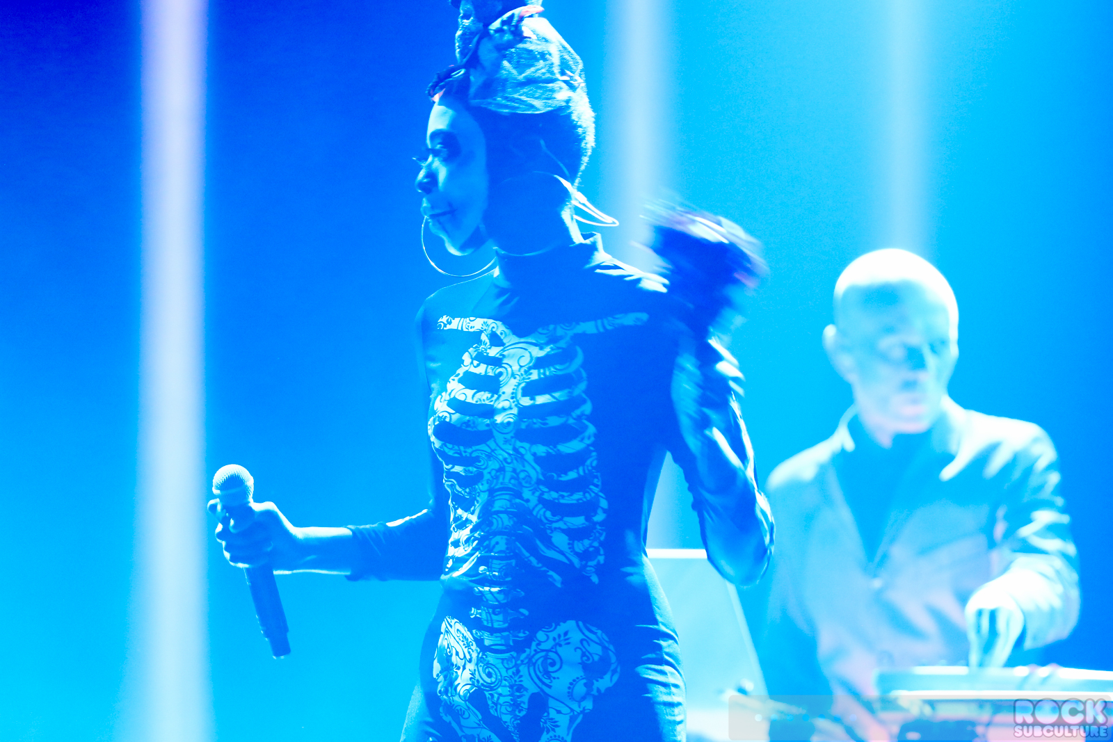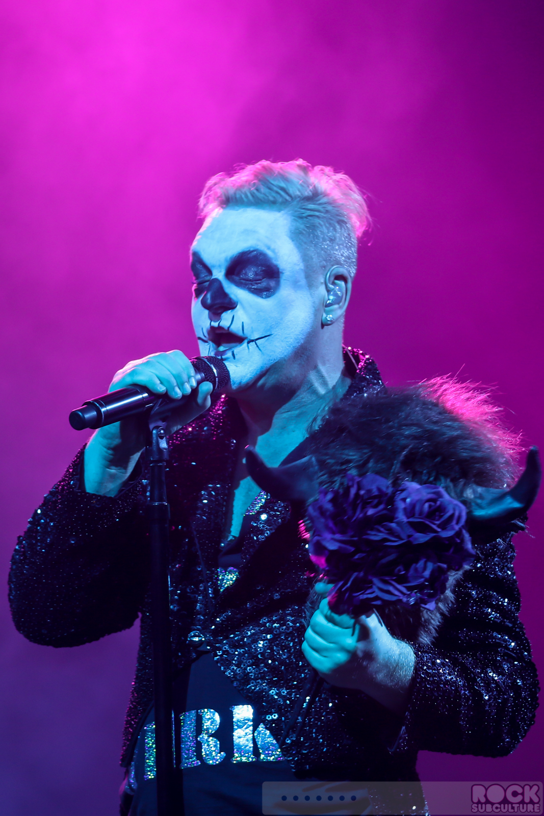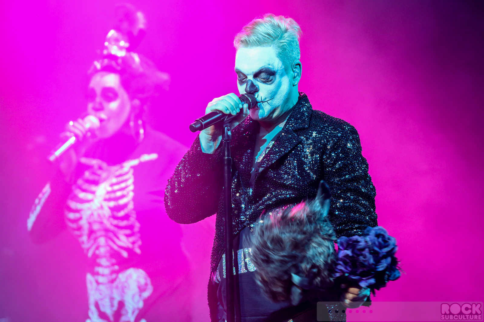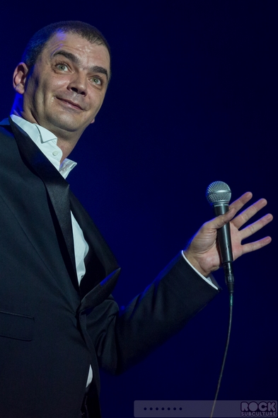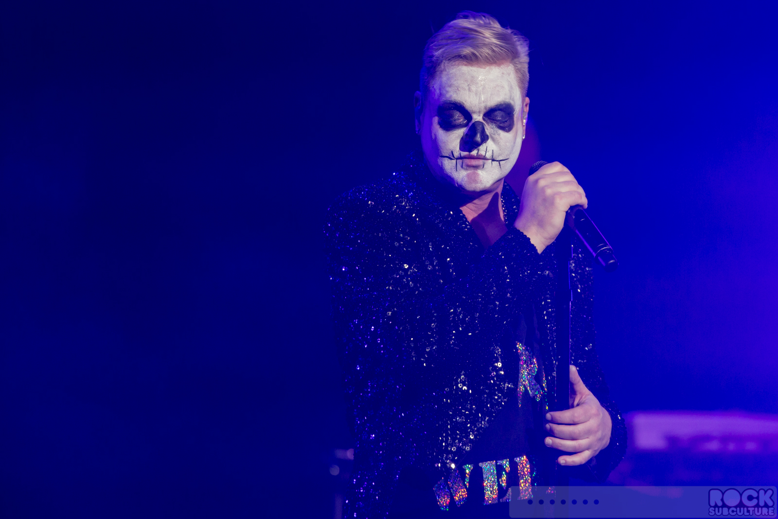 “Halloween is so brilliant though, isn’t it? ‘Cause everyone can dress up; be what they want to do… nobody is like judging you at all for how you look or anything or what you’re doing or who you’re with, blah, blah, blah …” Andy Bell of Erasure on Halloween at the Pearl Concert Theater at Palms Casino Resort in Las Vegas. Certainly an interesting combination of band, date, and city to be sure. As the more extroverted of the duo, Andy came dressed in a sort of skeleton costume with accompanying face paint that has some resemblance to the cover art of their latest album; Vince Clarke, set back from the front of the stage and back to one corner, I don’t think said anything all night, and was dressed in more business-style attire (though he had the aforementioned art one his laptop lid. However the two contrasting personalities found one another for their journey into music that has gone on for nearly three decades, the magic worked in the beginning and continues to do so today. This was definitely an interesting (in a great way!) night on many levels. I had an opportunity to meet Vince Clarke and Andy Bell from Erasure via the special tickets made available through their PledgeMusic campaign for that newest latest album, The Violet Flame. The aptly named Violet Flame Tour included a number of those new songs mixed into the set, as well as a lot of their many, many hits and favorites. I got the sense that it was a different sort of show for this series of shows, and I’m happy that I got a chance to experience this new music and tour.