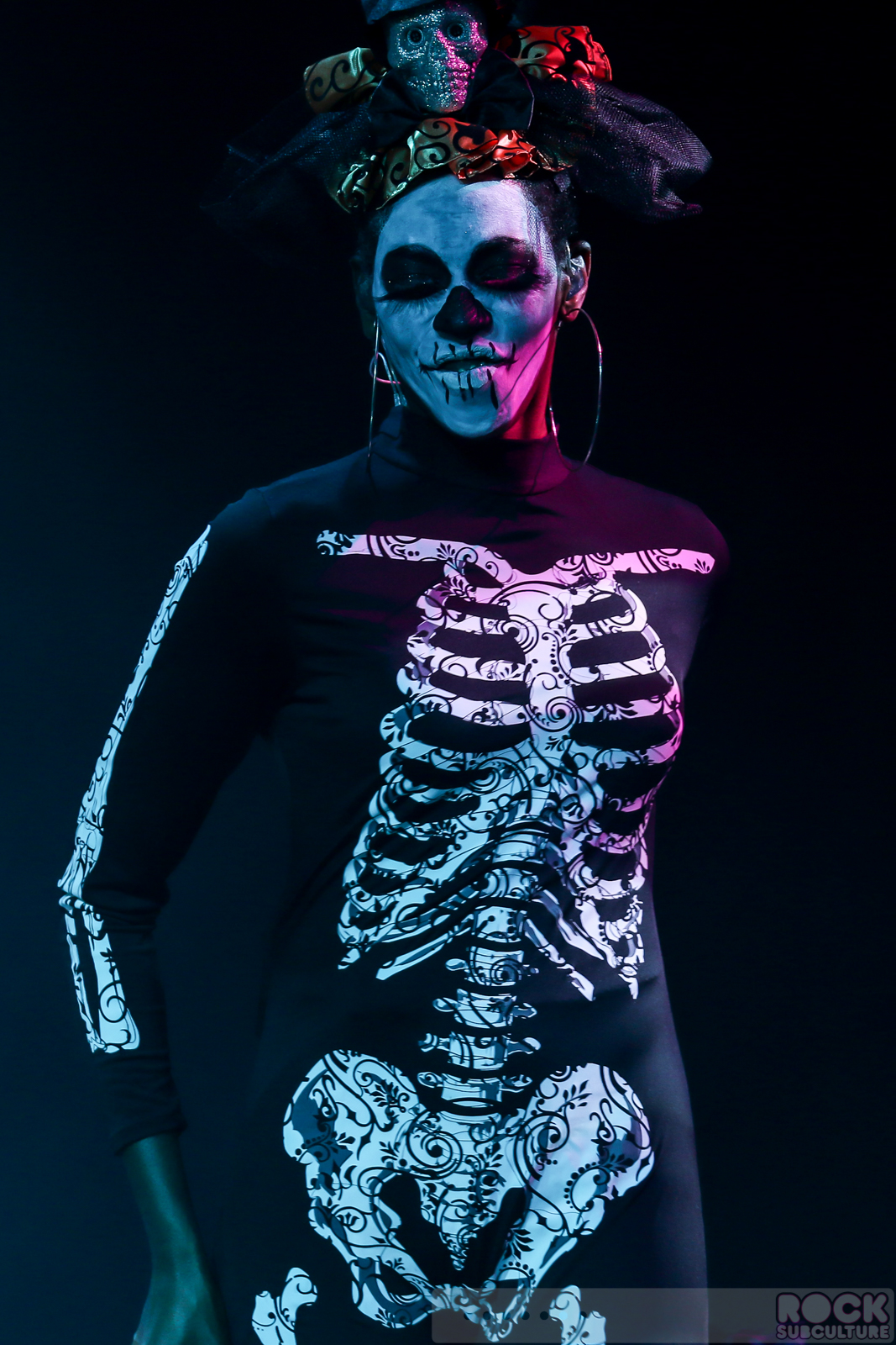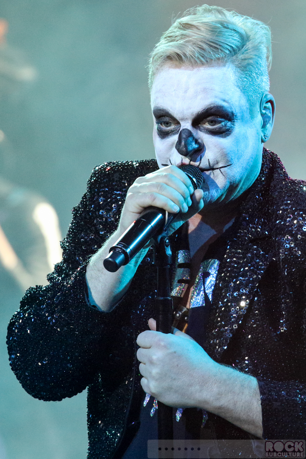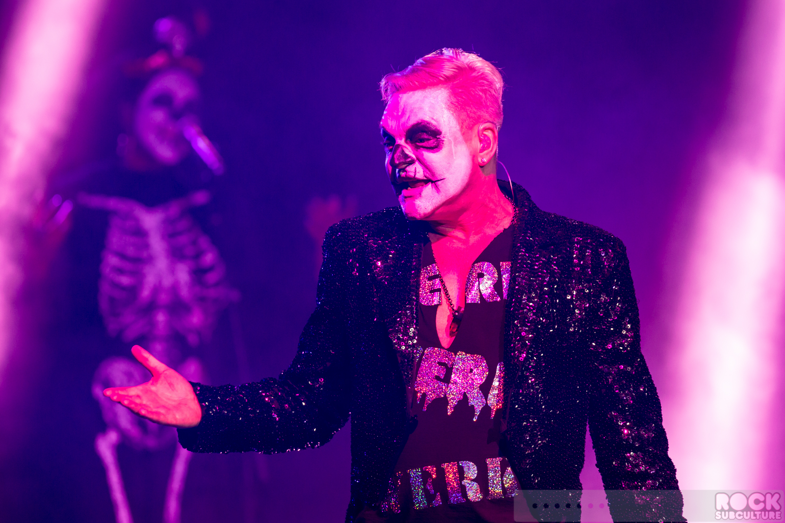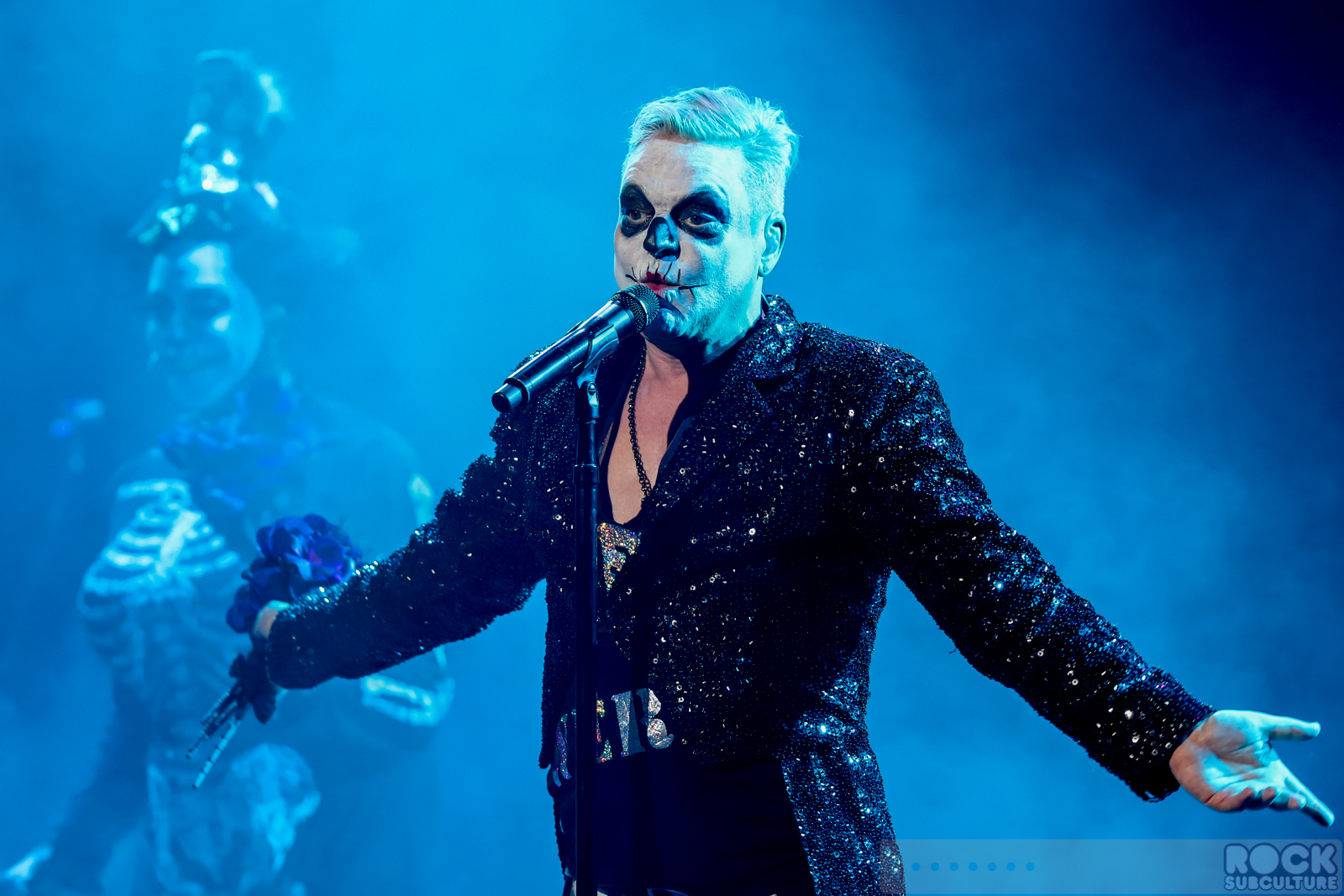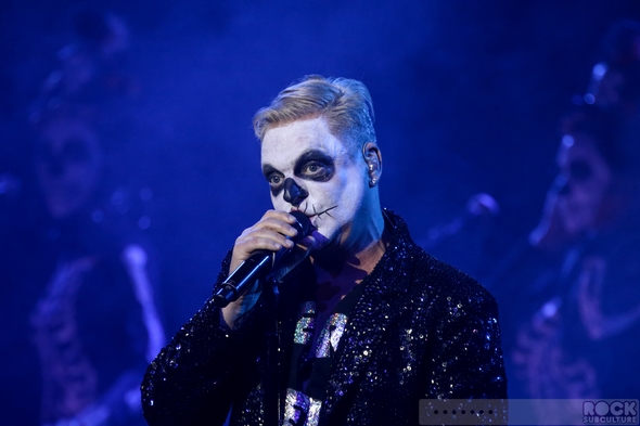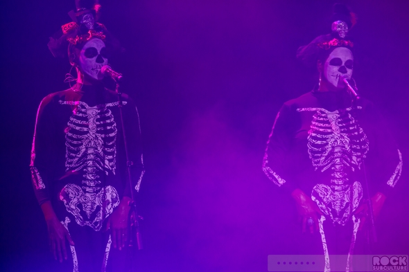 “Halloween is so brilliant though, isn’t it? ‘Cause everyone can dress up; be what they want to do… nobody is like judging you at all for how you look or anything or what you’re doing or who you’re with, blah, blah, blah …” Andy Bell of Erasure on Halloween at the Pearl Concert Theater at Palms Casino Resort in Las Vegas. Certainly an interesting combination of band, date, and city to be sure. As the more extroverted of the duo, Andy came dressed in a sort of skeleton costume with accompanying face paint that has some resemblance to the cover art of their latest album; Vince Clarke, set back from the front of the stage and back to one corner, I don’t think said anything all night, and was dressed in more business-style attire (though he had the aforementioned art one his laptop lid. However the two contrasting personalities found one another for their journey into music that has gone on for nearly three decades, the magic worked in the beginning and continues to do so today. This was definitely an interesting (in a great way!) night on many levels. I had an opportunity to meet Vince Clarke and Andy Bell from Erasure via the special tickets made available through their PledgeMusic campaign for that newest latest album, The Violet Flame. The aptly named Violet Flame Tour included a number of those new songs mixed into the set, as well as a lot of their many, many hits and favorites. I got the sense that it was a different sort of show for this series of shows, and I’m happy that I got a chance to experience this new music and tour.