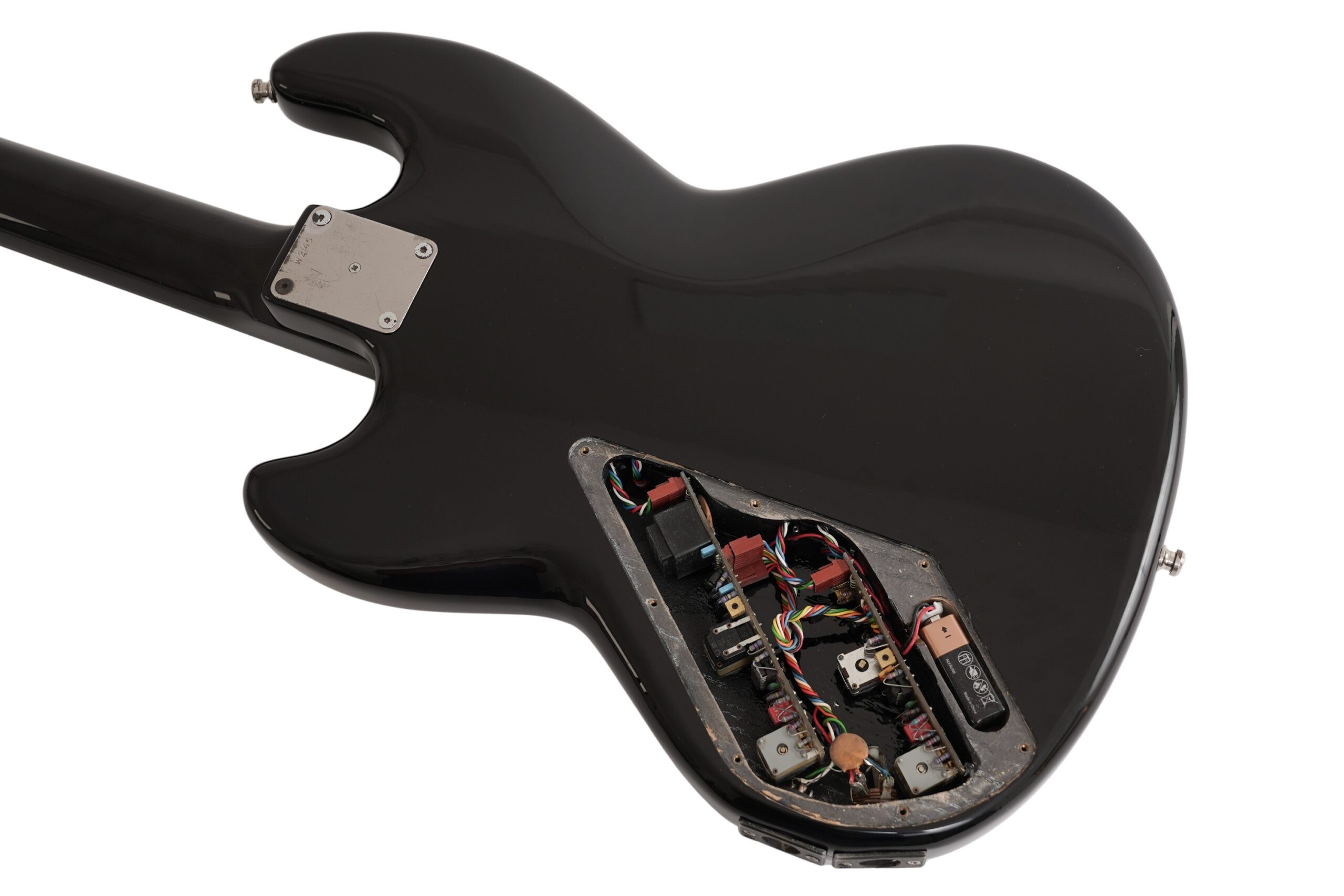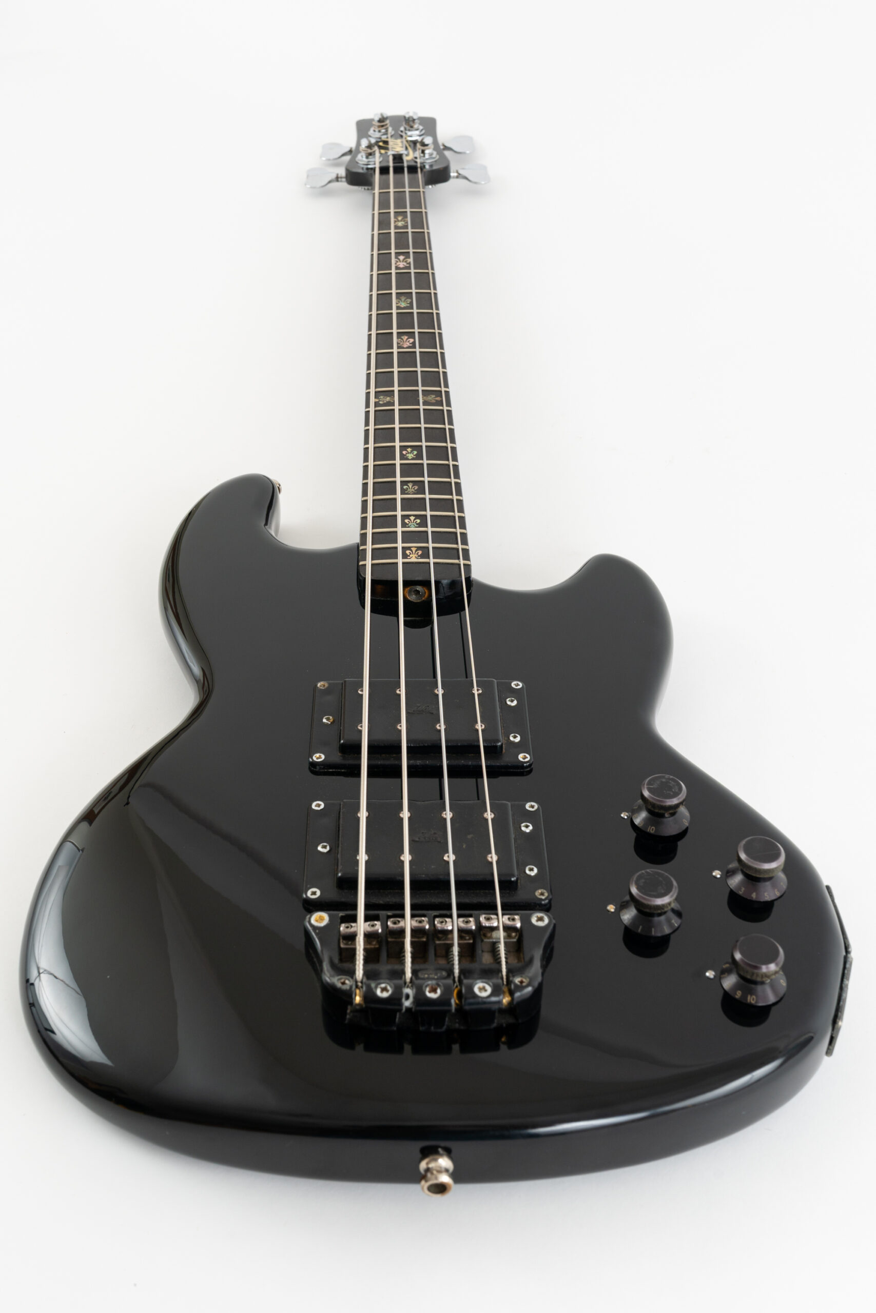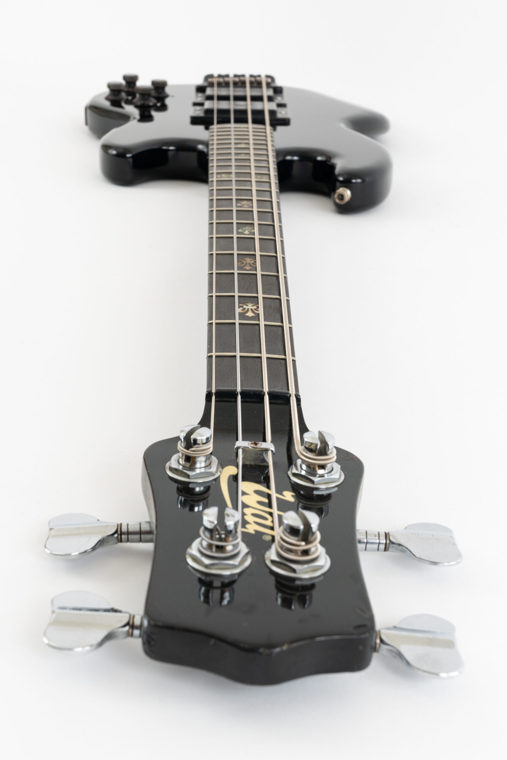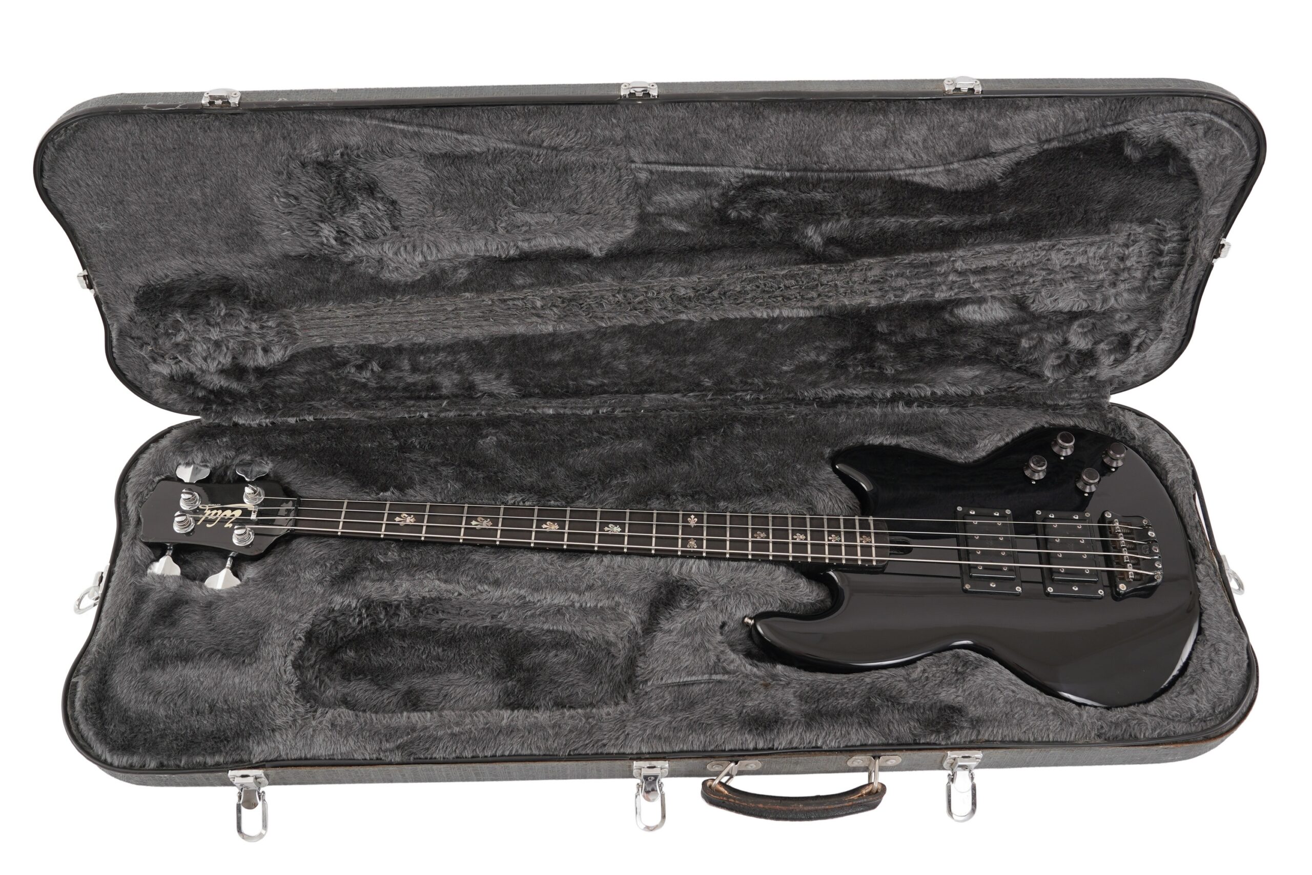 The bass documented here is a Wal Mk 1, serial number W2145, manufactured in July 1983 (as indicated by the interior label). It features an English ash body, black polyester finish, and rosewood fingerboard, with custom fleur-de-lis fretboard inlays. These inlays are a non-standard Wal feature and function as a distinctive visual identifier. The same configuration is independently recorded in the WalDataBASS registry.6