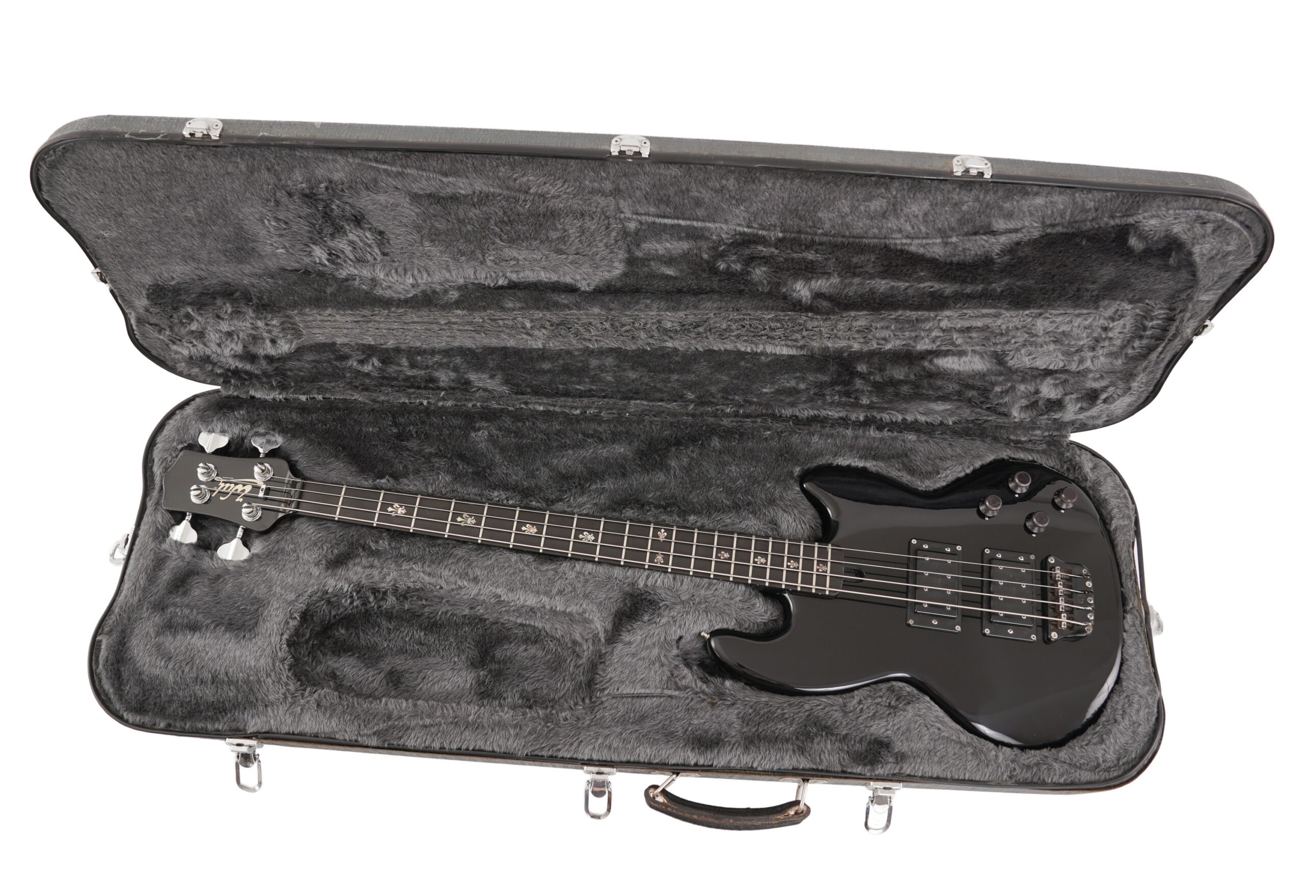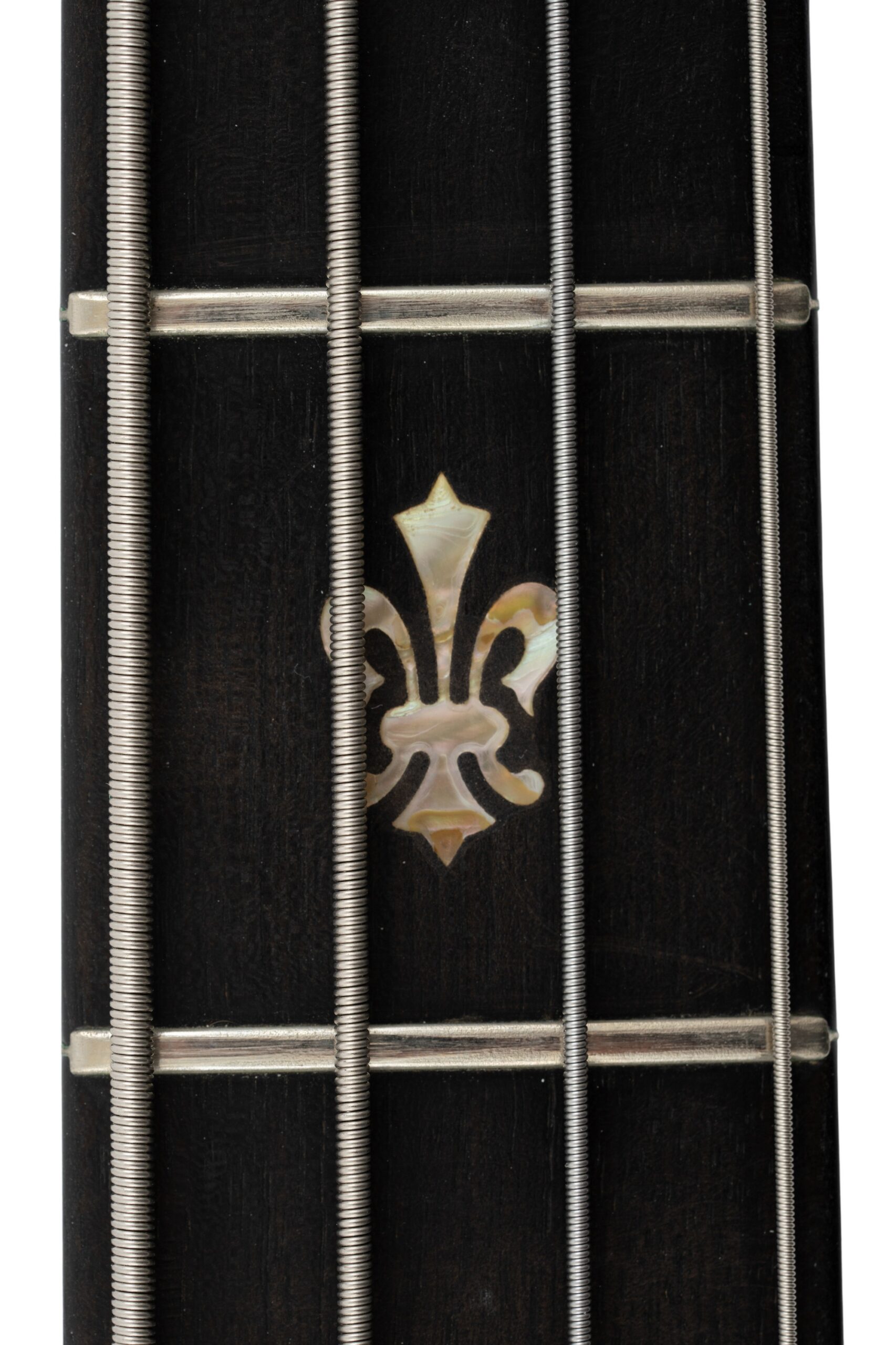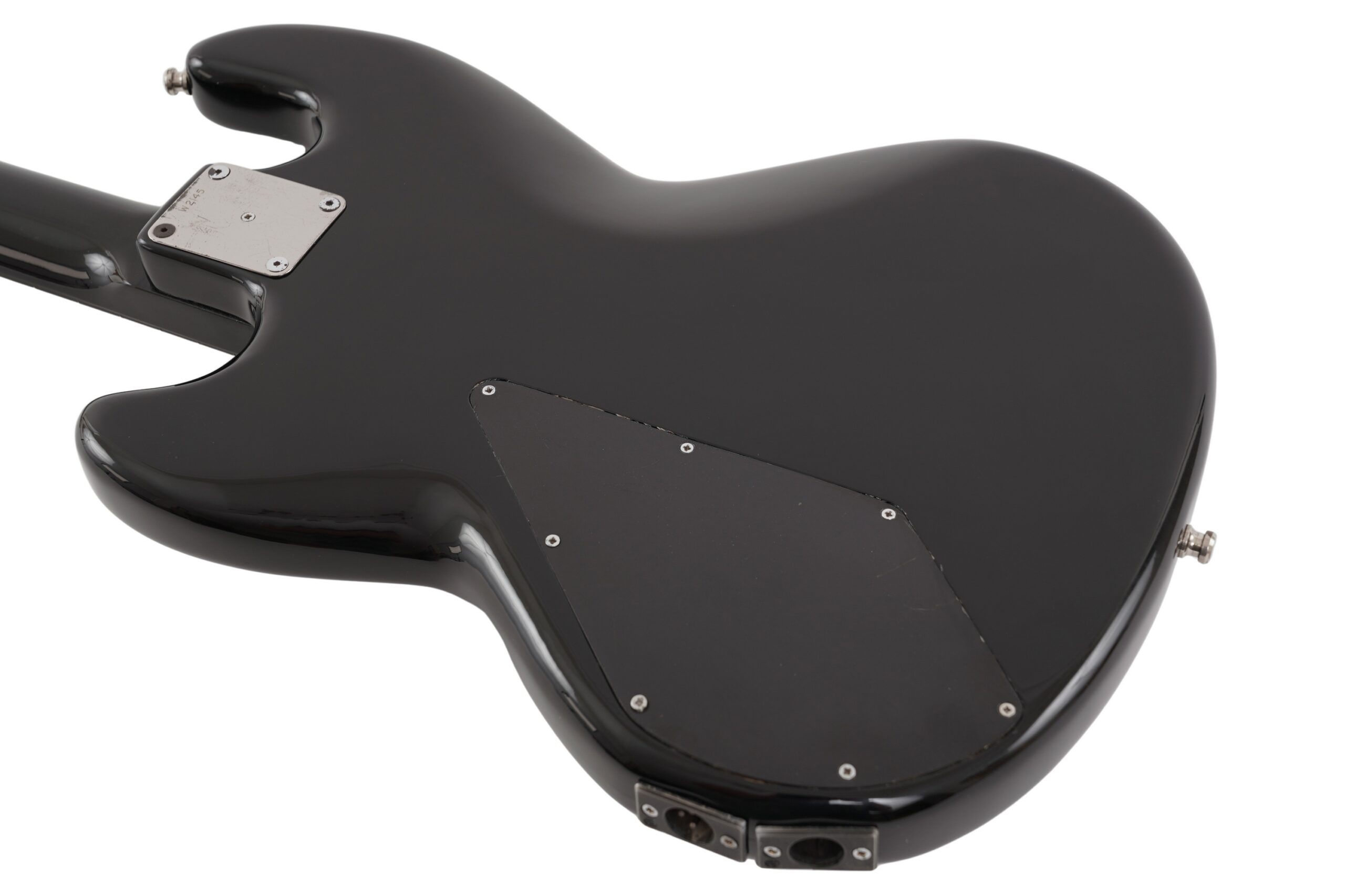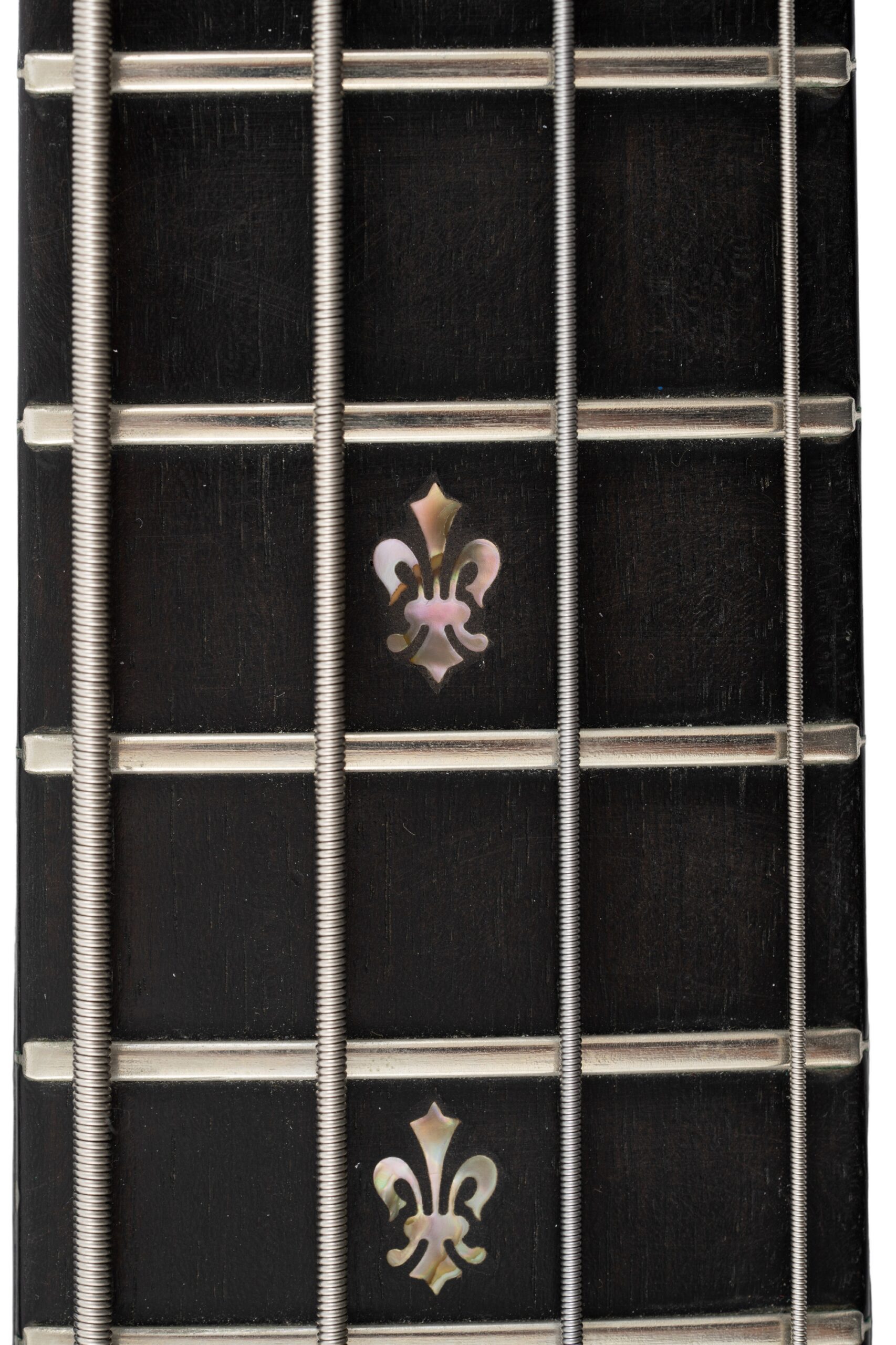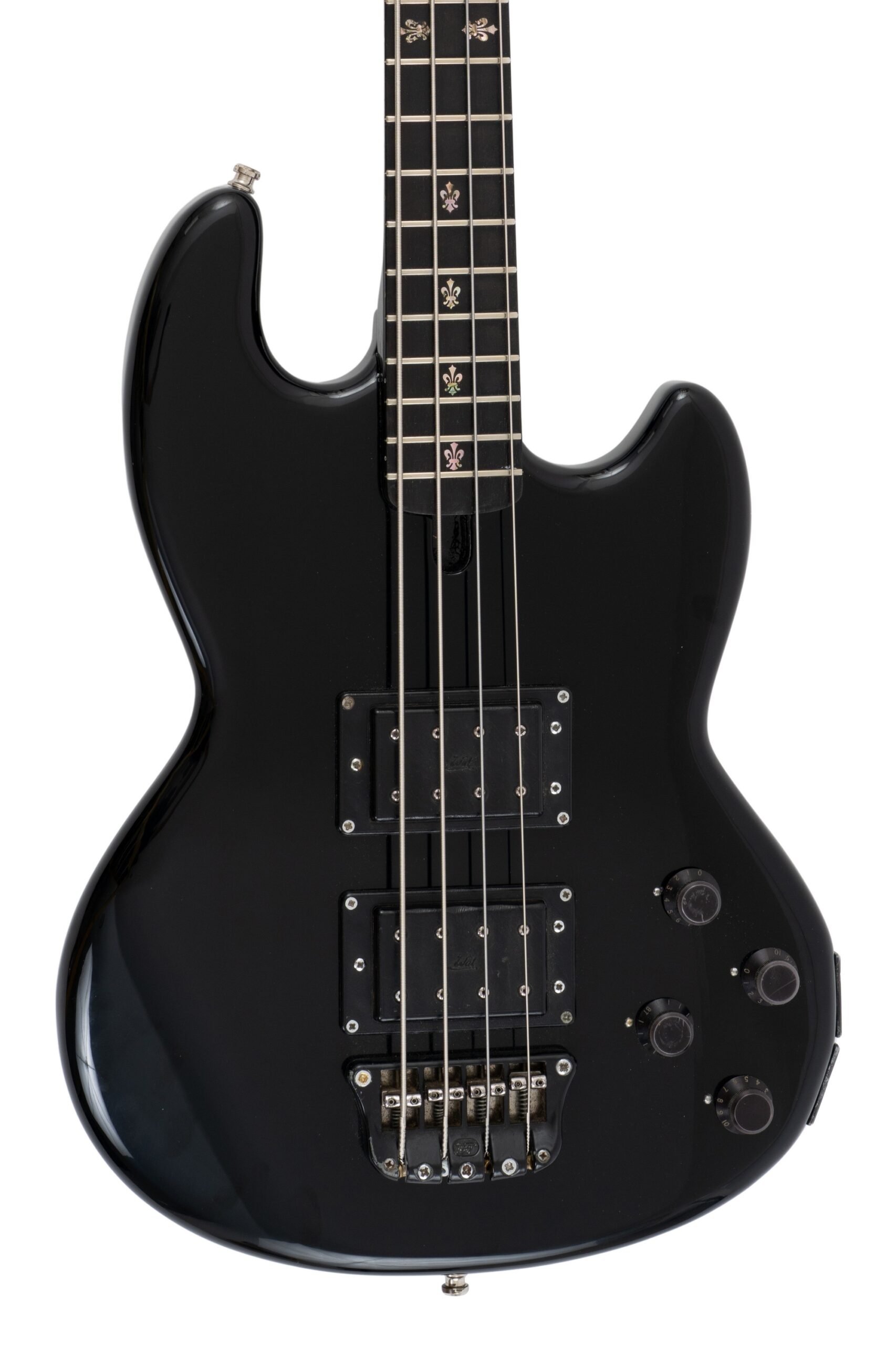 The bass documented here is a Wal Mk 1, serial number W2145, manufactured in July 1983 (as indicated by the interior label). It features an English ash body, black polyester finish, and rosewood fingerboard, with custom fleur-de-lis fretboard inlays. These inlays are a non-standard Wal feature and function as a distinctive visual identifier. The same configuration is independently recorded in the WalDataBASS registry.6