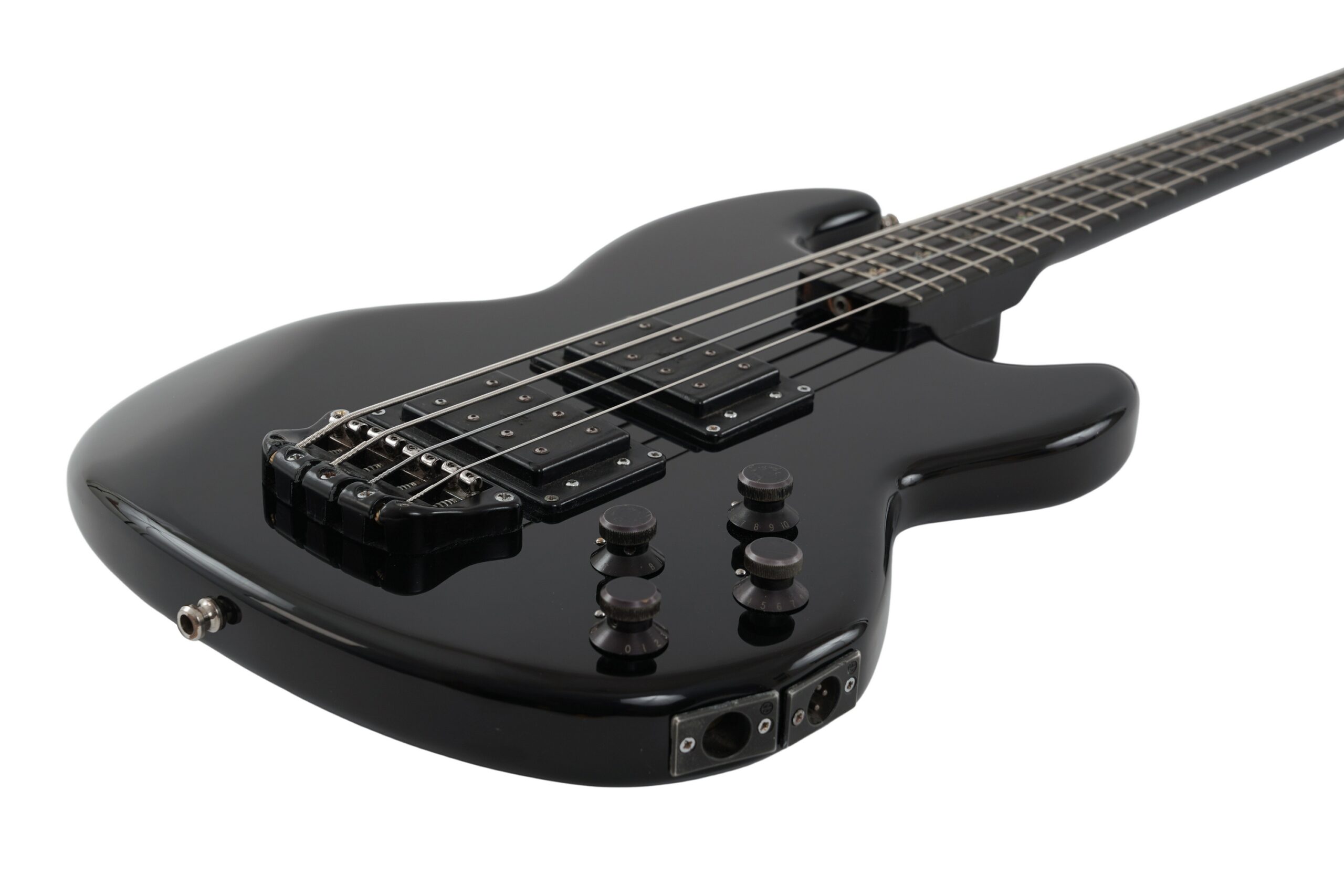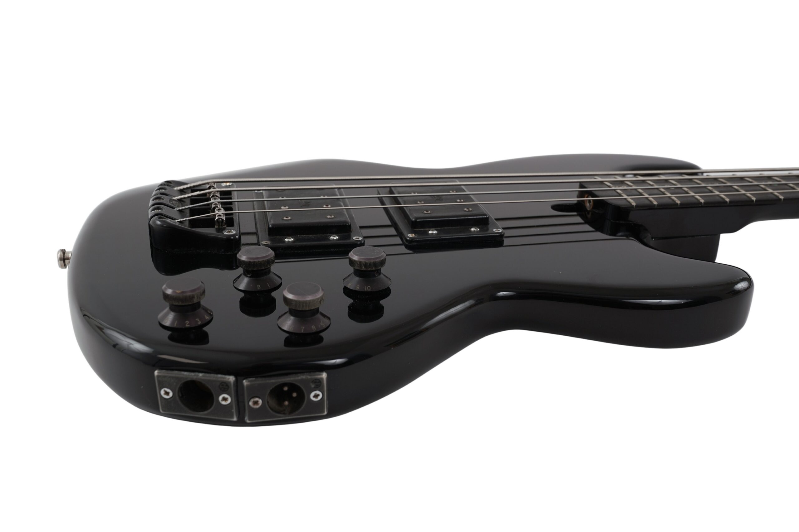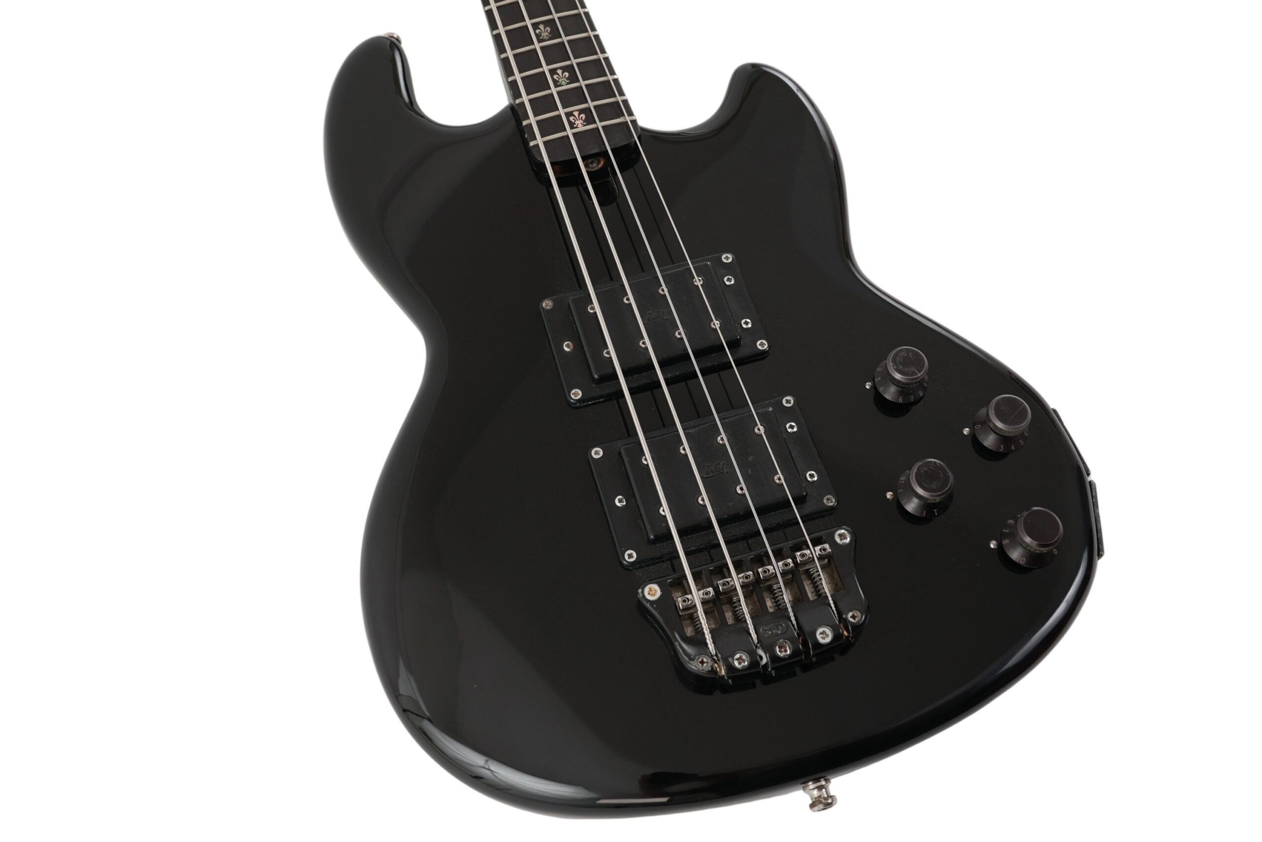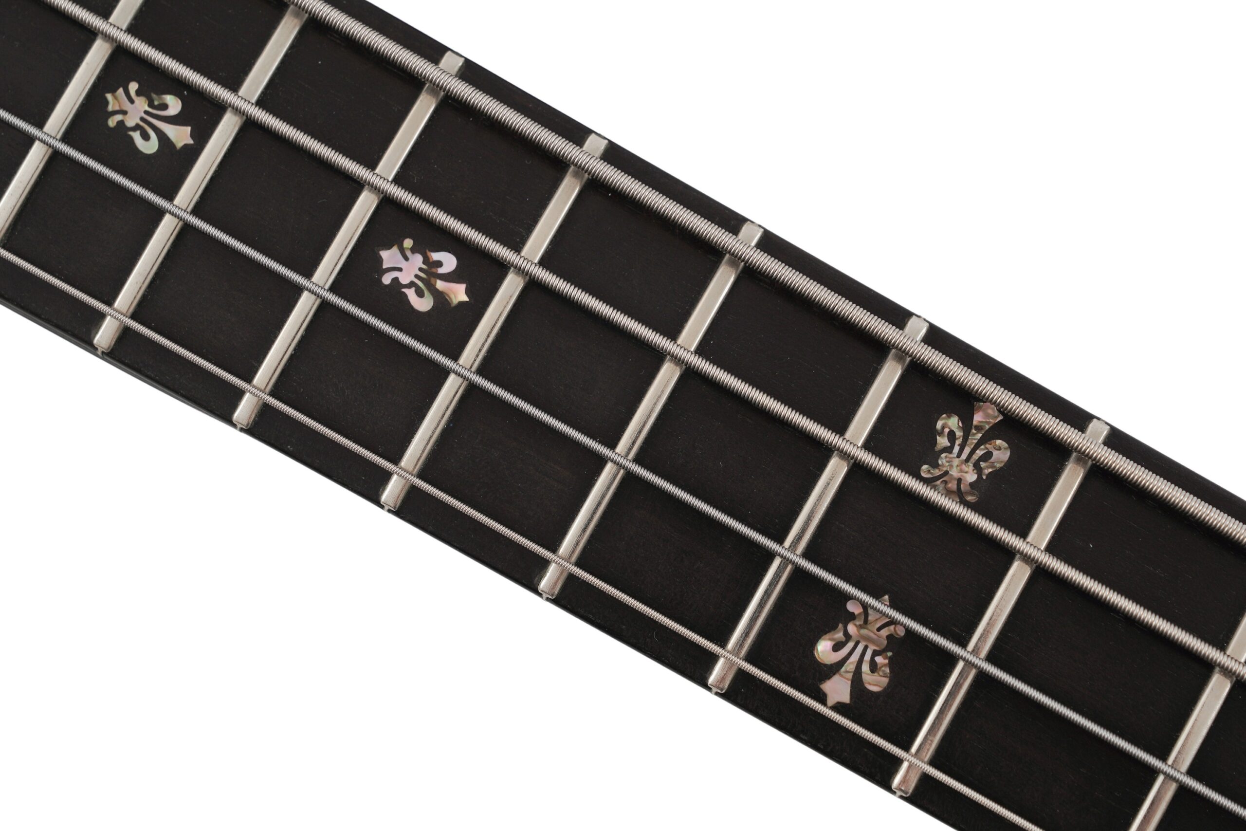 The bass documented here is a Wal Mk 1, serial number W2145, manufactured in July 1983 (as indicated by the interior label). It features an English ash body, black polyester finish, and rosewood fingerboard, with custom fleur-de-lis fretboard inlays. These inlays are a non-standard Wal feature and function as a distinctive visual identifier. The same configuration is independently recorded in the WalDataBASS registry.6