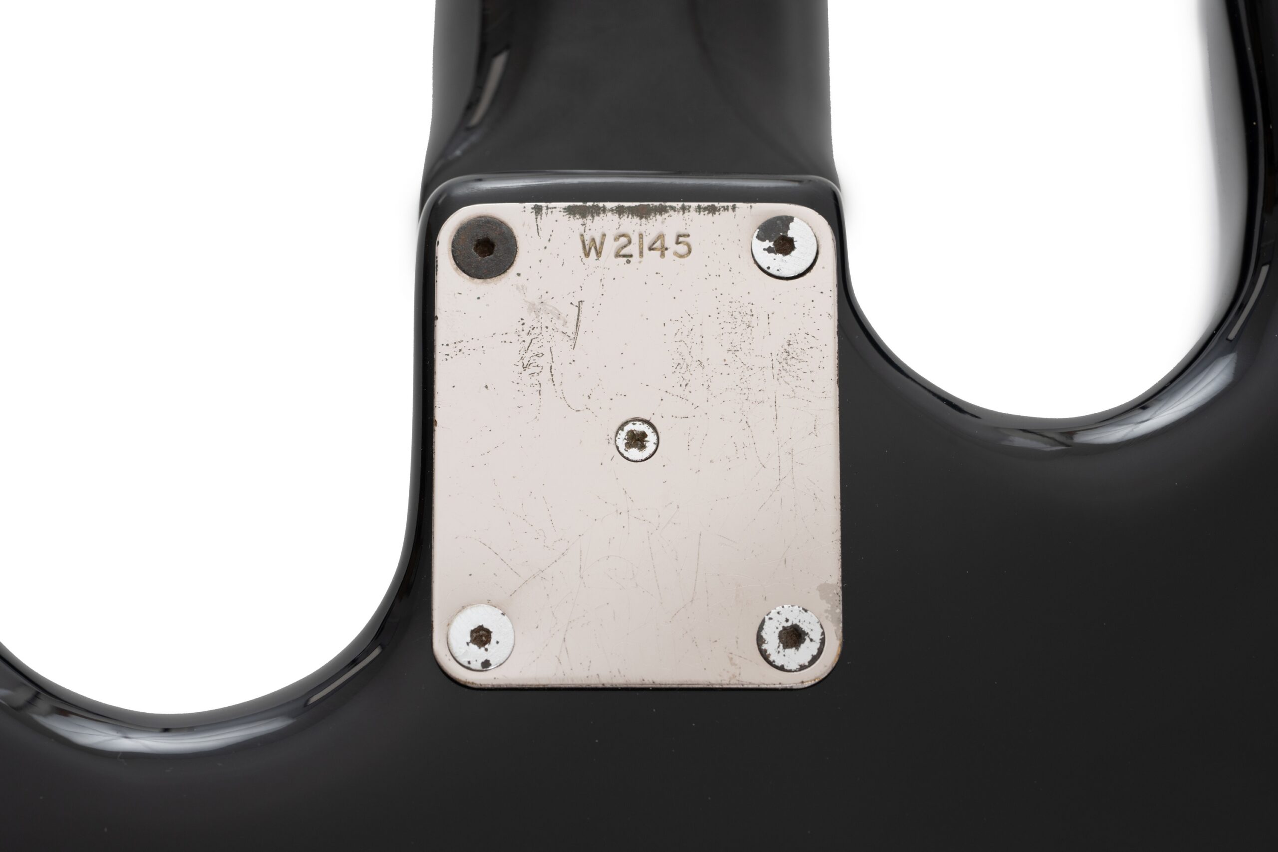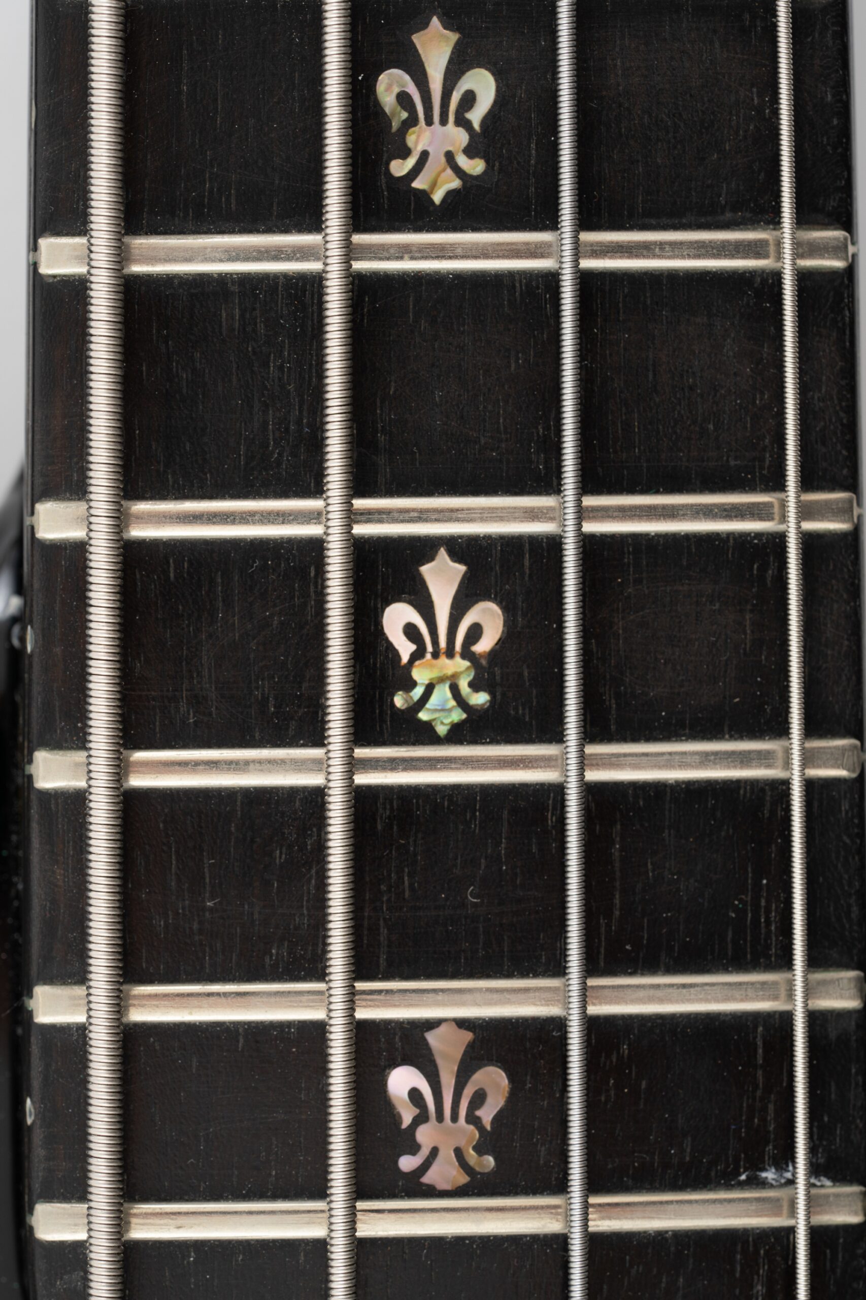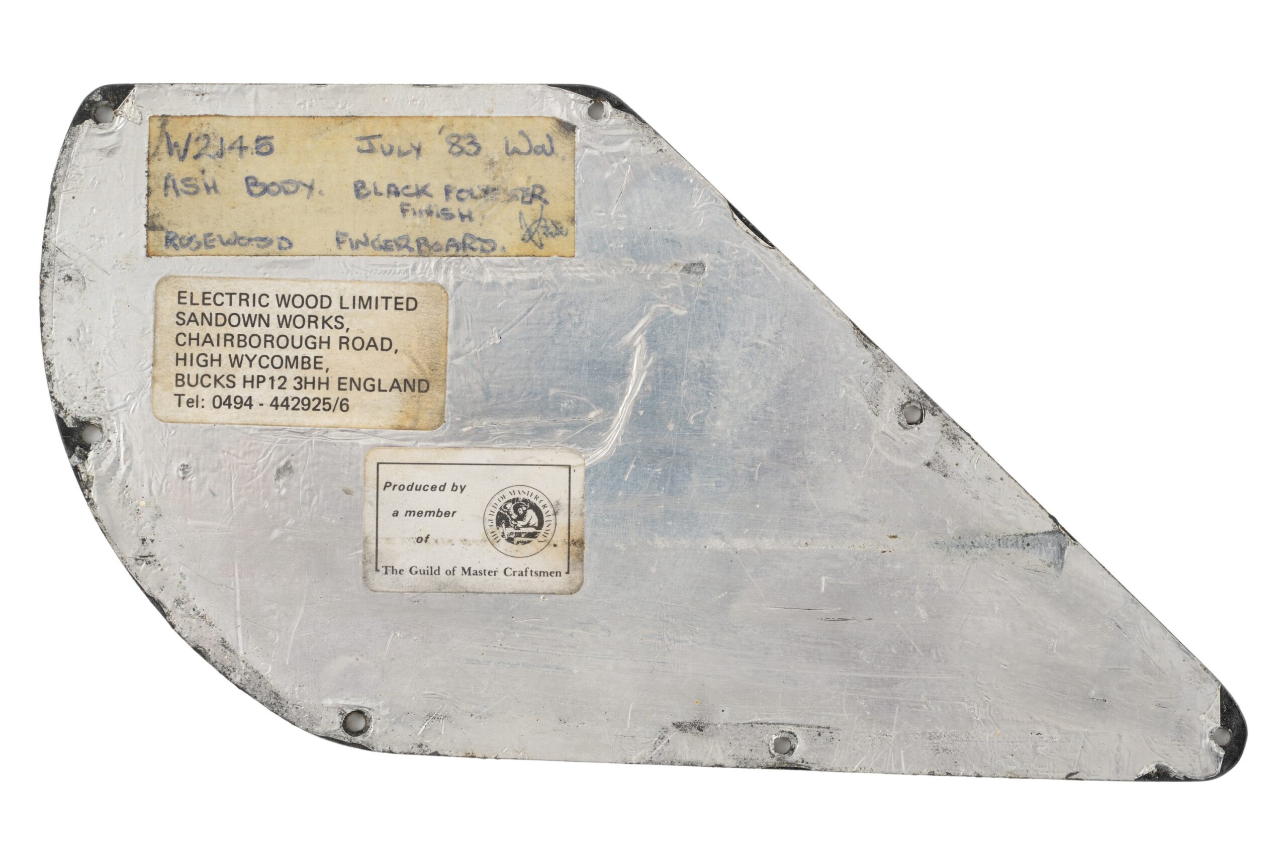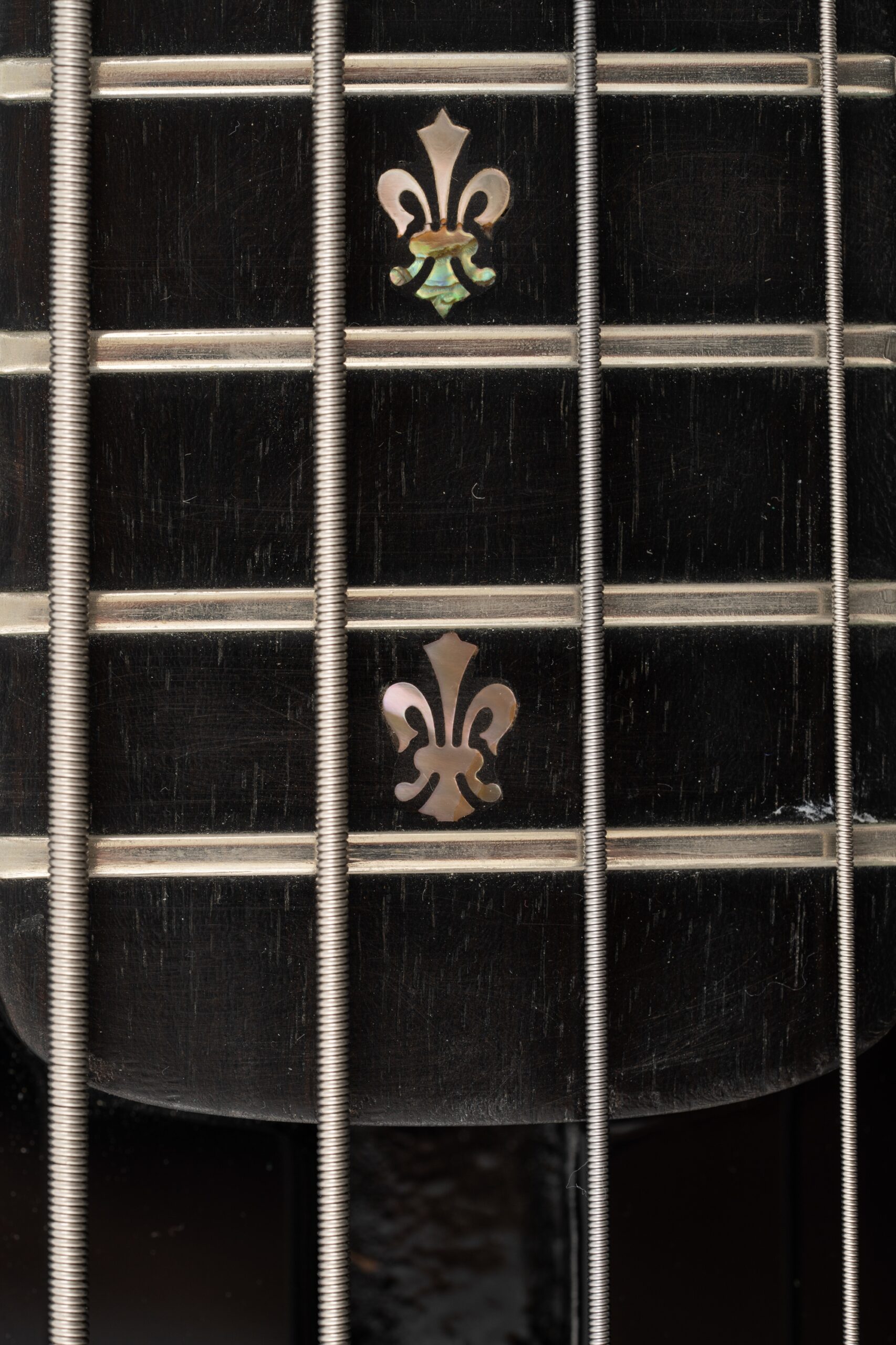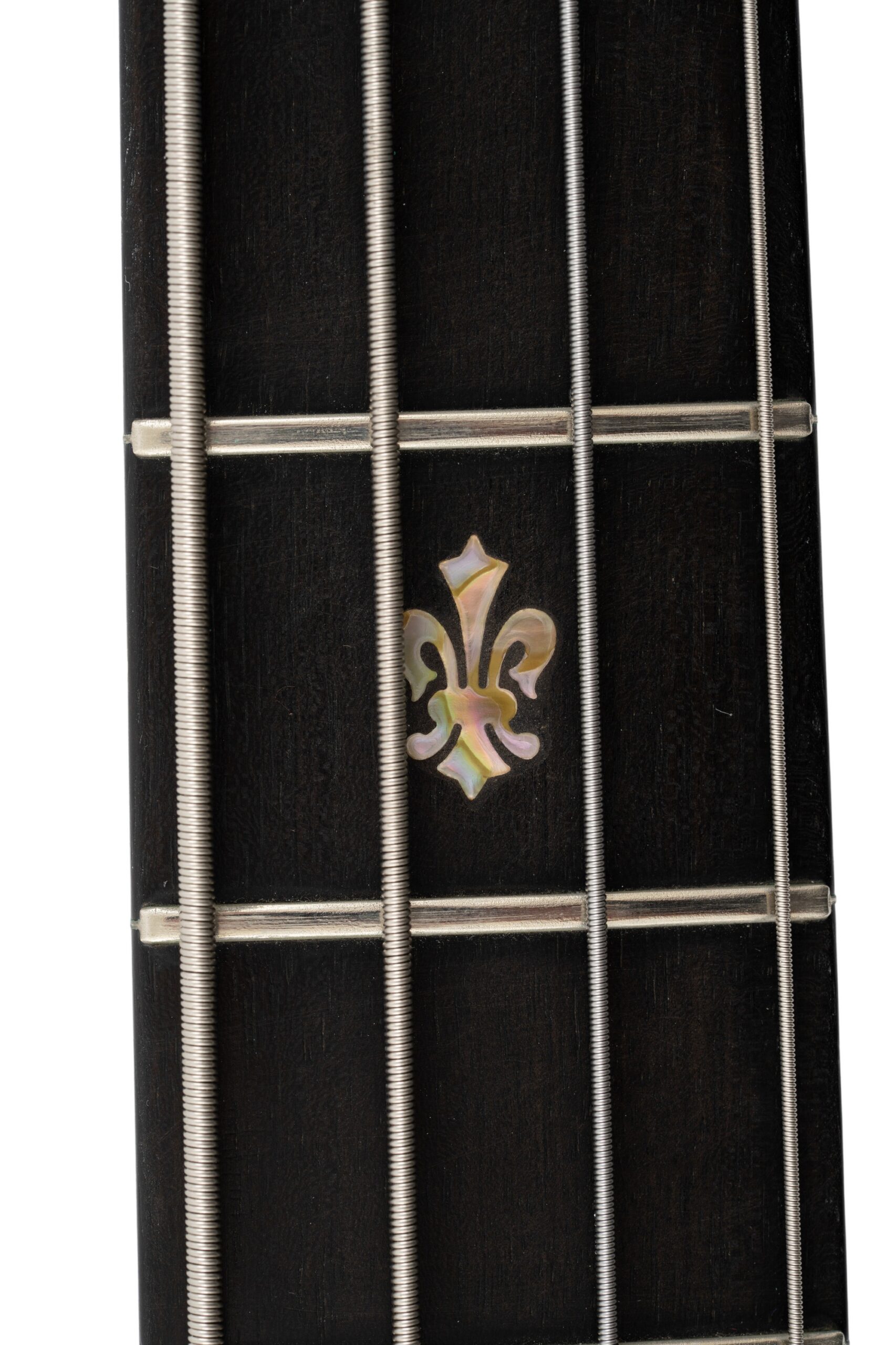 The bass documented here is a Wal Mk 1, serial number W2145, manufactured in July 1983 (as indicated by the interior label). It features an English ash body, black polyester finish, and rosewood fingerboard, with custom fleur-de-lis fretboard inlays. These inlays are a non-standard Wal feature and function as a distinctive visual identifier. The same configuration is independently recorded in the WalDataBASS registry.6