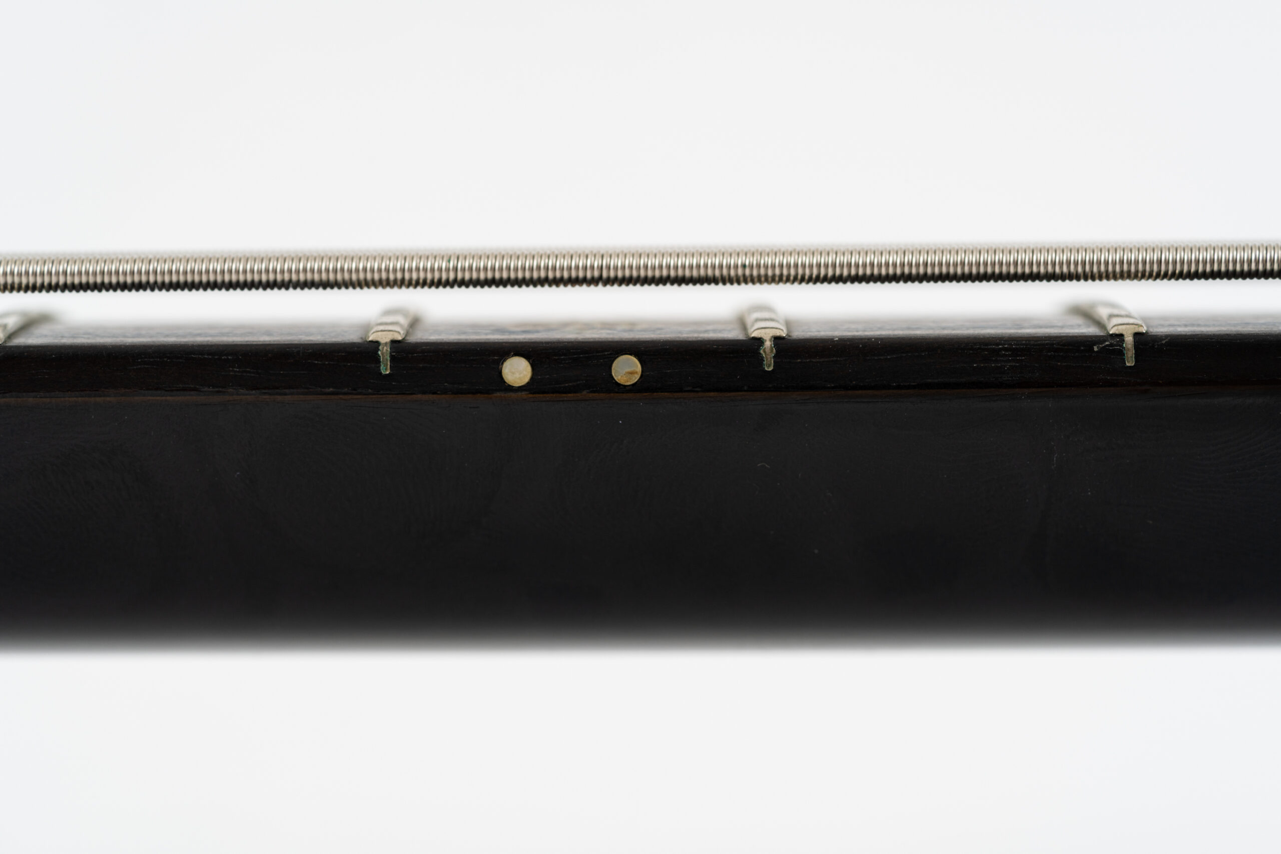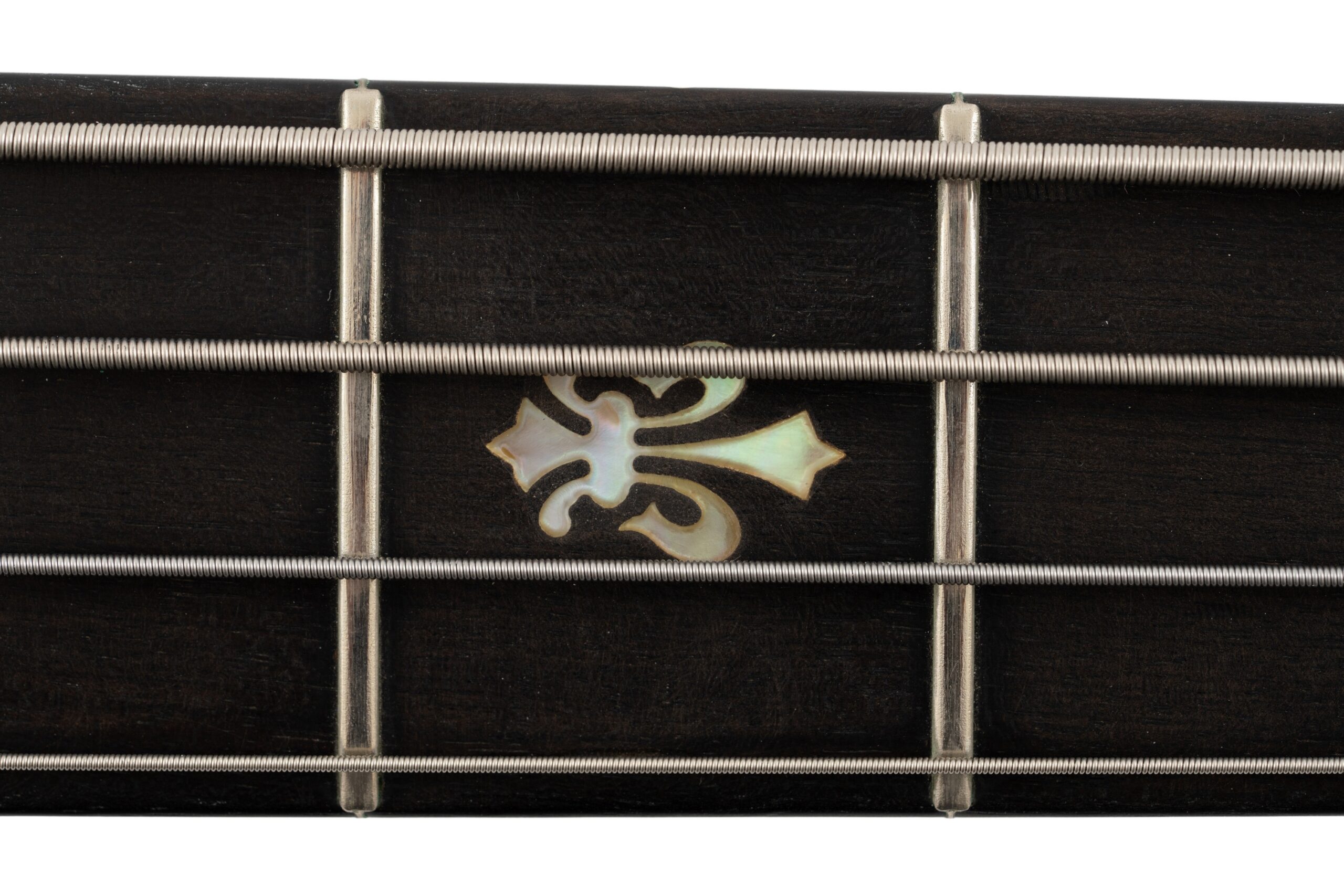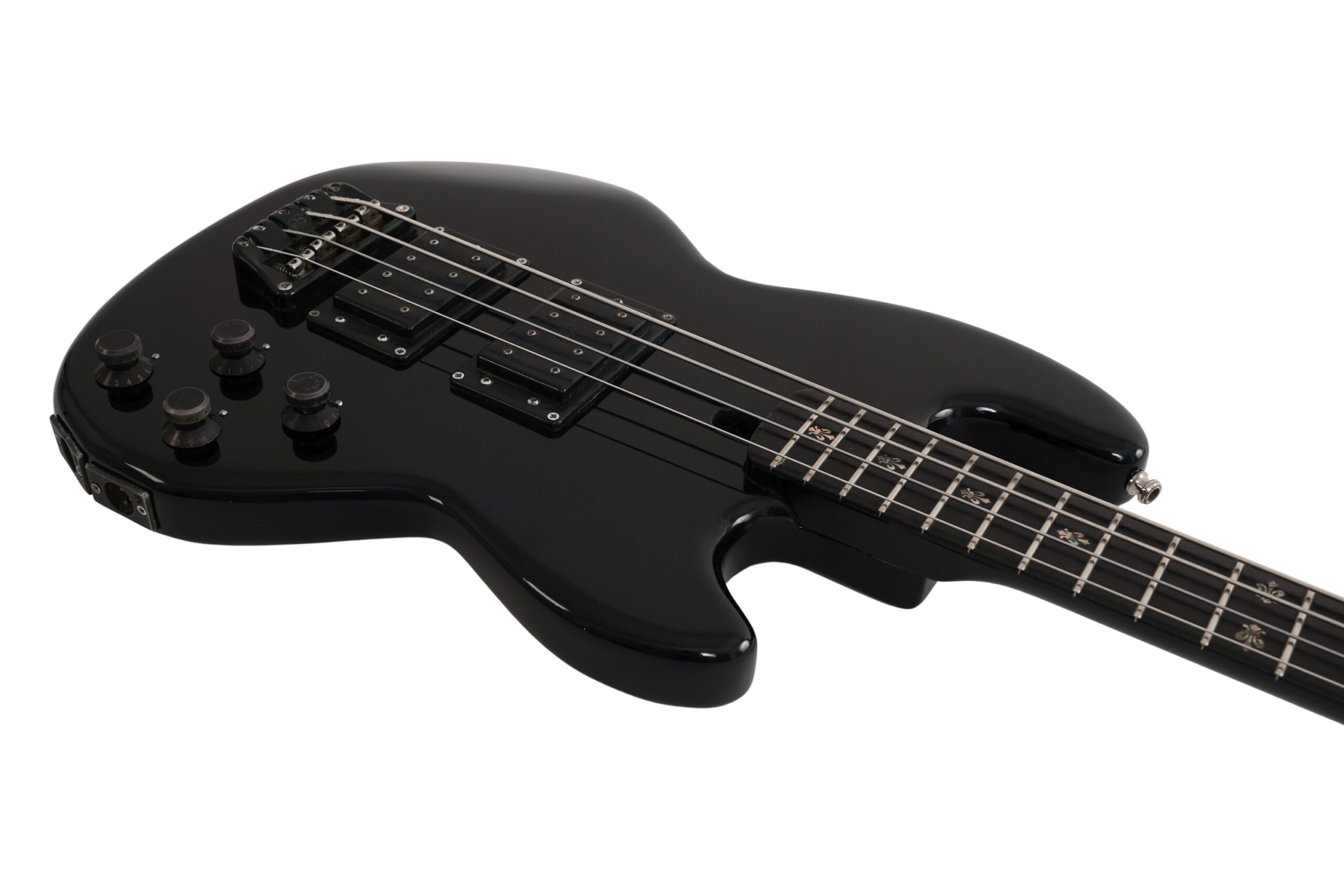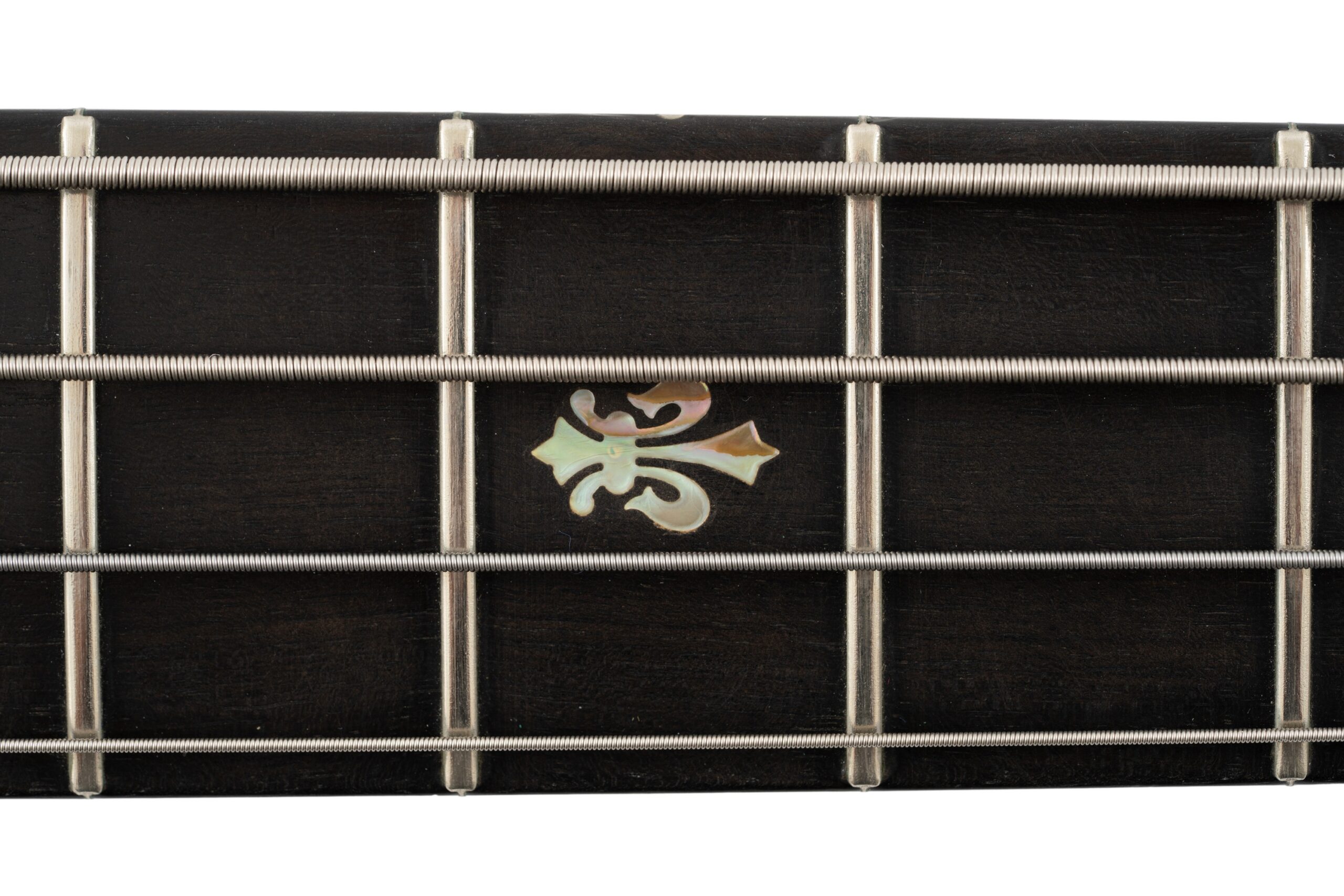The bass documented here is a Wal Mk 1, serial number W2145, manufactured in July 1983 (as indicated by the interior label). It features an English ash body, black polyester finish, and rosewood fingerboard, with custom fleur-de-lis fretboard inlays. These inlays are a non-standard Wal feature and function as a distinctive visual identifier. The same configuration is independently recorded in the WalDataBASS registry.6