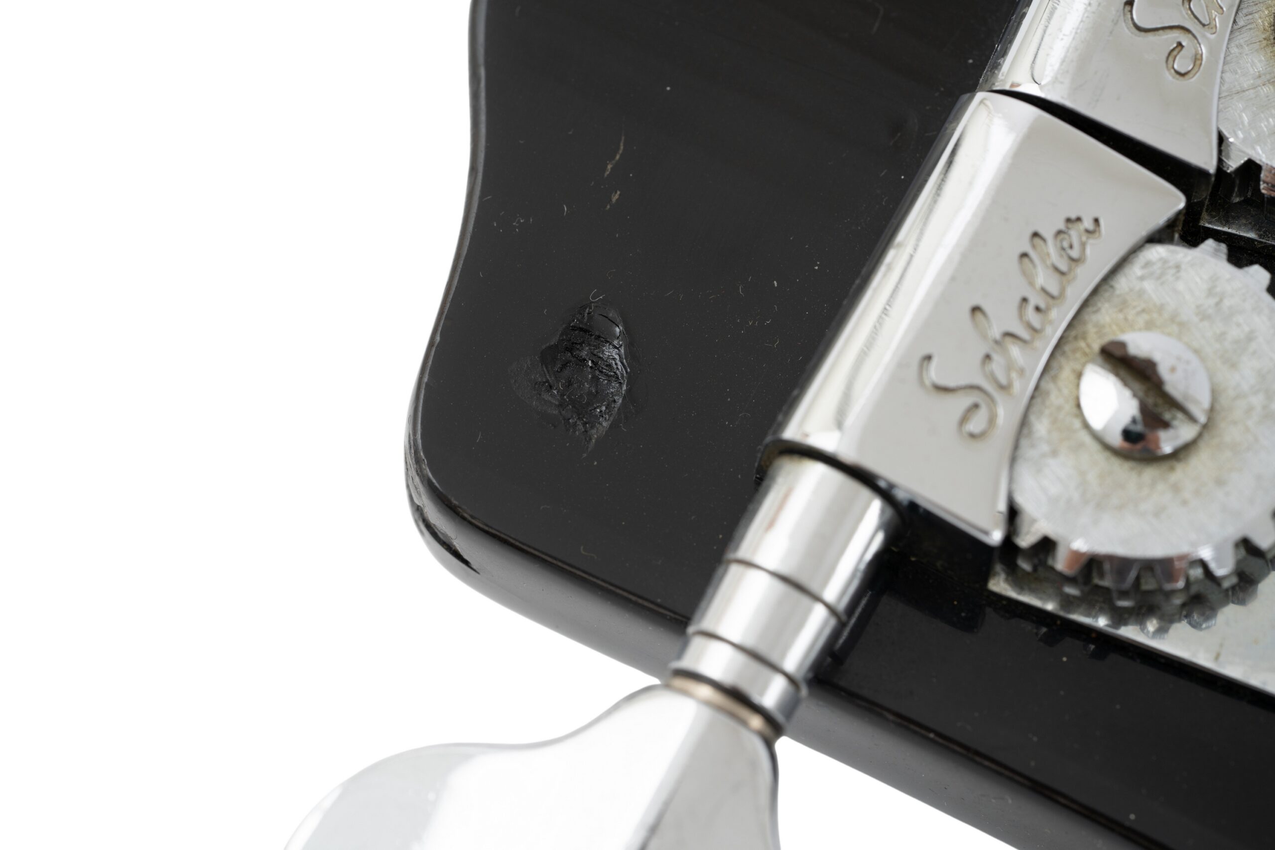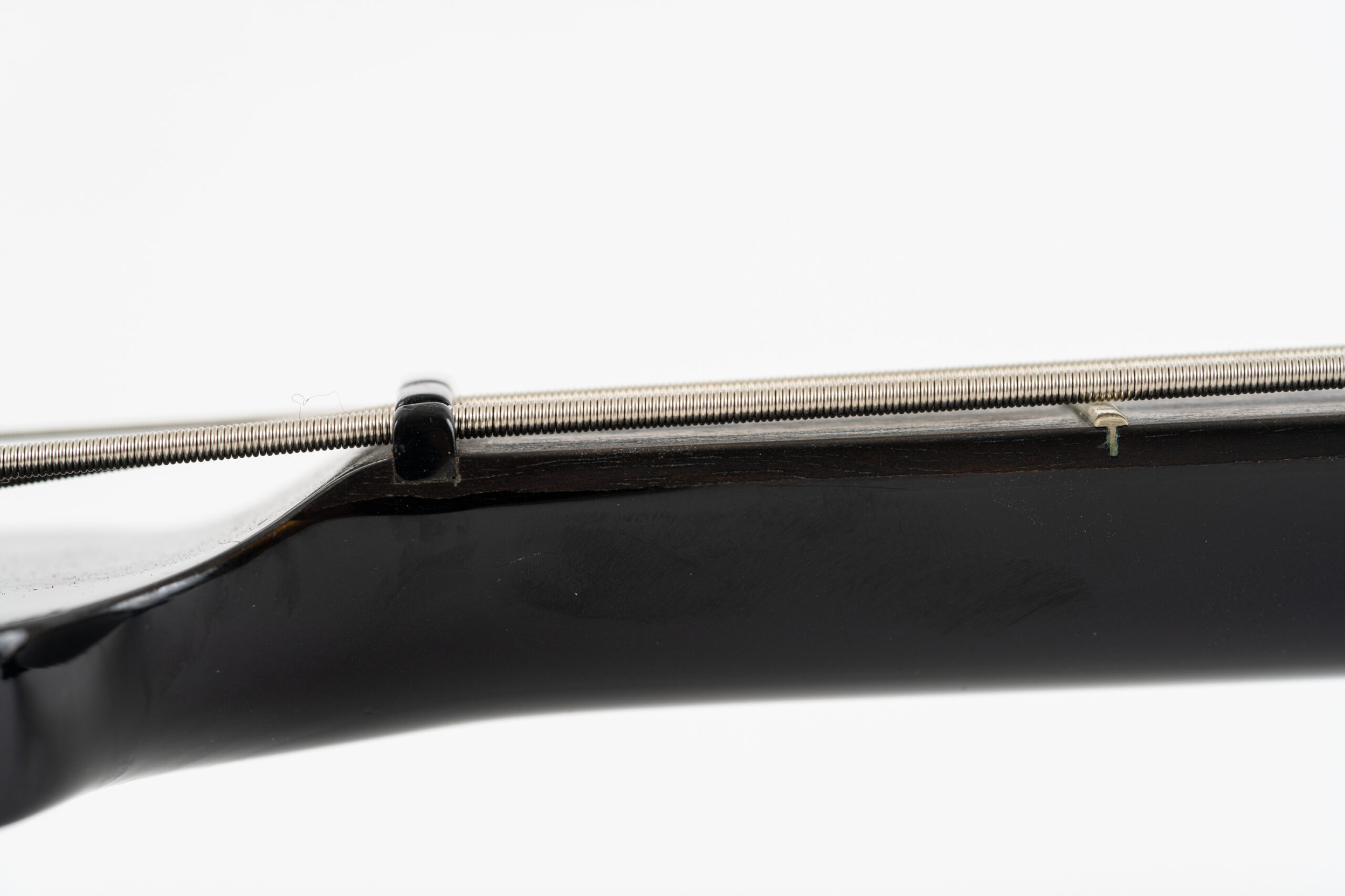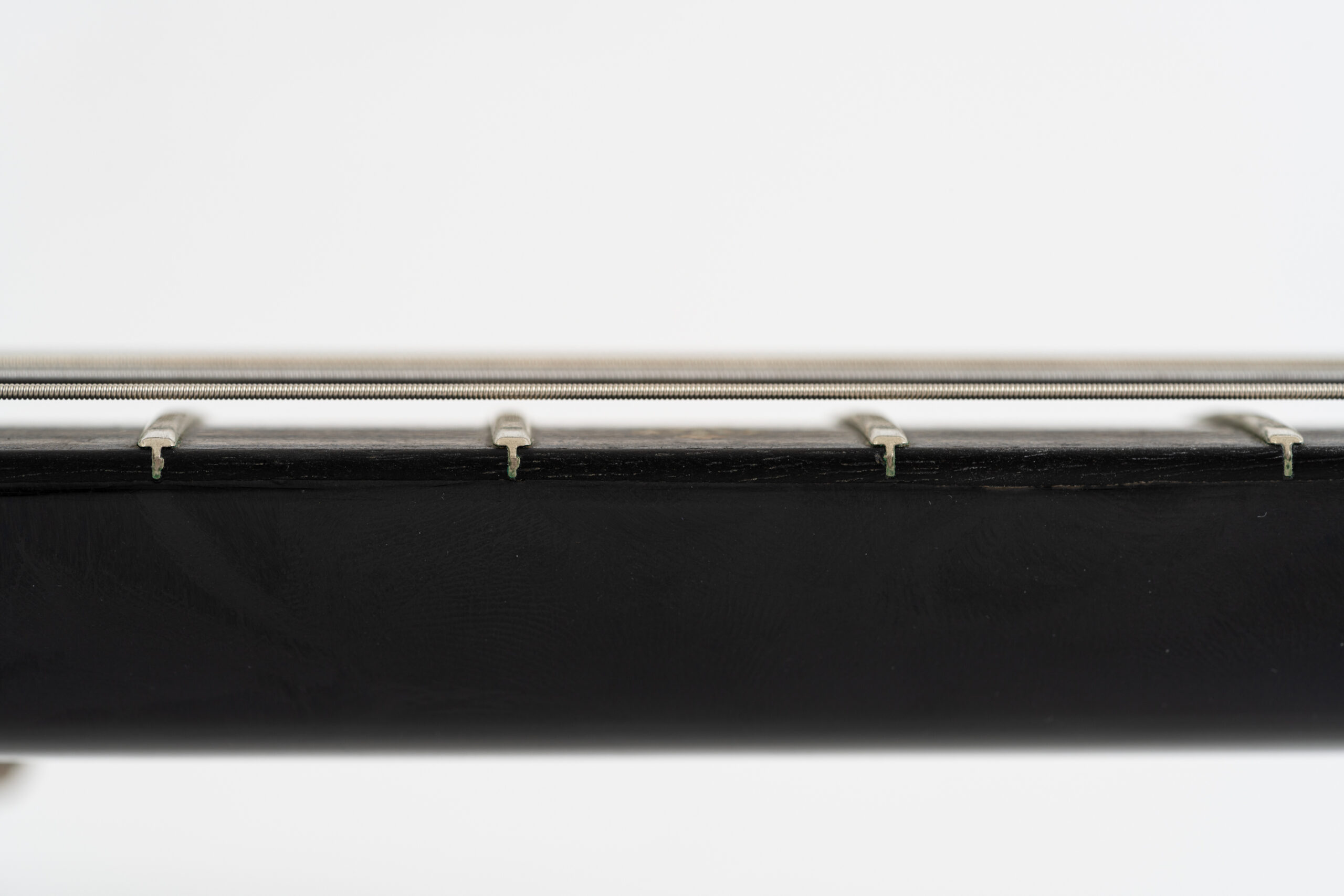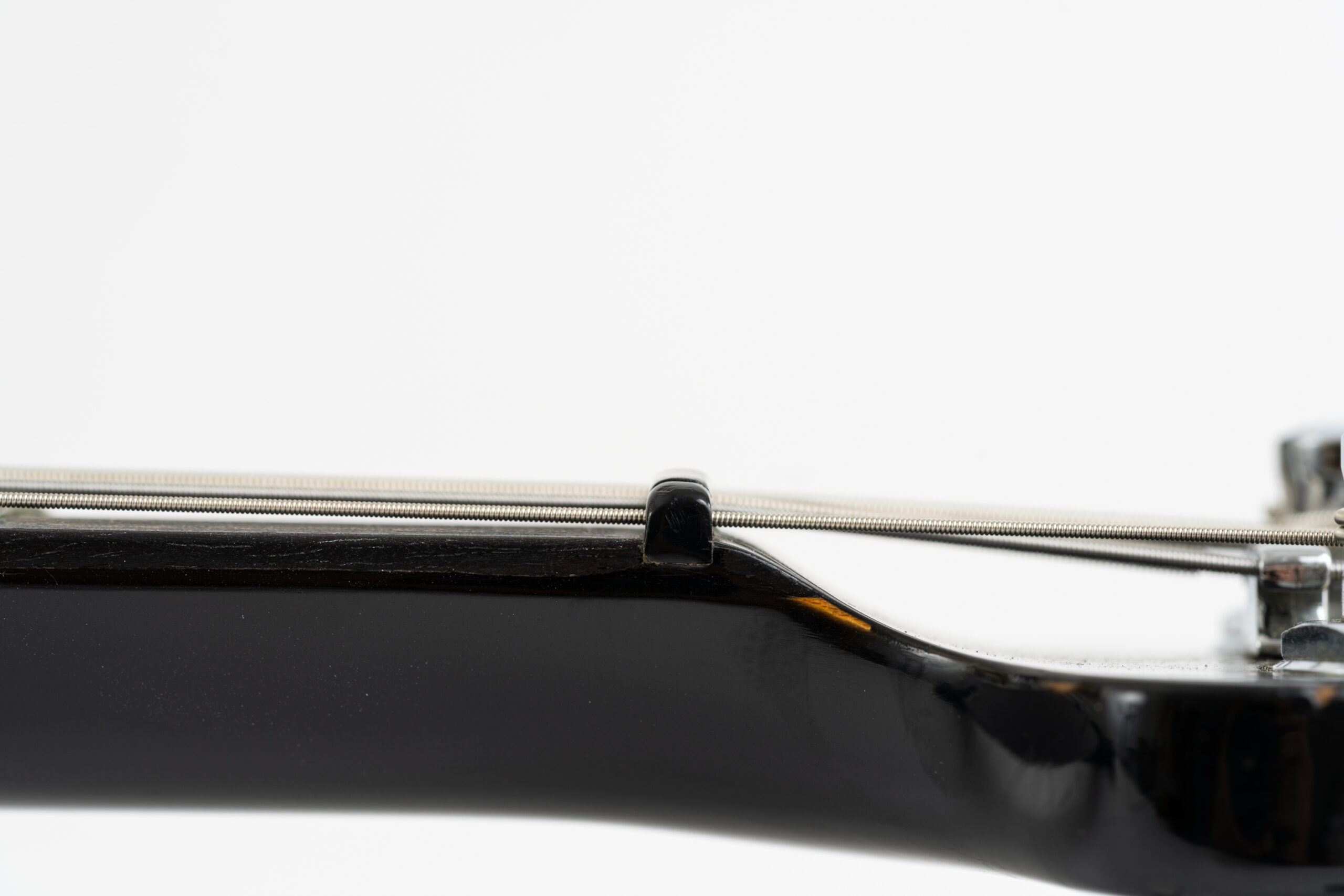 - Fingerboard: Ebony (incorrectly noted as “Rosewood” on scratch plate label)