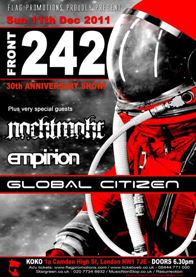 This is the third in a series of photojournals covering concerts during my trip to England and France. Tonight’s performance was Front 242, which was held at the KOKO in London, England on December 11th, 2011. This was their special 30th Anniversary Show.