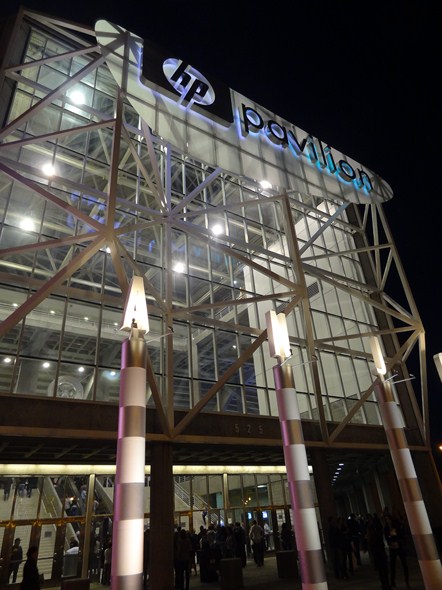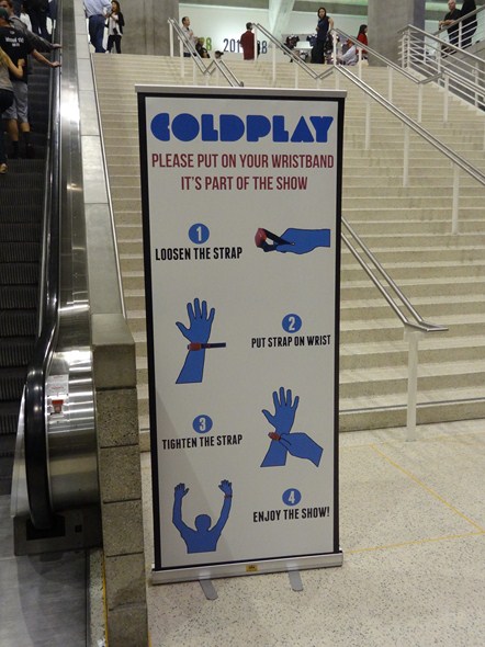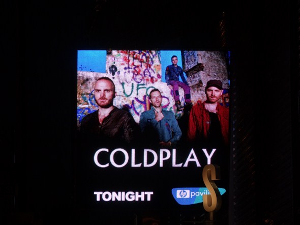 I have never seen a concert at the HP Pavilion in San Jose before – it is a typical sports-oriented indoor stadium that can seat a large crowd. As we came fairly late (doors opened at 7:00 and we arrived at about 8:45, with Coldplay scheduled to hit the stage at or a little after 9:00), the “xylobands” had all been handed out. These are the custom wristbands designed to light up and blink at various points in the concert. These were first introduced at the AMEX Unstaged concert in Madrid. Though once we got in someone was nice enough to hook us up (thank you!).