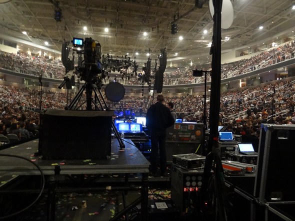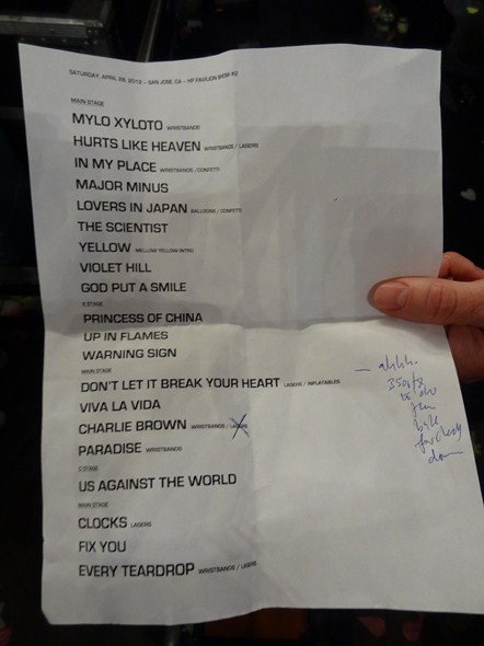 The set list hasn’t varied too much from what has been in rotation for the past year – the notable additions being a reappearance by “Lovers in Japan” from Viva la Vida, and the addition of “Princess of China” from the new album (with Rihanna appearing on video screens, as she provides vocals on the studio version of the song), “Warning Sign” from A Rush of Blood to the Head, and “Don’t Let It Break Your Heart” from Mylo Xyloto. I expect some of the non-MX songs will vary and change throughout the tour. Below is a photo of a set list from the sound/mixing area: