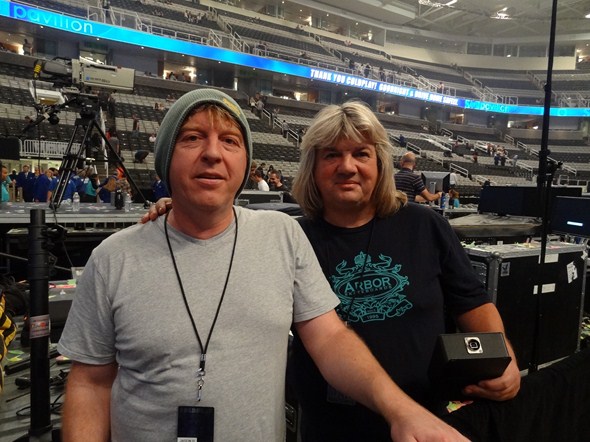 Shortly after that, via my friend Dianne, I had a chance to meet and talk with Jason Regler, who is the inventor of the xylobands. There is a great interview with him on Coldplay.com that talks about his story and how he came to create these devices for Coldplay. Funny enough, as was the case with my friend Amanda, he had tickets for the special Crisis “Hidden Gig” in Newcastle, England with a meet and greet with the band and never made it due to the harsh weather conditions. You can read his interview for the rest of the story… in any event, below is a photo of Jason (left) with Kim (right) – funny side note, I spoke with Kim, who also works for Coldplay, at the L.A. shows in February, and he remembered me as the guy who kind of looks like Johnny Buckland (even without the hat! LOL):