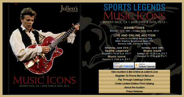Beverly Hills, California — Monday, May 28, 2012 – Julien’s Auctions, the world’s premier entertainment and celebrity estate auction house, announced Music Icons and Sports Legends, an unprecedented collection of music and sports memorabilia being offered in a two-day auction, June 23-24, 2012. The historic collection of items to be auctioned include iconic pieces from contemporary stars of Rock-n-Roll to legendary icons and sports heroes who made history.