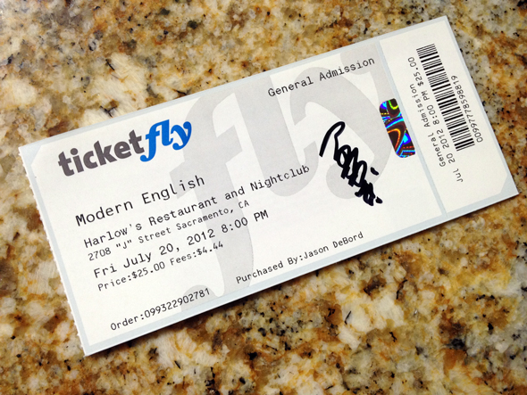 After parking, I was walking up the sidewalk toward the entrance of Harlow’s, and who did I see? Robbie Grey, front man for Modern English, and the gentleman who I interview just the day prior for the podcast. He was not engaged in conversation with anyone, so I went up to introduce myself, and thank him for the time he took out of his busy traveling schedule to talk with me. He was also kind enough to autograph my ticket:
