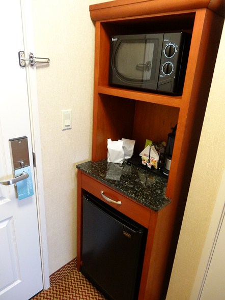 The bed was very comfortable. The views were not terribly exciting, and there was road noise, but not enough to be too much of a bother. Also included in the room was a microwave and (unstocked) mini fridge.