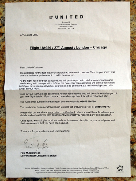 We were shuttled back and put directly into inbound immigration, who let those of us who originated in the UK prior to the flight pass through to baggage claim, where there were United Airlines representatives waiting with generic envelopes for each of us, which included these two documents: