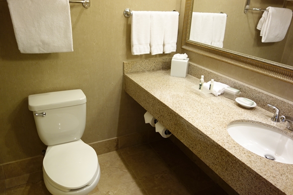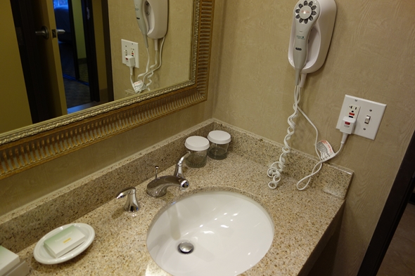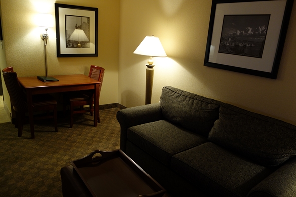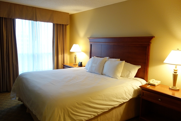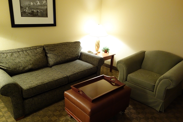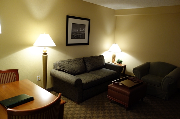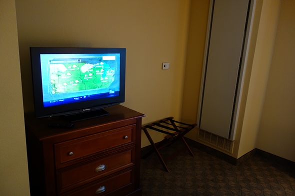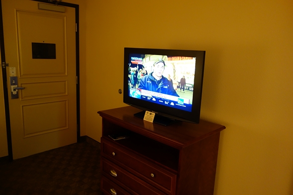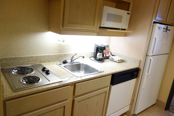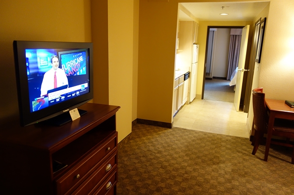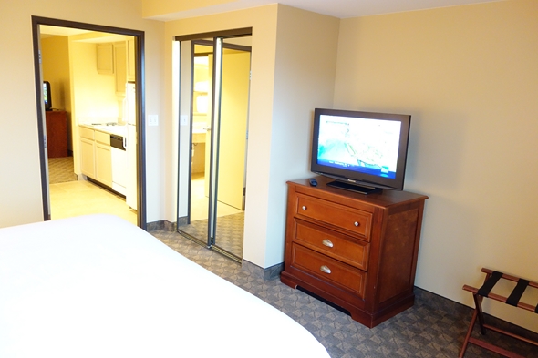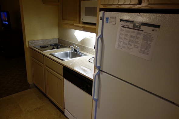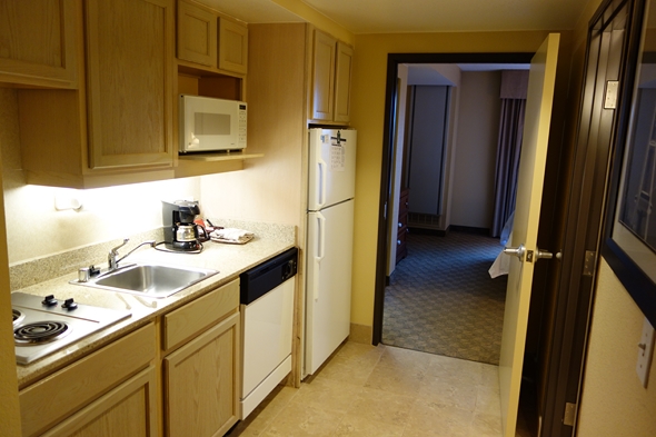 The most notable thing about the room itself is that it is huge, and definitely ideal for a long-term stay. Walking in, there is a family room area with couch, chair, dining table with two chairs (that can double as a desk, since there is not otherwise a desk), and the first of two televisions. In-between the family room and the bedroom is a kitchen with bathroom. The kitchen includes a full refrigerator, stove, microwave, sink, dishwasher, dishes and utensils, and the like. As such, guests can fully cook in their room. The bedroom is a traditional hotel room with bed, nightstands, dresser with television, and closet. There was not anything too special about the view (mostly parking lot), and having walked around the hotel, I don’t imagine that any of the views are particularly impressive.