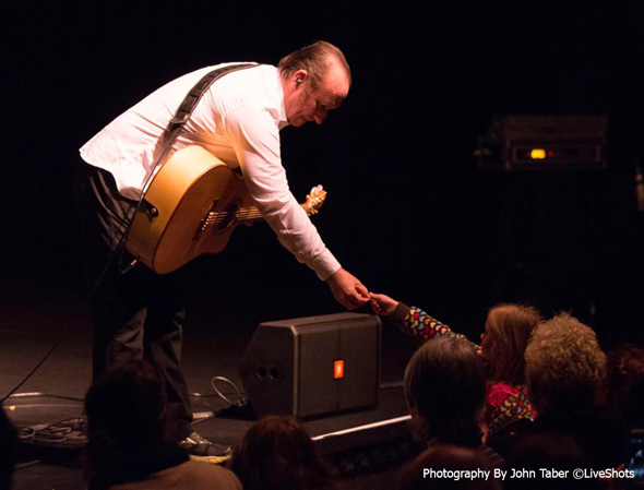 Fittingly, when he first came onto the stage to begin his show, he spotted a young girl sitting the front row, and immediately put aside what he was doing to hand deliver a guitar pick to her, and remarked “it’s a family show tonight”… fellow photographer John Taber captured this moment and graciously granted me permission to republish his photo (in my opinion the shot of the night) here as part of my article (photo below By John Taber ©LiveShots):