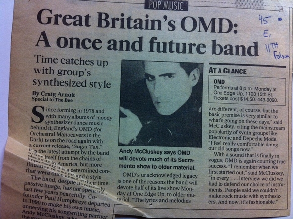 As a funny aside, the last and only time I’d ever seen OMD live was circa 1990… I had skipped my senior prom in high school to see OMD open for Book of Love in a small club in downtown Sacramento. And I actually happened to have saved a newspaper clipping from the Sacramento Bee previewing the show, as well as a small leaflet for the Book of Love half of the concert (what can I say – I save everything…):