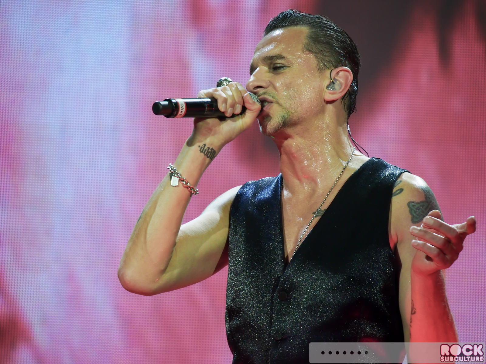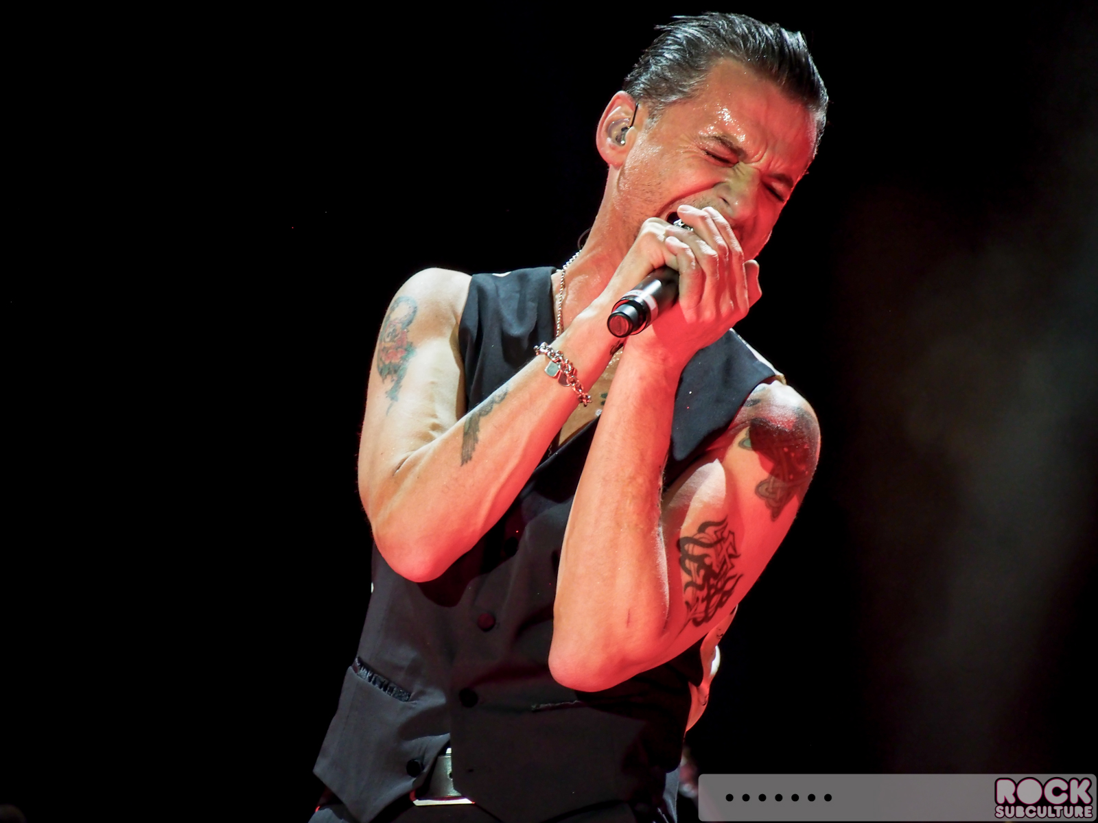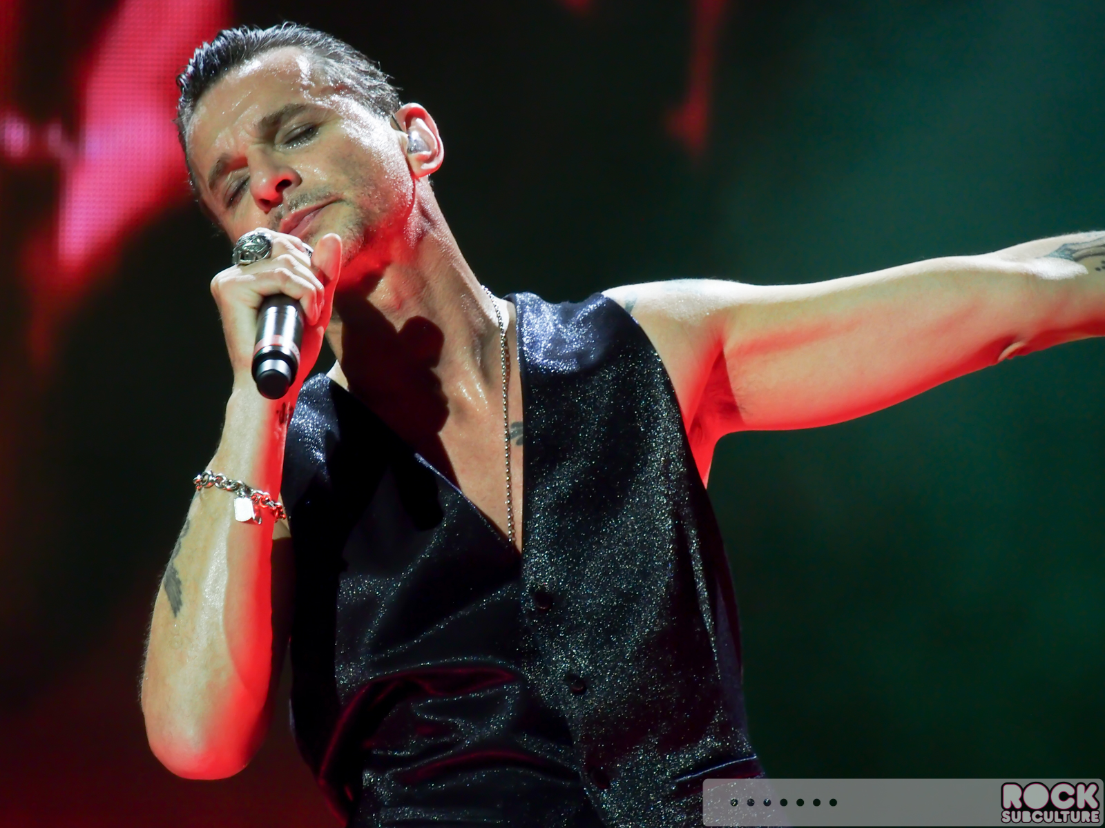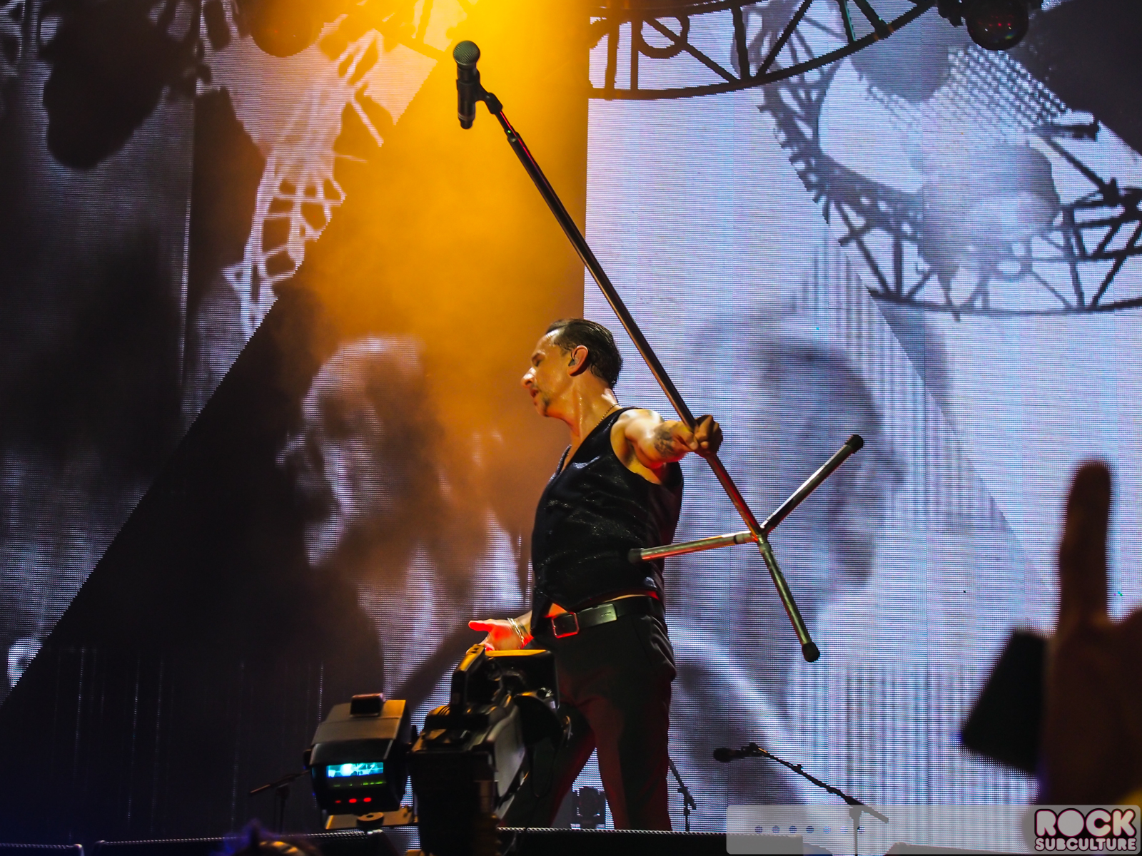 So the way the stage is configured for this tour, there is the standard front stage, and Dave’s mic is center (with drum kit behind), and Martin is on the left (looking at the stage) and Fletch is on the right). I happened to be dead center with Dave’s mic, about three rows off the rail. Looking at the stage, to my right, was the ramp walkway that extended from the stage into the “FOS” GA area. There were about two people to my right, and then the platform. I found this to be a great spot (and ended up there more by accident than design), as Dave spends the majority of his time in the center mic area. He used the ramp far less than I expected, and if I remember correctly, Martin used it one time.