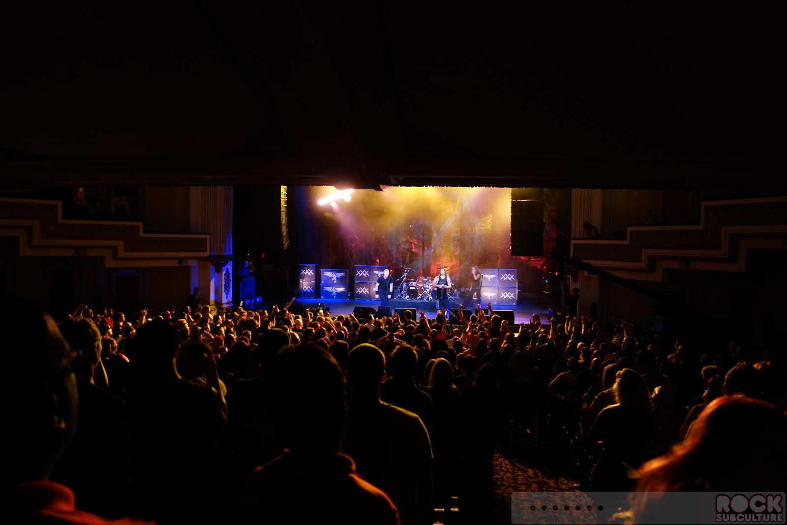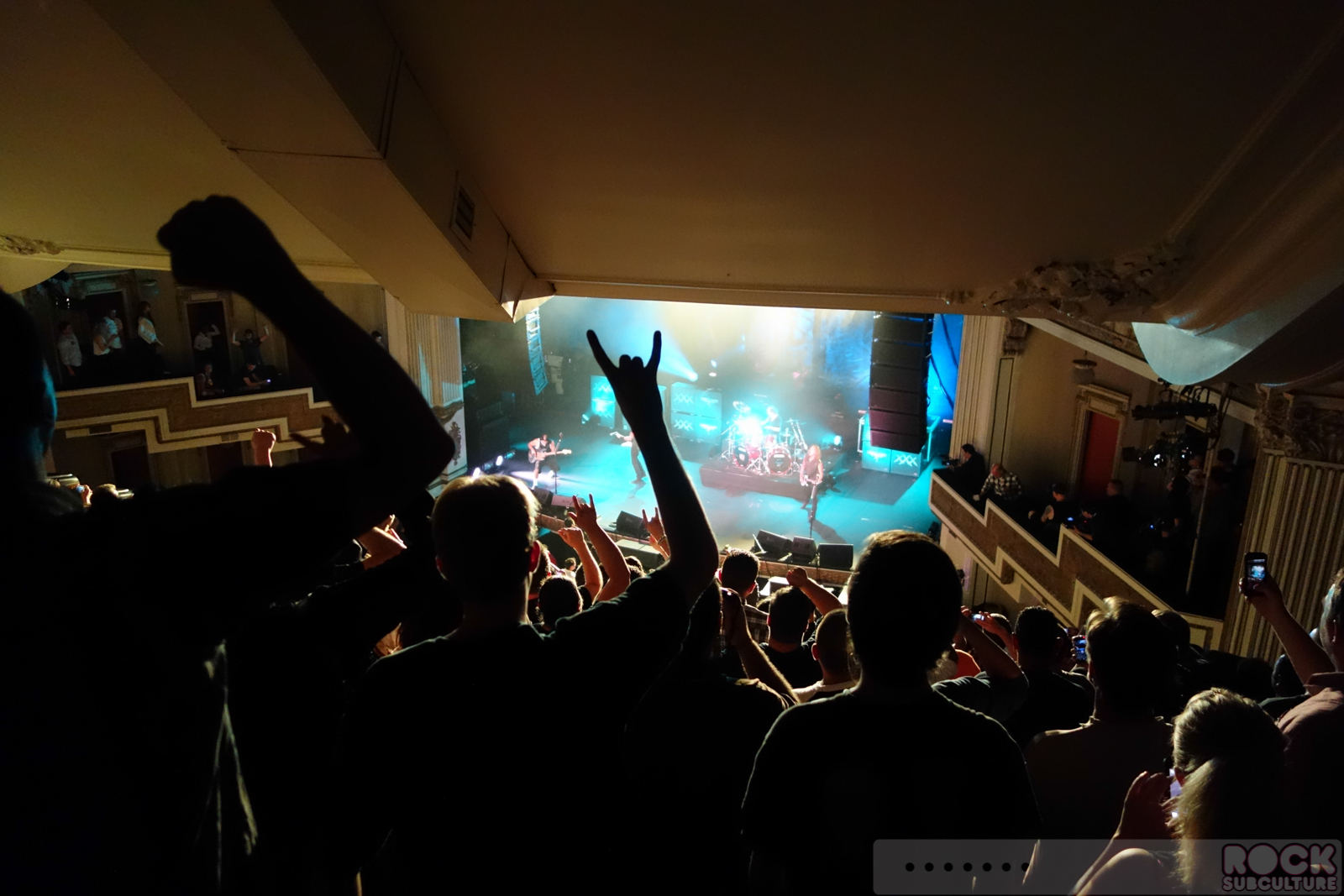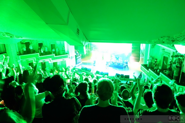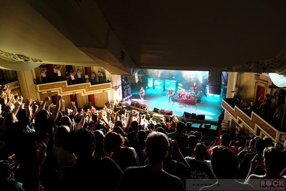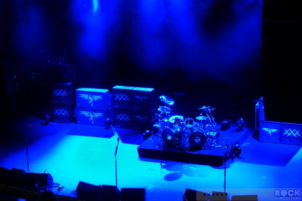 The theater was all numbered seating, with floor seats, a mezzanine, and a balcony above that. My seat was at the back of the mezzanine, so I did not bother to take many photos (so unlike nearly all of the reviews on this site, this one has a meager offering of unspectacular distant photos just to give some idea of the small, intimate venue for this large and loud band).