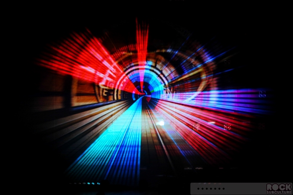 The show opened in a bath of brilliant orange light… almost like an unnatural sunset, which morphed into a circuit board, before being virtually launched into a high tech tunnel (that reminded me of Jeff Minter’s Tempest 2000 for the short-lived Atari Jaguar). Forward movement. Felt appropriate enough, as they are artists that have seemingly been on an unrelenting, forward trajectory throughout their careers… a journey. Only last night, they took us with them.