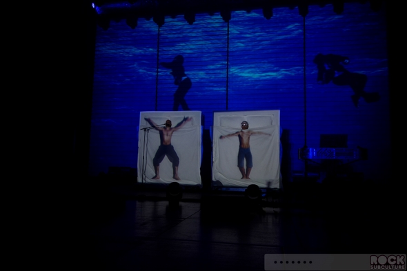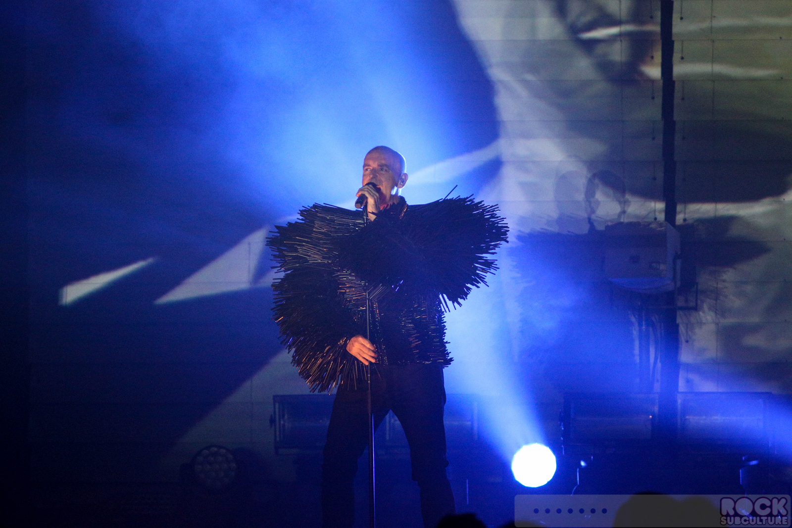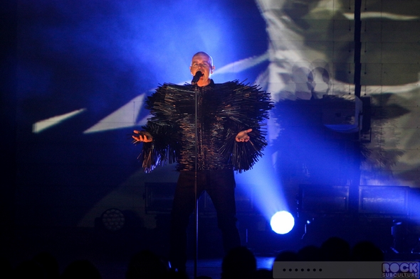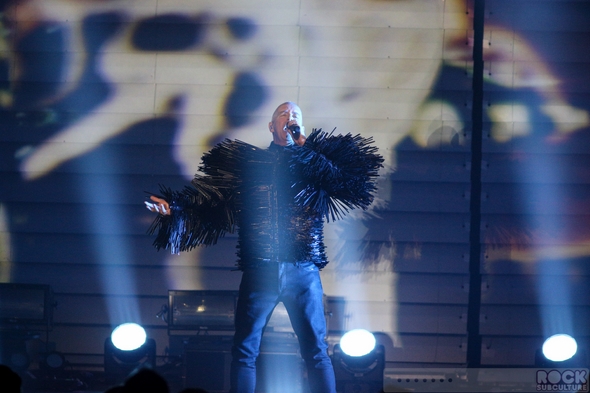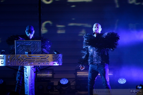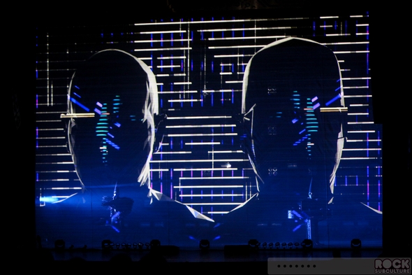 I had really high expectations for this, the latest Pet Shop Boys tour… yet somehow, as I sit down to write my thoughts about their show in San Diego at the Copely Symphony Hall last night, I am left a bit speechless… Not because I have nothing to say about it, but because I have this swirling flood of thoughts in my mind, and can’t seem to form a coherent approach to the whole thing. Maybe it was the overpowering strobe lights that disrupted the circuitry in my brain. Maybe it’s because they put on one of the most brilliant shows of the year. The cover of the tour program reads, “TURN IT ON”. Not a mere concert, it was a full blown, avant-garde stage production of the highest order, with credit also due to Stuart Price with his music production and programming, Creative Director/Designer Es Devlin and Stage Director/Choreographer Lynne Page, the two colorful dancers (Merry Holden and Tom Herron) with their interesting costumes and stage presence, and many others behind the scenes. Just when you expect that they should have peaked by now, they keep blazing new paths in music and life. Real artists, they create new work (in the studio and on stage) with a palette featuring colors all their own. They obviously put a lot of thought into not just sharing their music (old and new, hits and deep cuts), but creating a captivating and memorable experience. Though the visuals were mind blowing, the arrangements were amazing, Neil’s voice sounded better than ever, and the sound quality within the venue was superb.