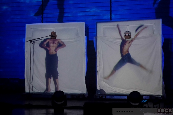I think my favorite bit of the night, in terms of the on stage theatrics, was for “Love Etc.”, wherein Neil and Chris were rolled out on what looked like separate beds set vertical, each tucked into their white sheets up to their necks. A stage hand set the mic in place for Neil, and the song unwound as twitchy, unworldly bodies were projected on the screens below their heads, making for a funny and quirky, cartoon-like version of the duo, though with “real” heads. Made me wonder if maybe they should make a special appearance at the Tate.