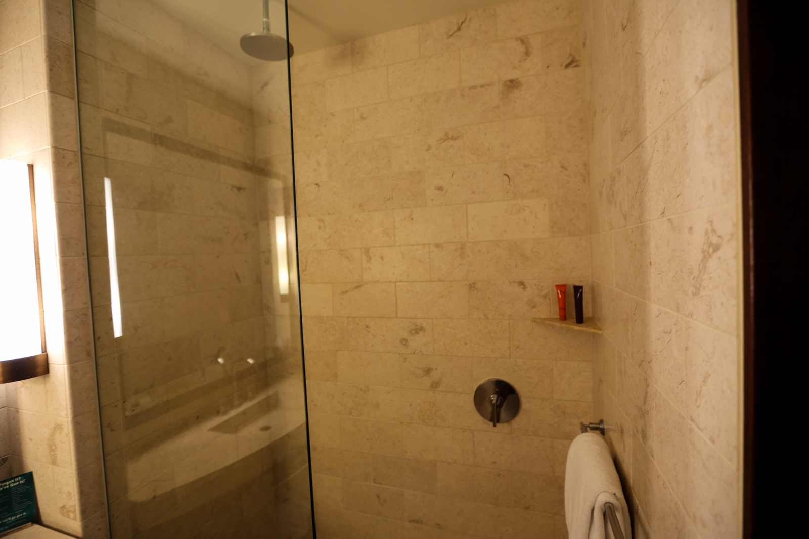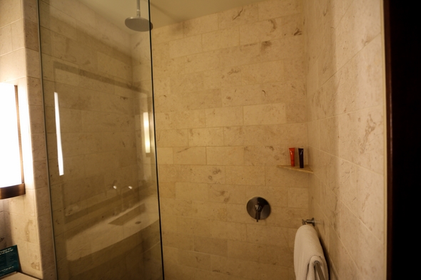 The bathroom was all tile and featured a standing stall shower.