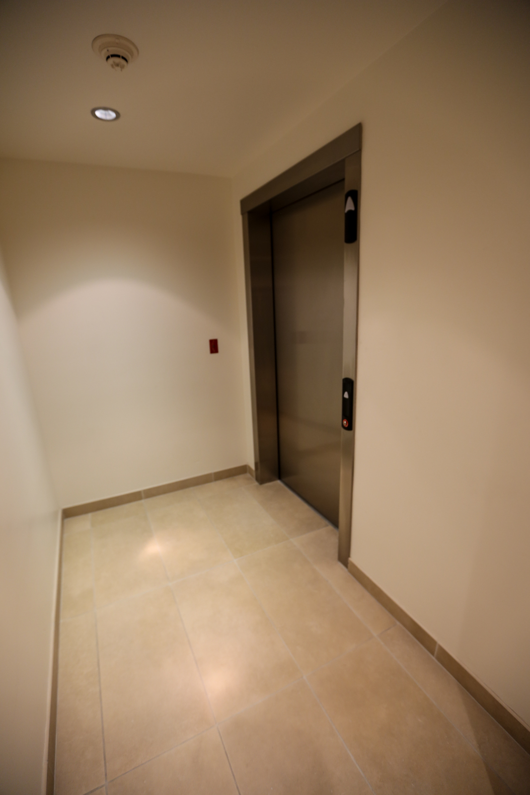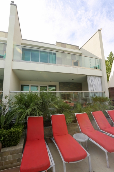 There are stairs leading up to the second floor, but an elevator as well… upstairs features the large bedroom, a huge bathroom with a jetted tub and stand up shower stall, and dual sinks. There is also a balcony outside, overlooking the public pool area.