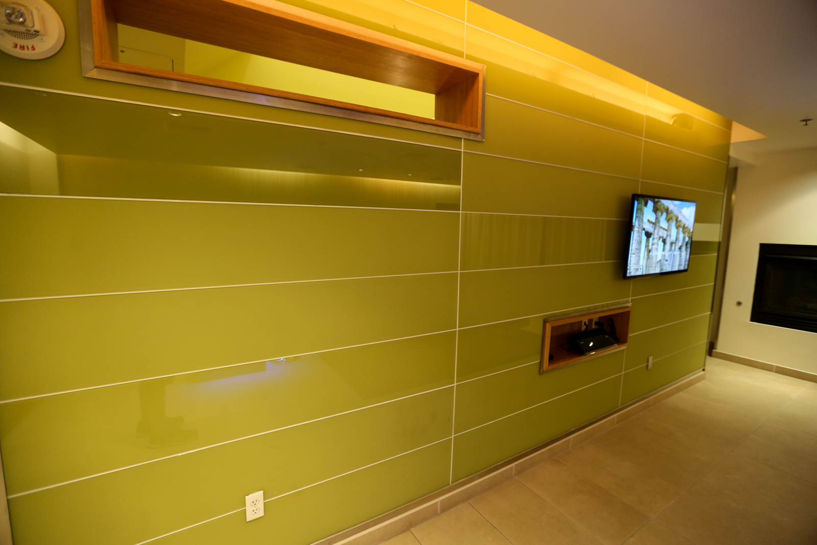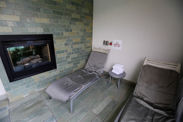 The bottom floor has a big open area with a bar, refrigerator, dishes and silverware, many flatscreen TVs, couches, and a lanai with its own spa outside, with a fireplace that faces inside and outside. Definitely designed for entertaining.