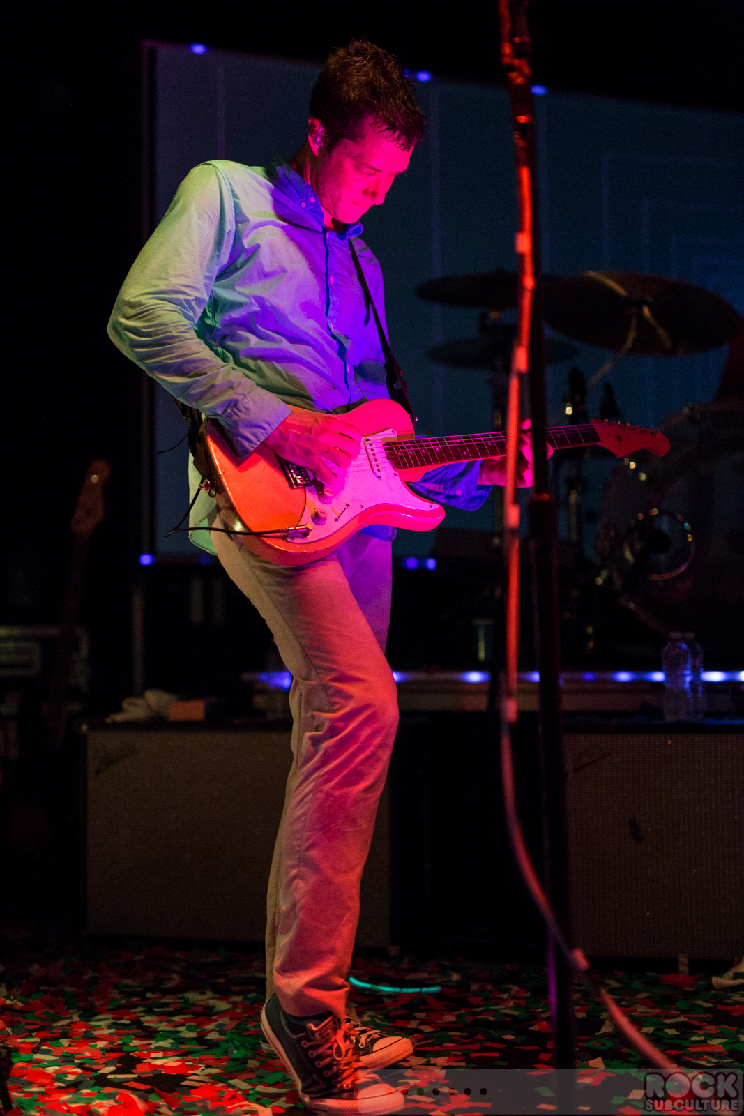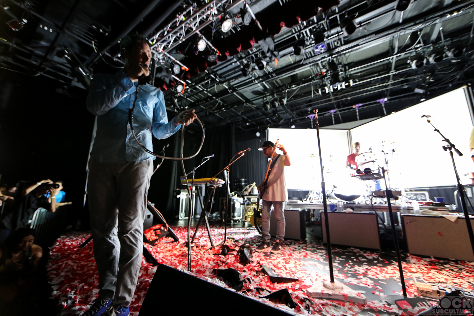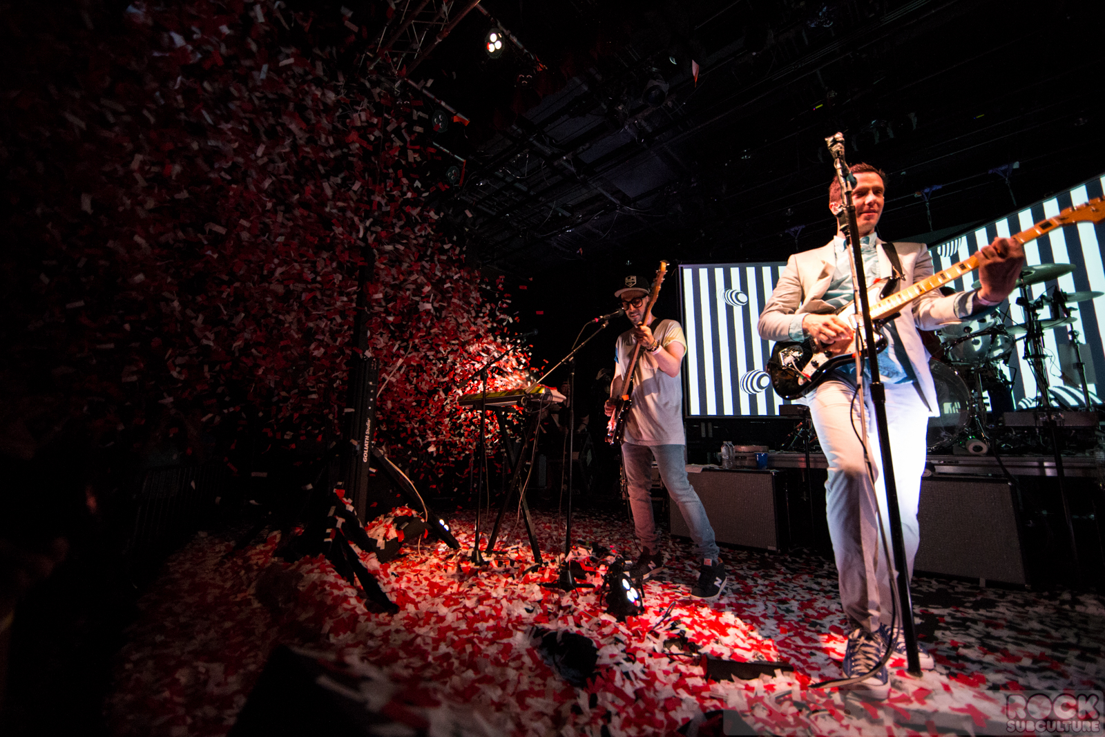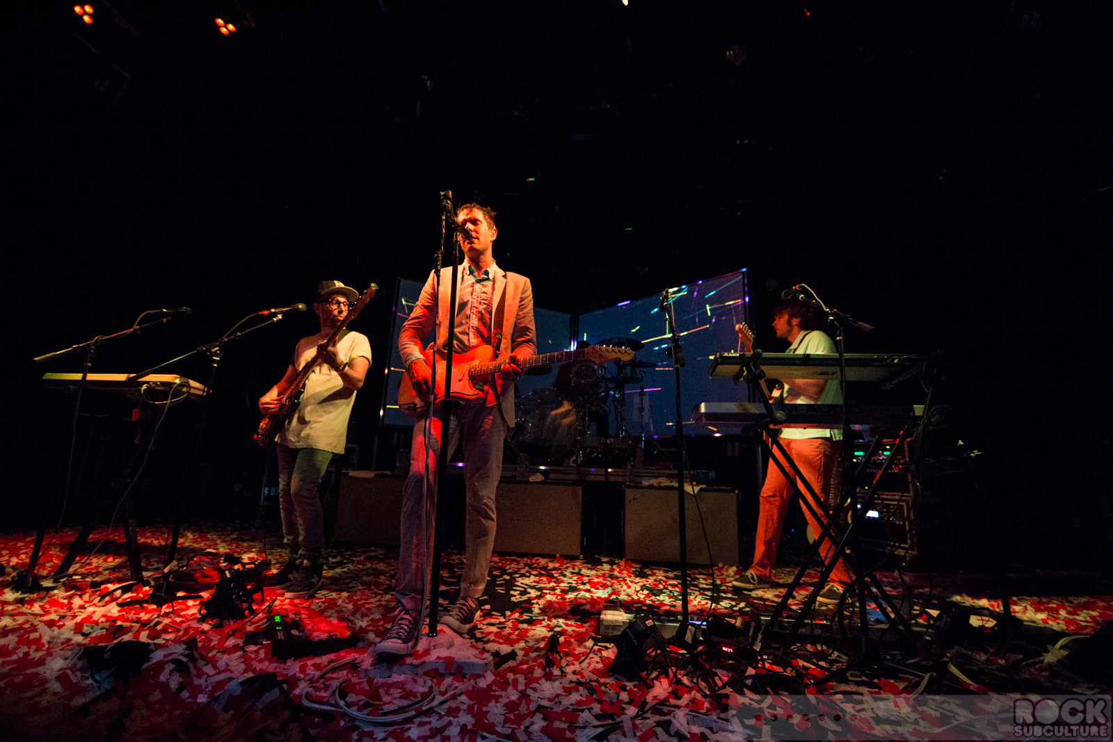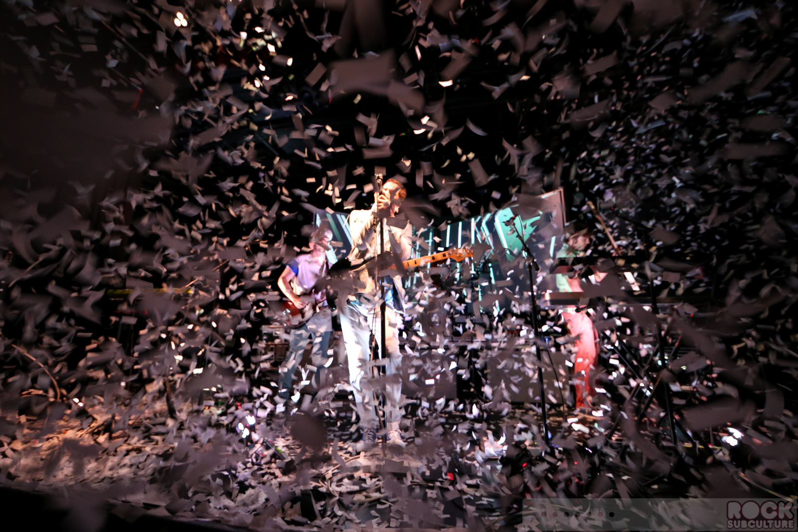“But the problem is, it’s a piece of shit… so things like the little thing, that goes on here… the plastic thing that keeps you from slicing your fucking finger in half? That fell off in the middle of that song…” A post song, play by play recap by Damien Kulash of OK Go, talking about how part of his favorite guitar (purchased at a pawn shop in New Orleans) fell off and how he waited for the right break in singing to pick it up amid a floor covered in confetti… and for some reason decided to put it in his mouth for the rest of the song. Quirky, funny, and entertaining… an OK Go show would probably be worth the price of admission even if they didn’t play any music at all, as the between-song banter was all quite amusing on its own. But they did put on an impressive showcase of music at Assembly Music Hall in Sacramento… kicking off their 2014 tour that culminates in the release of Hungry Ghosts, their fourth studio album in October.