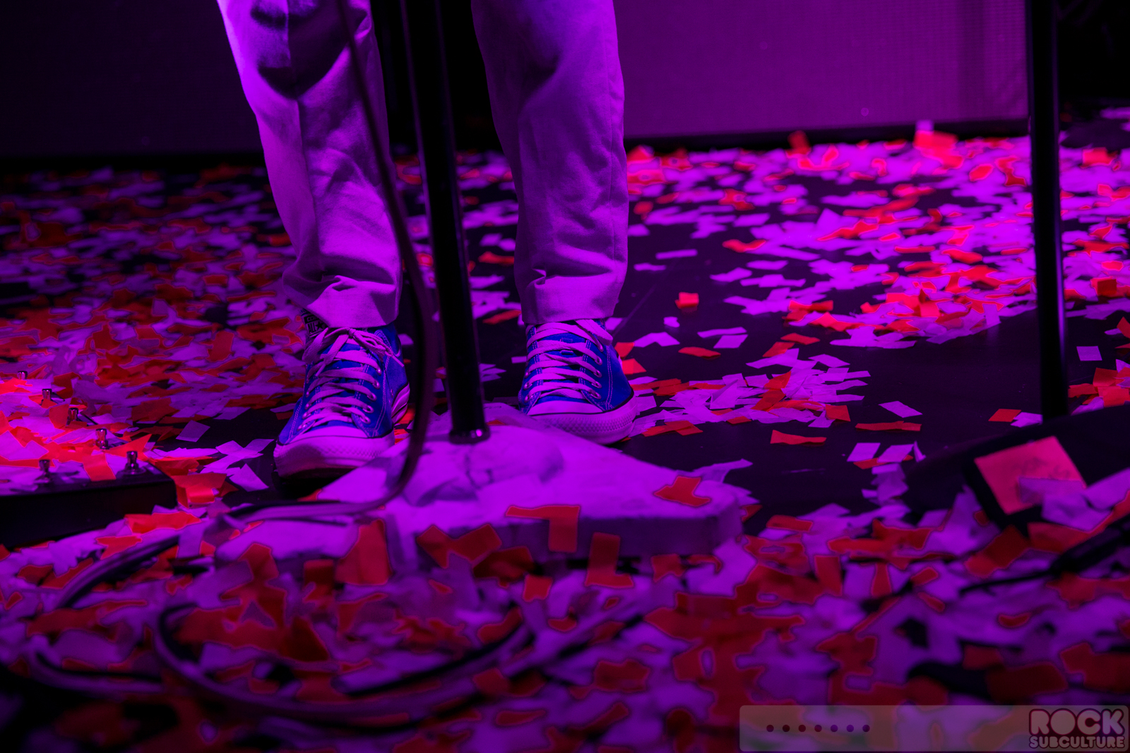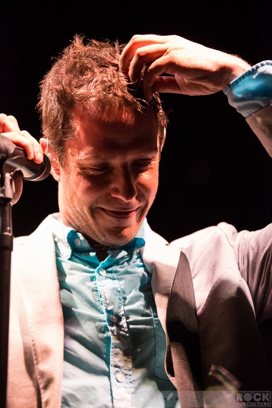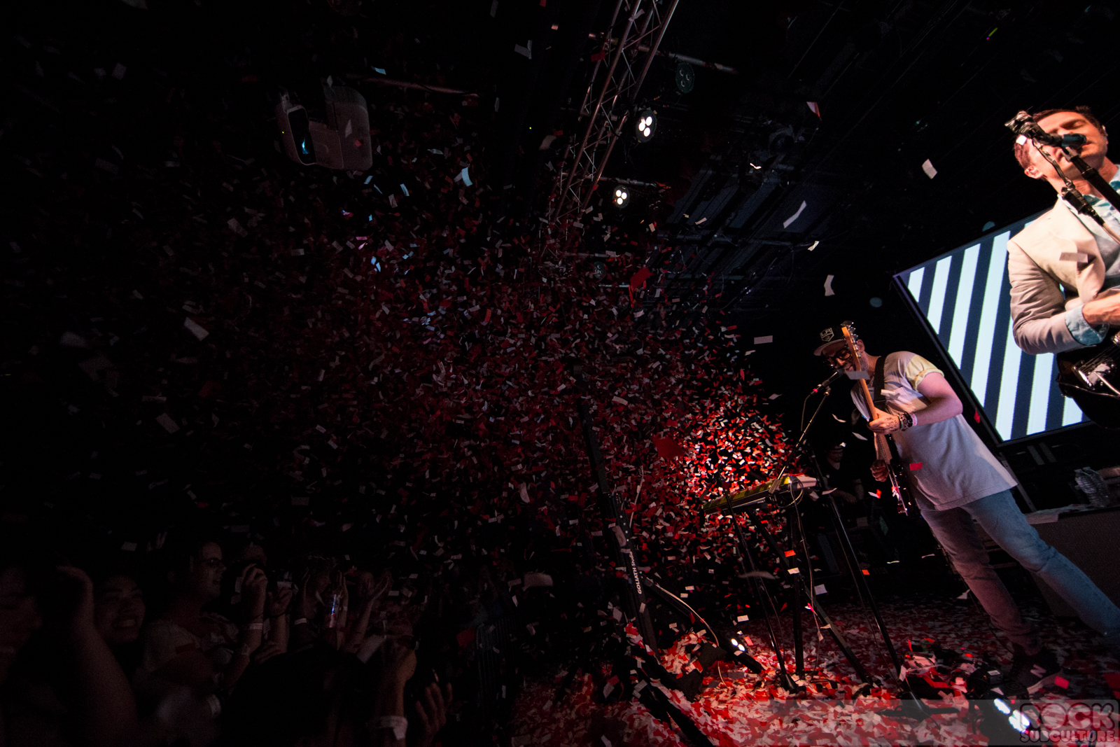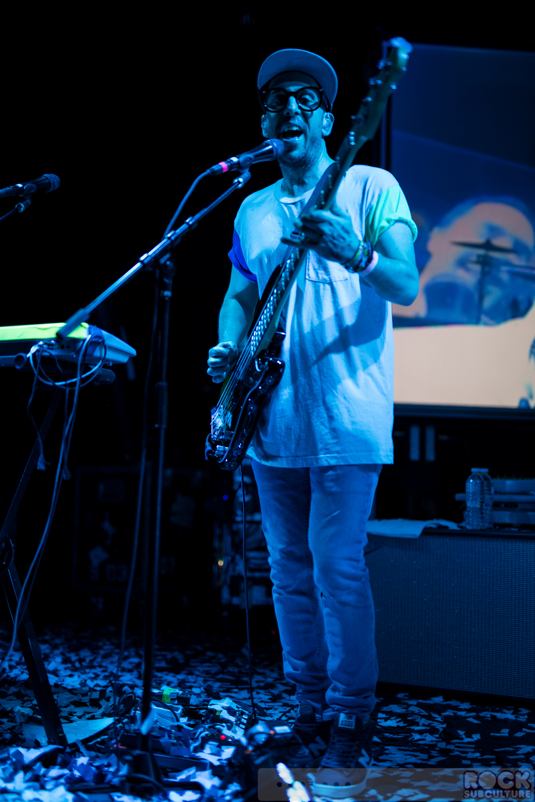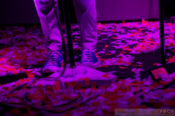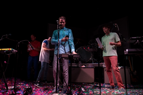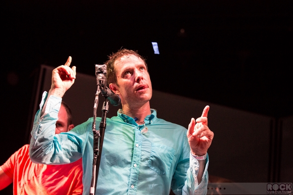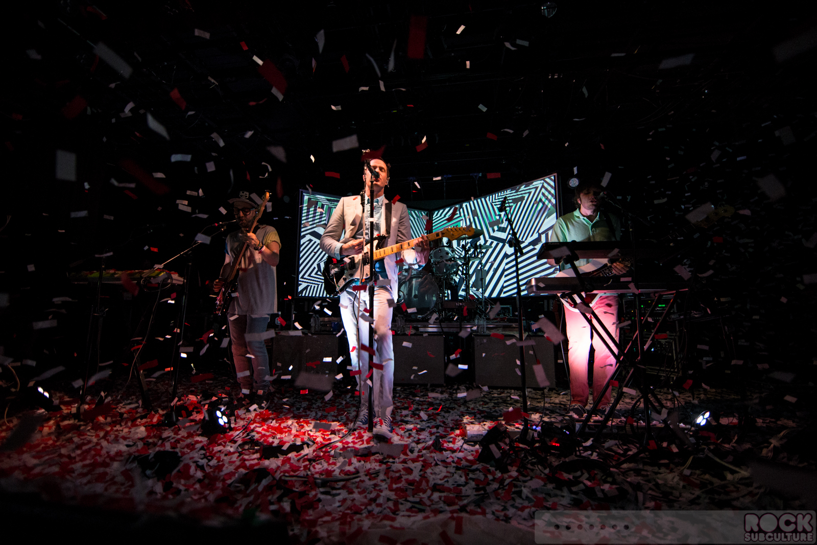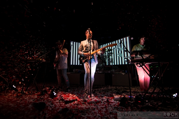 “But the problem is, it’s a piece of shit… so things like the little thing, that goes on here… the plastic thing that keeps you from slicing your fucking finger in half? That fell off in the middle of that song…” A post song, play by play recap by Damien Kulash of OK Go, talking about how part of his favorite guitar (purchased at a pawn shop in New Orleans) fell off and how he waited for the right break in singing to pick it up amid a floor covered in confetti… and for some reason decided to put it in his mouth for the rest of the song. Quirky, funny, and entertaining… an OK Go show would probably be worth the price of admission even if they didn’t play any music at all, as the between-song banter was all quite amusing on its own. But they did put on an impressive showcase of music at Assembly Music Hall in Sacramento… kicking off their 2014 tour that culminates in the release of Hungry Ghosts, their fourth studio album in October.