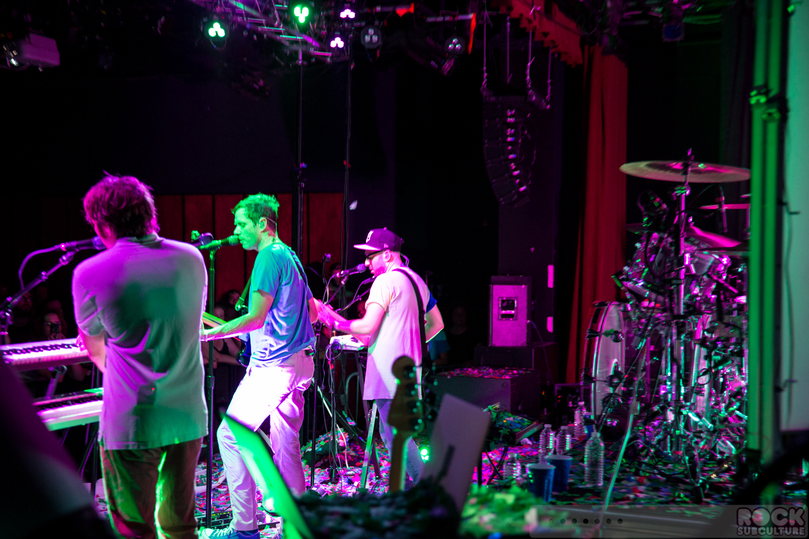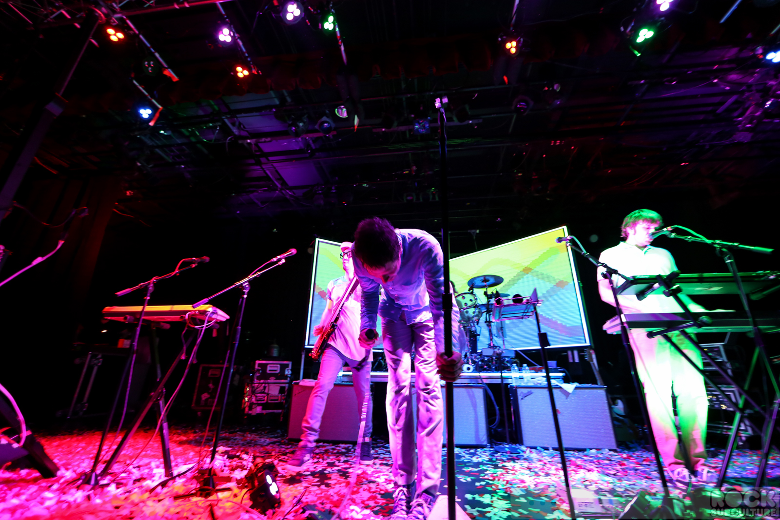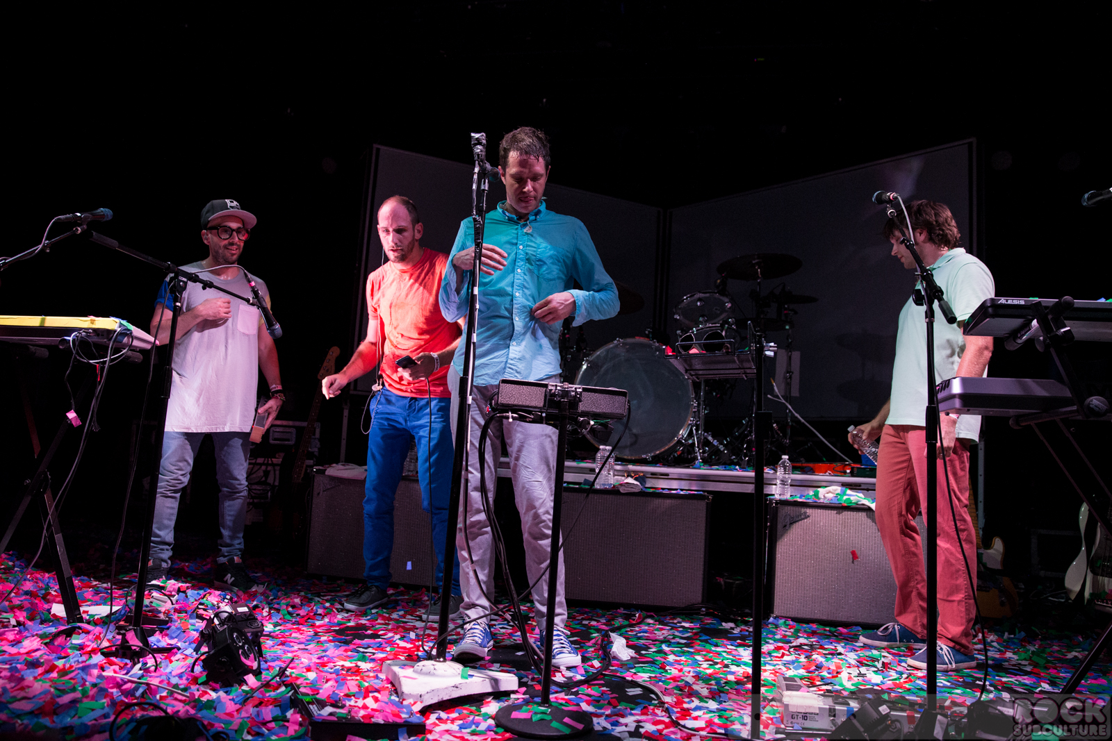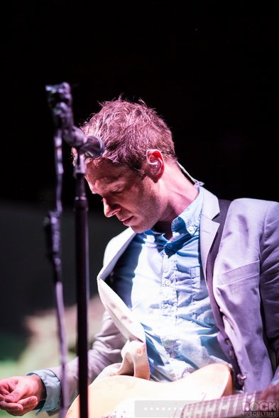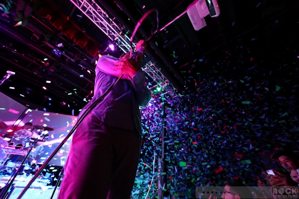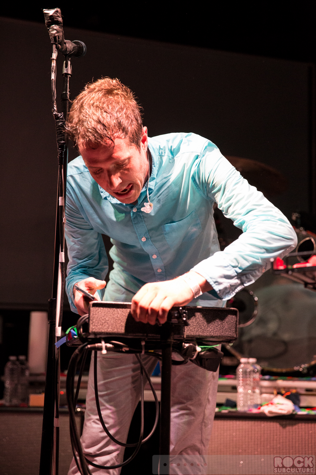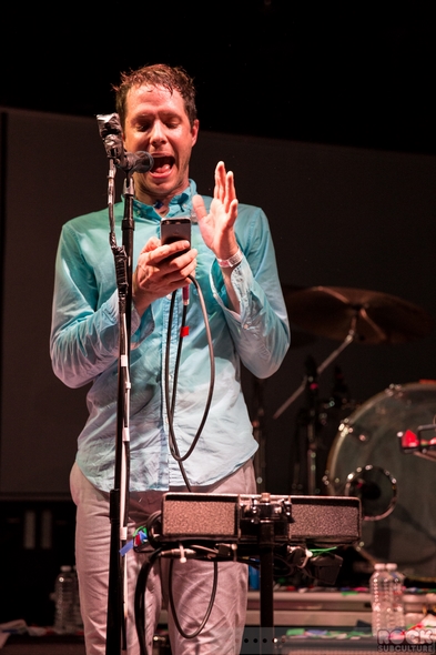 “But the problem is, it’s a piece of shit… so things like the little thing, that goes on here… the plastic thing that keeps you from slicing your fucking finger in half? That fell off in the middle of that song…” A post song, play by play recap by Damien Kulash of OK Go, talking about how part of his favorite guitar (purchased at a pawn shop in New Orleans) fell off and how he waited for the right break in singing to pick it up amid a floor covered in confetti… and for some reason decided to put it in his mouth for the rest of the song. Quirky, funny, and entertaining… an OK Go show would probably be worth the price of admission even if they didn’t play any music at all, as the between-song banter was all quite amusing on its own. But they did put on an impressive showcase of music at Assembly Music Hall in Sacramento… kicking off their 2014 tour that culminates in the release of Hungry Ghosts, their fourth studio album in October.