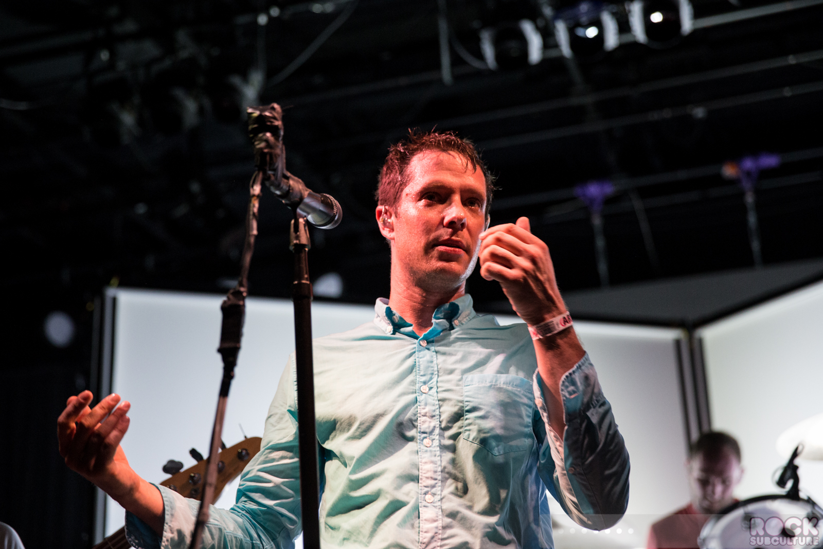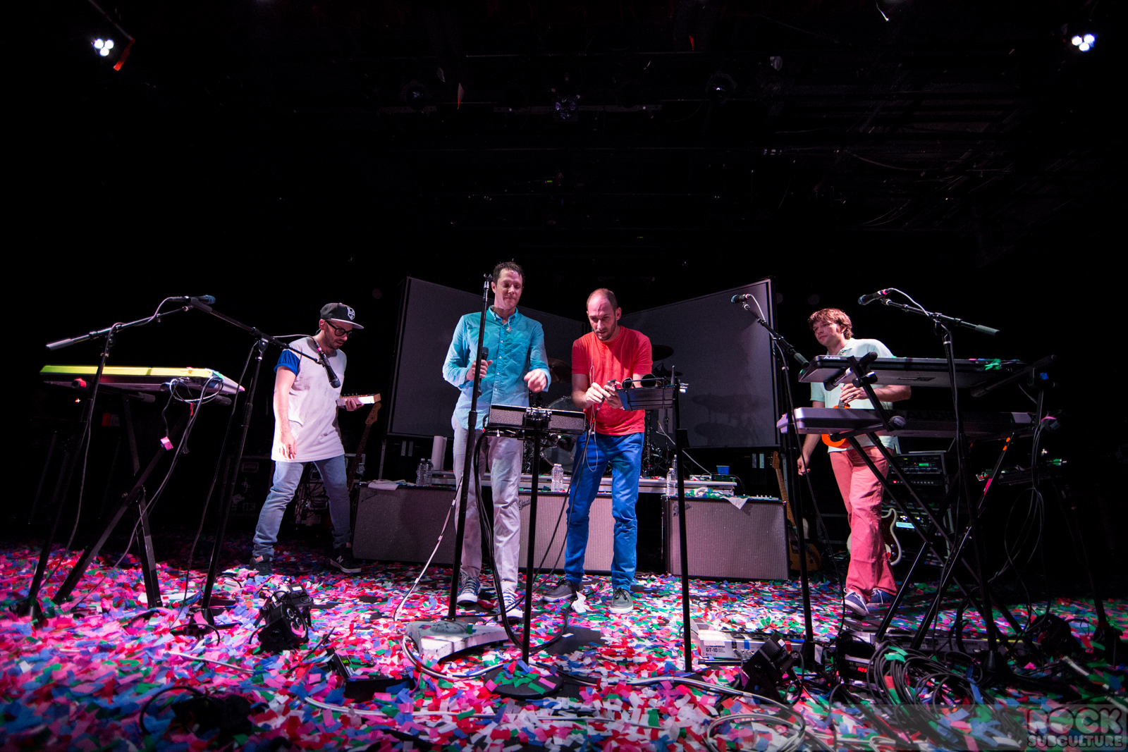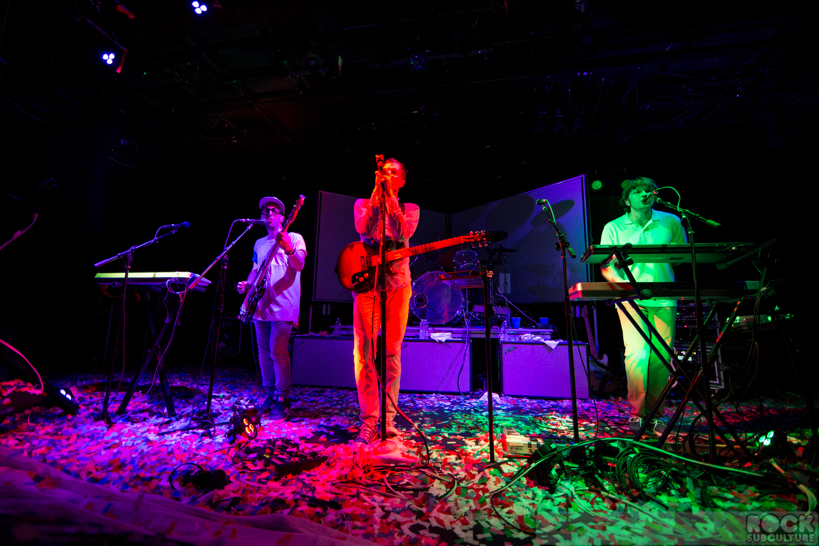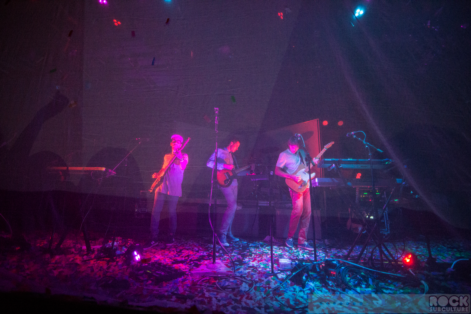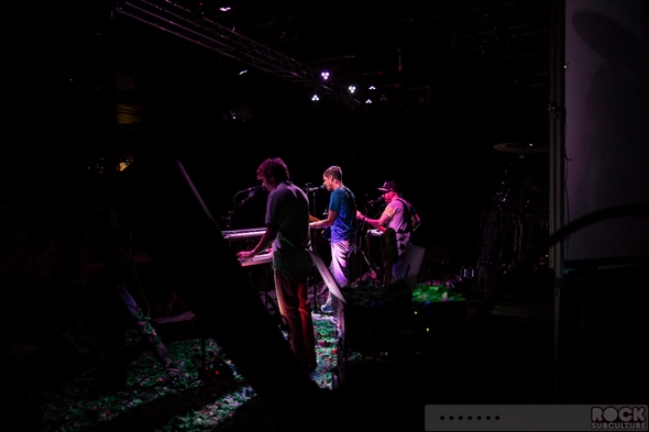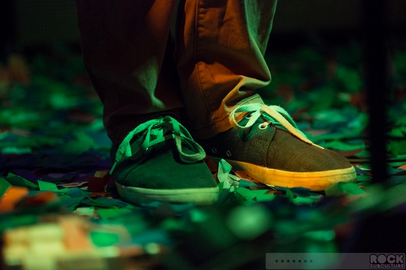 “But the problem is, it’s a piece of shit… so things like the little thing, that goes on here… the plastic thing that keeps you from slicing your fucking finger in half? That fell off in the middle of that song…” A post song, play by play recap by Damien Kulash of OK Go, talking about how part of his favorite guitar (purchased at a pawn shop in New Orleans) fell off and how he waited for the right break in singing to pick it up amid a floor covered in confetti… and for some reason decided to put it in his mouth for the rest of the song. Quirky, funny, and entertaining… an OK Go show would probably be worth the price of admission even if they didn’t play any music at all, as the between-song banter was all quite amusing on its own. But they did put on an impressive showcase of music at Assembly Music Hall in Sacramento… kicking off their 2014 tour that culminates in the release of Hungry Ghosts, their fourth studio album in October.