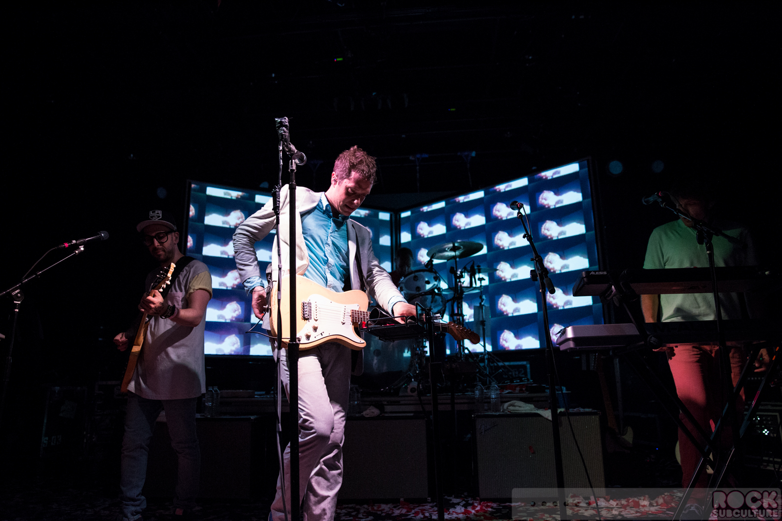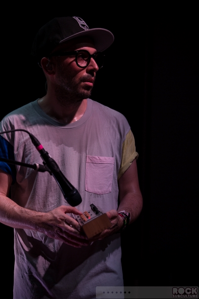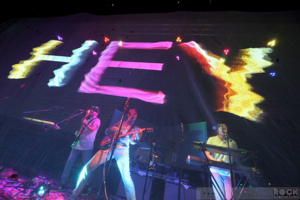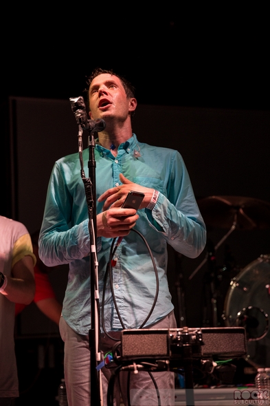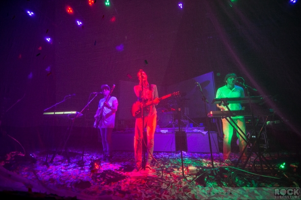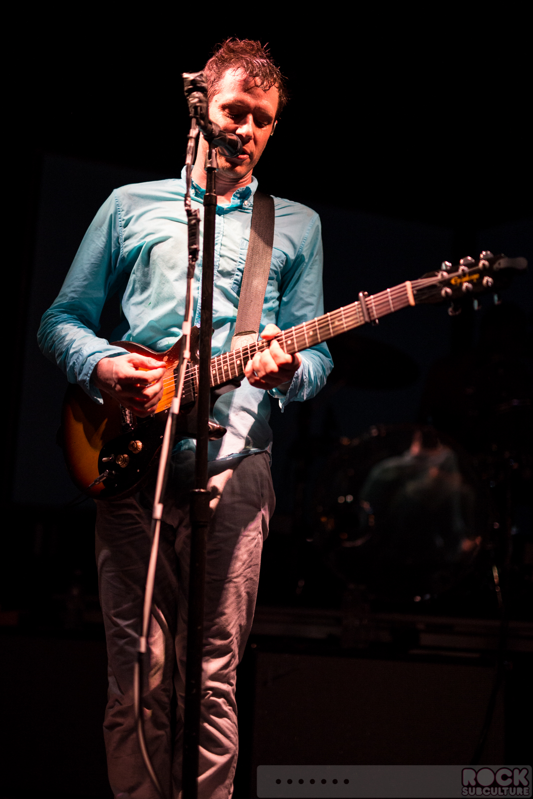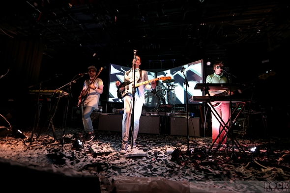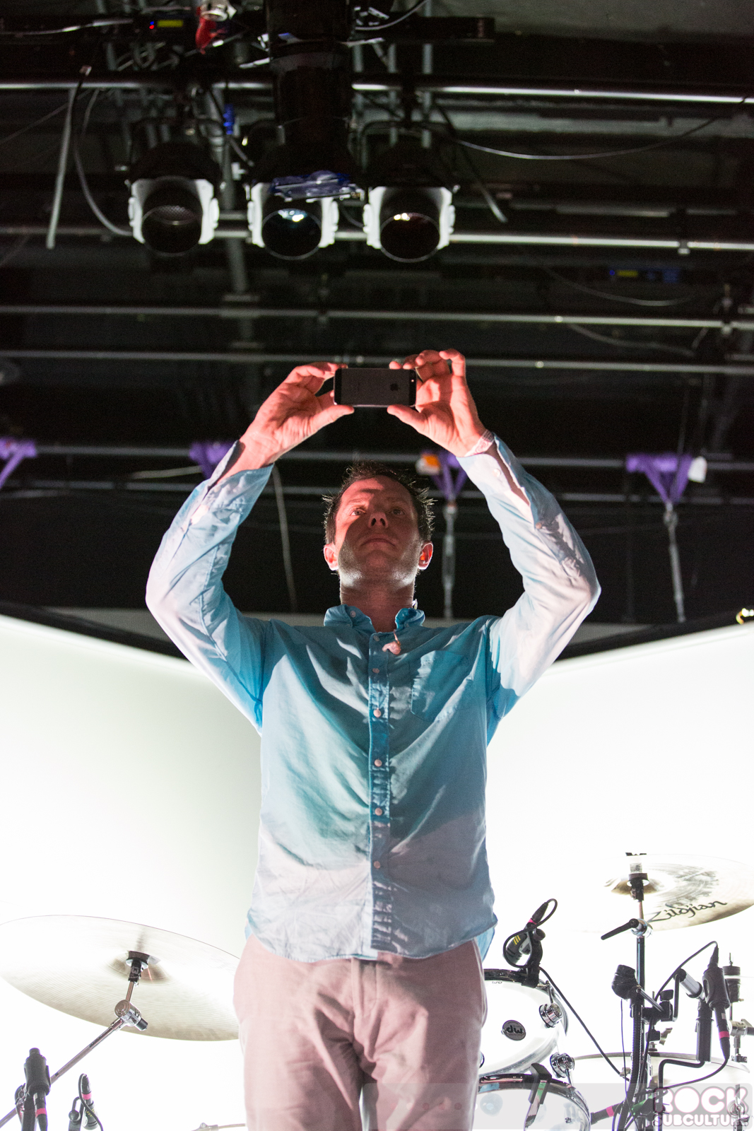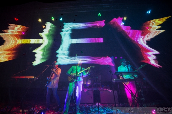 “But the problem is, it’s a piece of shit… so things like the little thing, that goes on here… the plastic thing that keeps you from slicing your fucking finger in half? That fell off in the middle of that song…” A post song, play by play recap by Damien Kulash of OK Go, talking about how part of his favorite guitar (purchased at a pawn shop in New Orleans) fell off and how he waited for the right break in singing to pick it up amid a floor covered in confetti… and for some reason decided to put it in his mouth for the rest of the song. Quirky, funny, and entertaining… an OK Go show would probably be worth the price of admission even if they didn’t play any music at all, as the between-song banter was all quite amusing on its own. But they did put on an impressive showcase of music at Assembly Music Hall in Sacramento… kicking off their 2014 tour that culminates in the release of Hungry Ghosts, their fourth studio album in October.