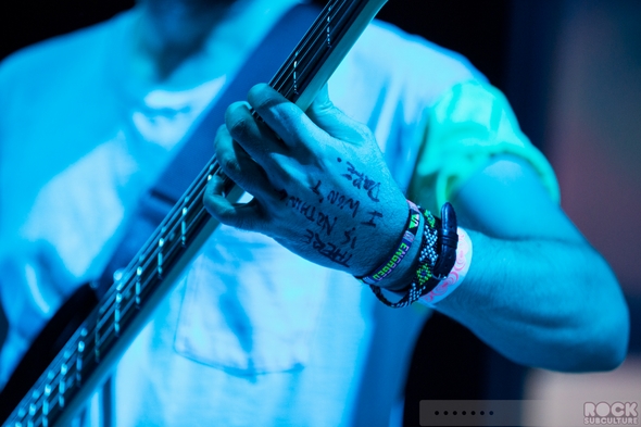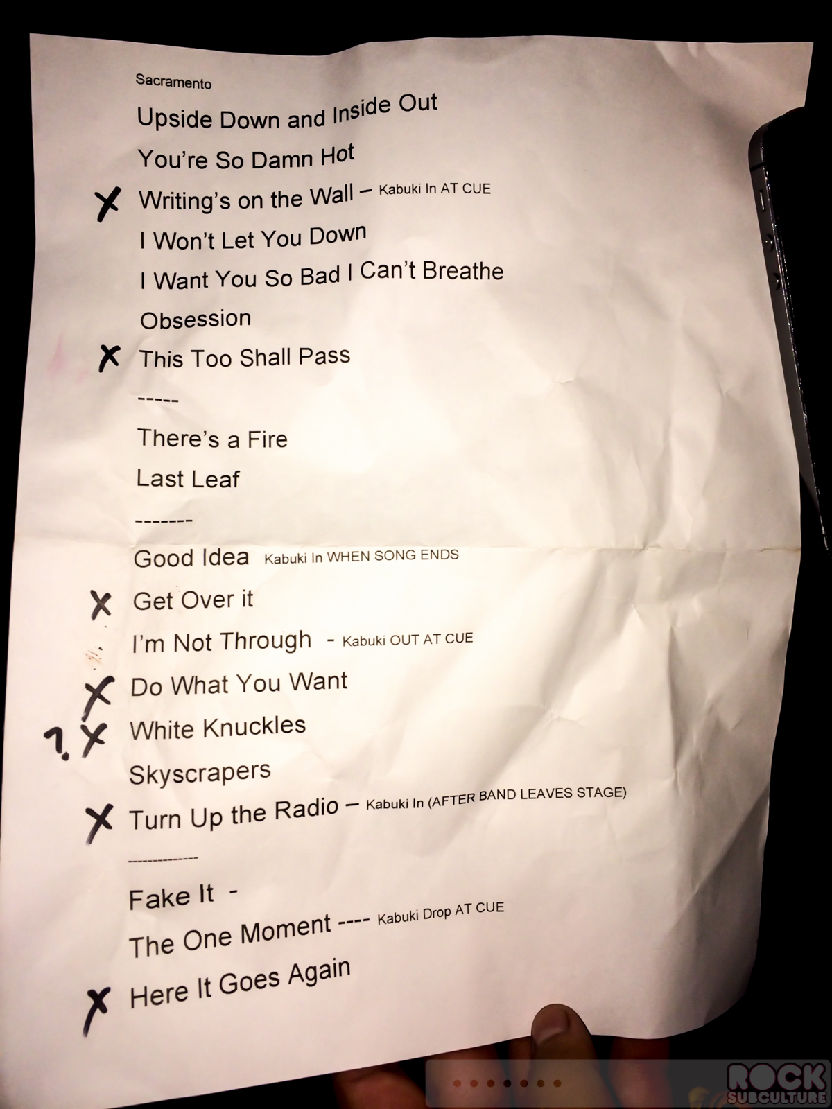 With the third song, the white scrim dropped to reveal the band in full, naked light and they kicked into their latest, “The Writing’s on the Wall” (which has a brilliant music video). This was also the first of many blasts of graffiti across the stage and into the audience (see photo of set list below for which songs feature this effect).