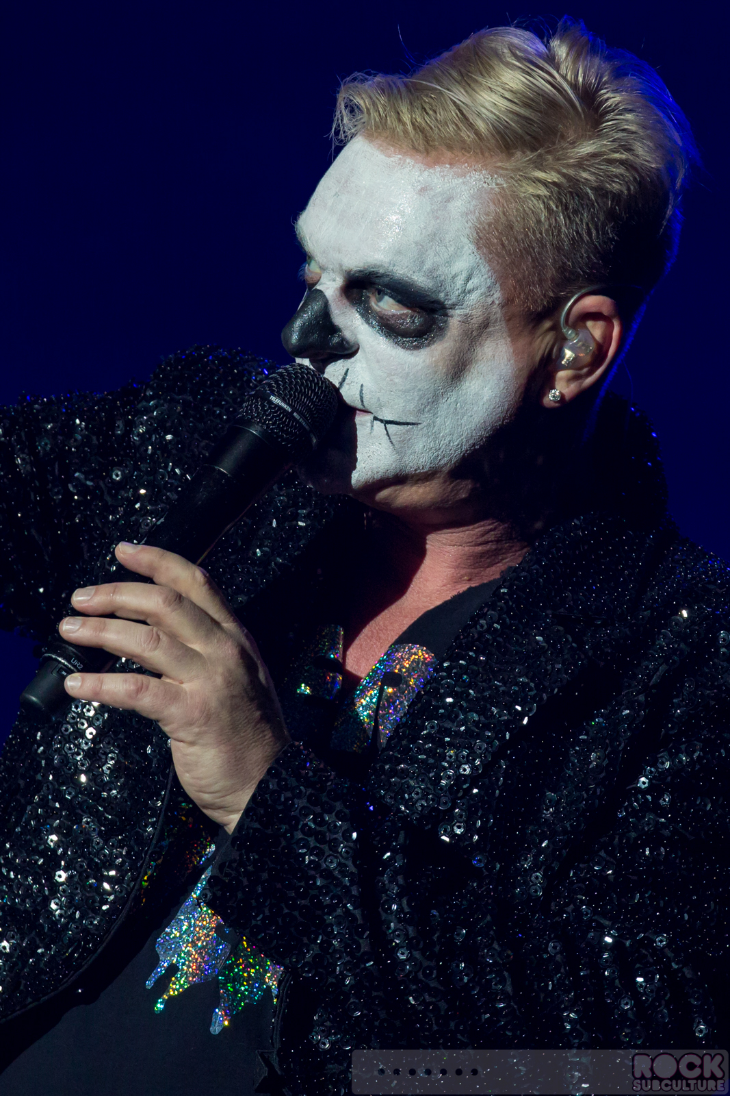 “Halloween is so brilliant though, isn’t it? ‘Cause everyone can dress up; be what they want to do… nobody is like judging you at all for how you look or anything or what you’re doing or who you’re with, blah, blah, blah …” Andy Bell of Erasure on Halloween at the Pearl Concert Theater at Palms Casino Resort in Las Vegas. Certainly an interesting combination of band, date, and city to be sure. As the more extroverted of the duo, Andy came dressed in a sort of skeleton costume with accompanying face paint that has some resemblance to the cover art of their latest album; Vince Clarke, set back from the front of the stage and back to one corner, I don’t think said anything all night, and was dressed in more business-style attire (though he had the aforementioned art one his laptop lid. However the two contrasting personalities found one another for their journey into music that has gone on for nearly three decades, the magic worked in the beginning and continues to do so today. This was definitely an interesting (in a great way!) night on many levels. I had an opportunity to meet Vince Clarke and Andy Bell from Erasure via the special tickets made available through their PledgeMusic campaign for that newest latest album, The Violet Flame. The aptly named Violet Flame Tour included a number of those new songs mixed into the set, as well as a lot of their many, many hits and favorites. I got the sense that it was a different sort of show for this series of shows, and I’m happy that I got a chance to experience this new music and tour.