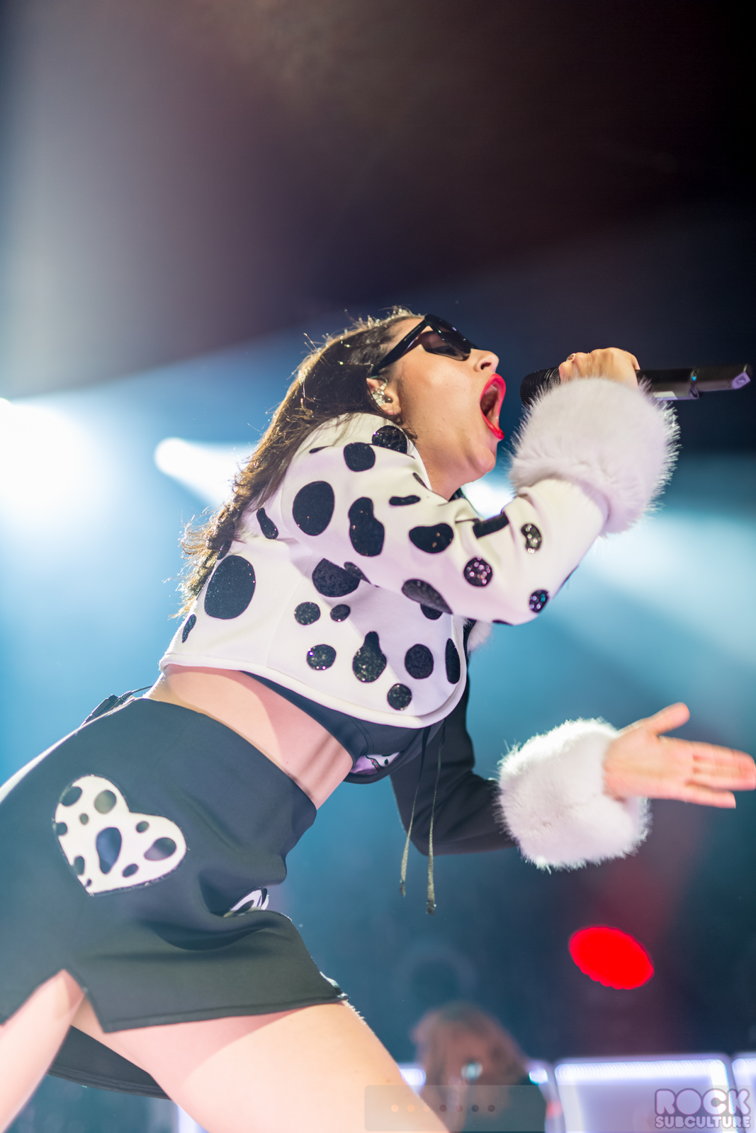 She’s definitely come a long way with regards to her onstage persona… When I first saw her perform in 2012, after taking off her top to reveal a sort of sports bra, she didn’t seem completely comfortable with her own sexuality. In contrast, at the Fox Theater on Thursday night, as curtain adorned with a middle finger covering the stage dropped, she came to the center front microphone beaming with confidence and wearing a short and revealing skirt.