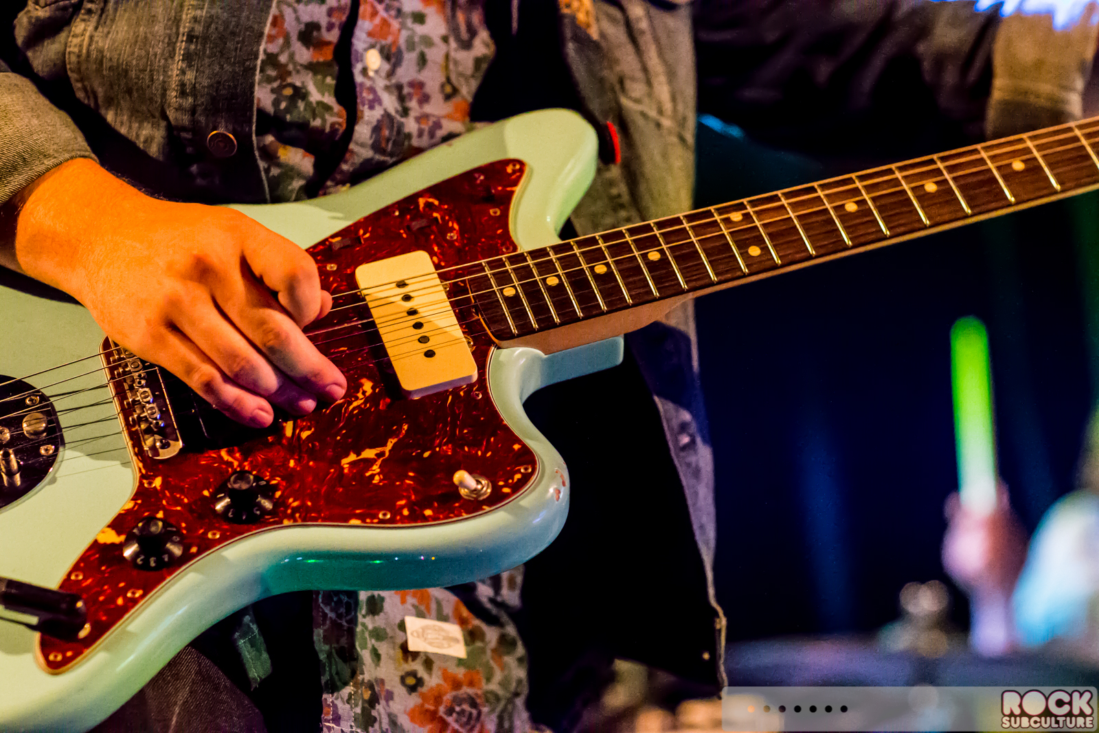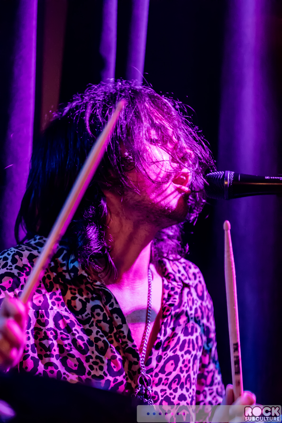 Joff Oddie on guitar has I think the most elaborate pedal and effects board I’ve ever seen – he’s like a one man Guitar Center. Not too flashy in his playing, he really knows how to get a vast variety of sounds from his guitar, and thus providing a foundation for all of the different styles and complex mixes of riffs, noise, and effects. He has evolved over the past year though, and does take some moments to show some swagger. Funny enough, a bit into the set, he actually came to the edge of the stage in front of me, and leaned right into me, pressing his forehead solidly against mine as he shredded on guitar (if you wonder when you go through the photos further below how I got so close). He’s becoming more interactive with the crowd, and maybe drawing some of the energy pushed toward the stage.