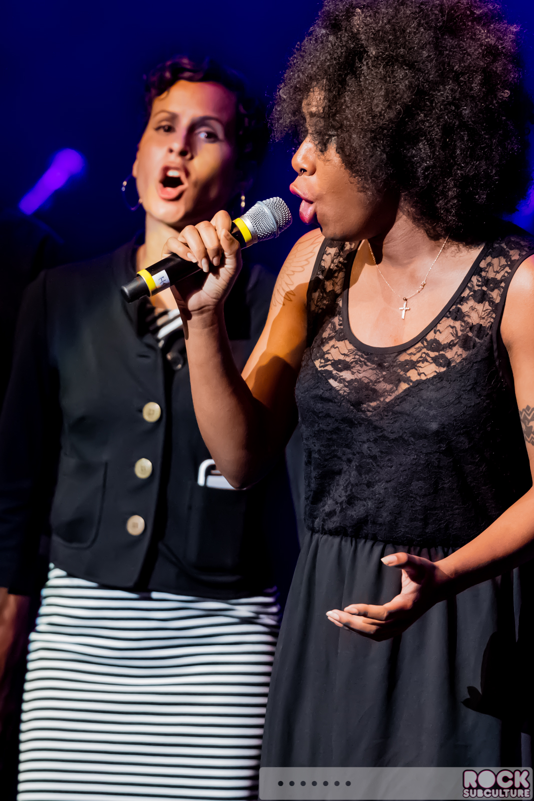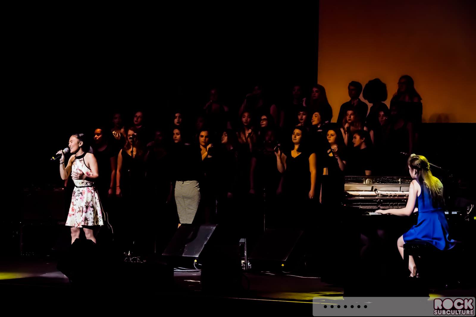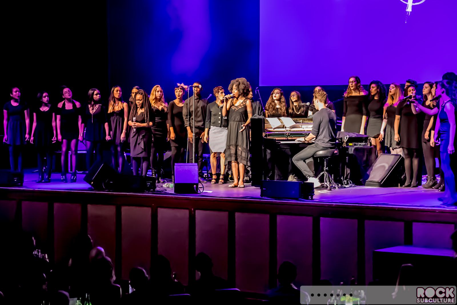 “I’m very happy to do these events when it means so much and it’s going to such a great cause… But I don’t really like doing things on my own. I’m from a band, and a band is a very special thing you have to protect, and its precious and the chemistry is everything. So, given that my “normal band” is on holiday… I thought, well I’d better form another band in San Francisco and Oakland, and so I have. And so the band I’ve formed is with the very special group of young singers and together, we’re called “The Raindrops” and here they come right now, the rest of The Raindrops…”