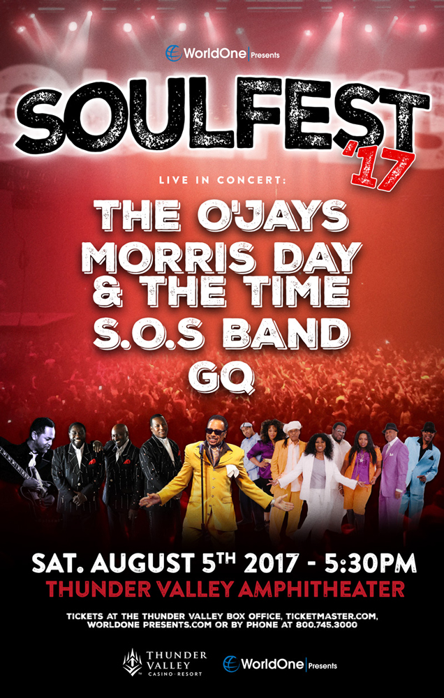 WorldOne Presents is bringing another fantastic line-up of 80s R&B icons to the Greater Sacramento Region at Thunder Valley Amphitheater on Saturday, August 5th.  Soulfest ’17 will feature The O’Jays, Morris Day & The Time, S.O.S. Band and GQ.