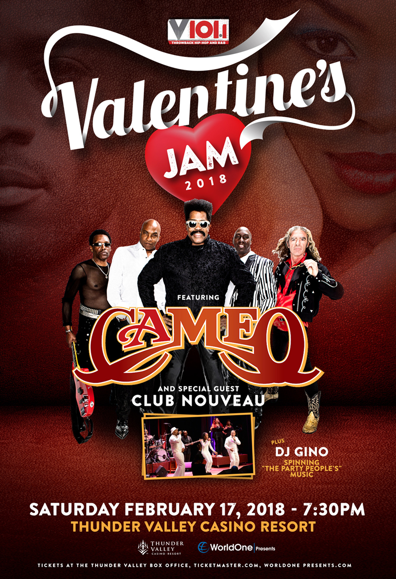 World One Presents & V101 are holding their annual event at Thunder Valley Casino Resort again this year with their “Valentine’s Soul Jam 2018”, with both Cameo and Club Nouveau performing.  They will take the stage inside the resort at Pano Hall.  You can still get tickets at Ticketmaster.